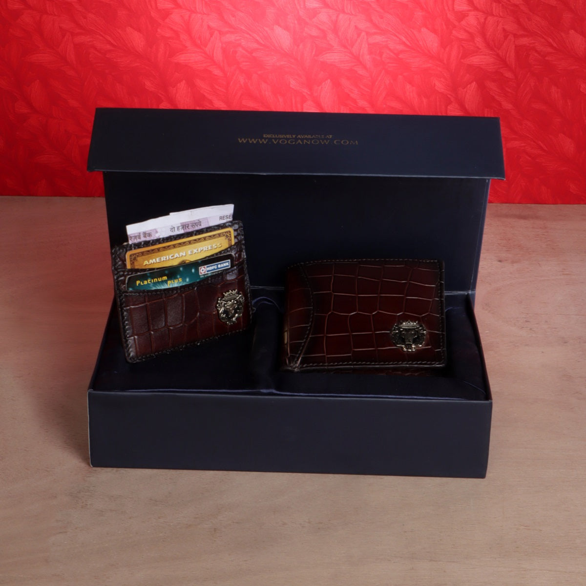 Combo of Dark Brown Croco Textured Leather Wallet and Card Holder with Metal Logo by Brune & Bareskin