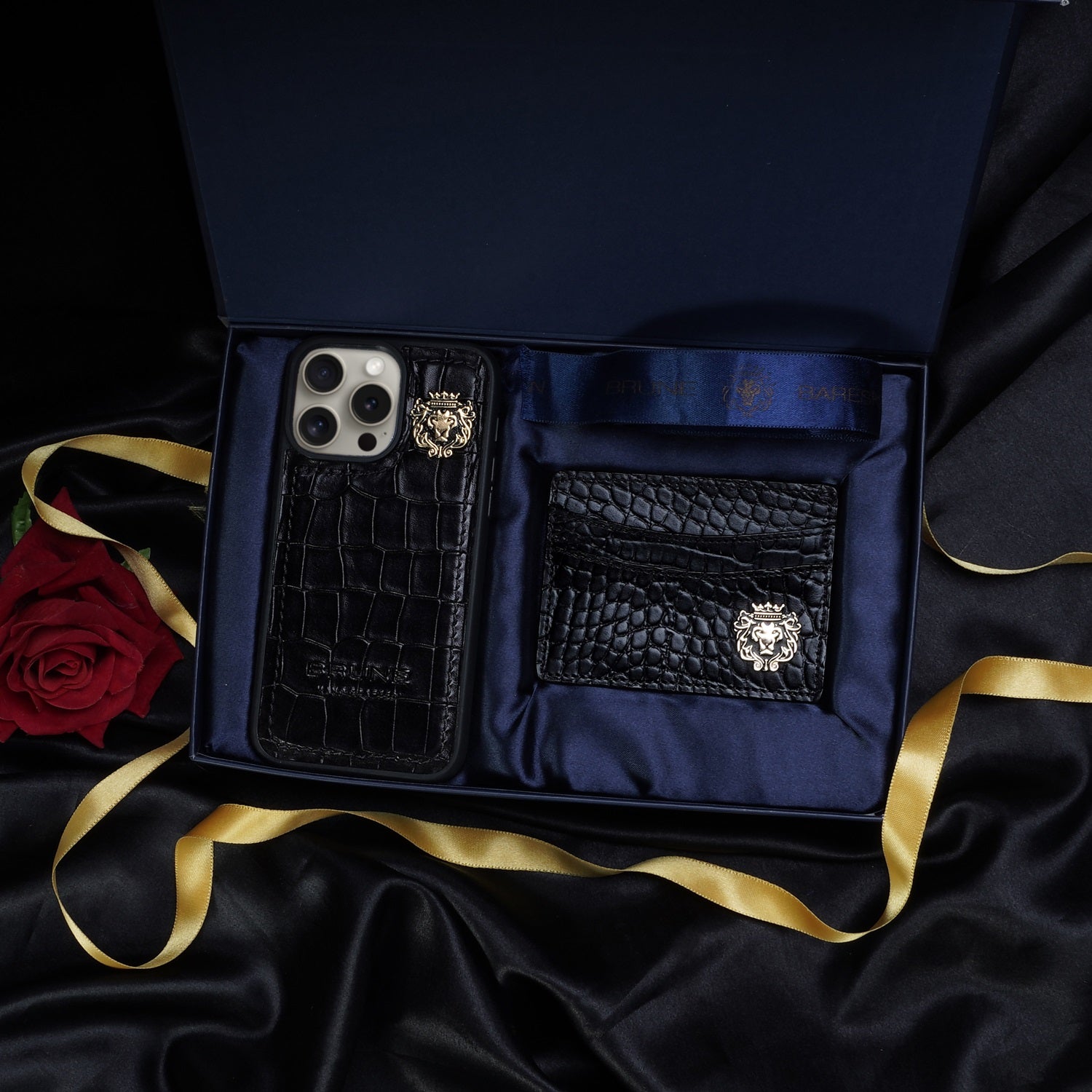 Experience the luxury of Brune & Bareskin's handcrafted leather products with this stylish combo of a mobile cover and card holder. Crafted from premium leather with a patina finish and a deep cut croco texture, this combo in luxurious black offers never-fading durability and style. The perfect accessory combo for the modern individual, this set includes a cover for any mobile model and a multi-slot card holder. Elevate your look with the signature metal lion brand logo.