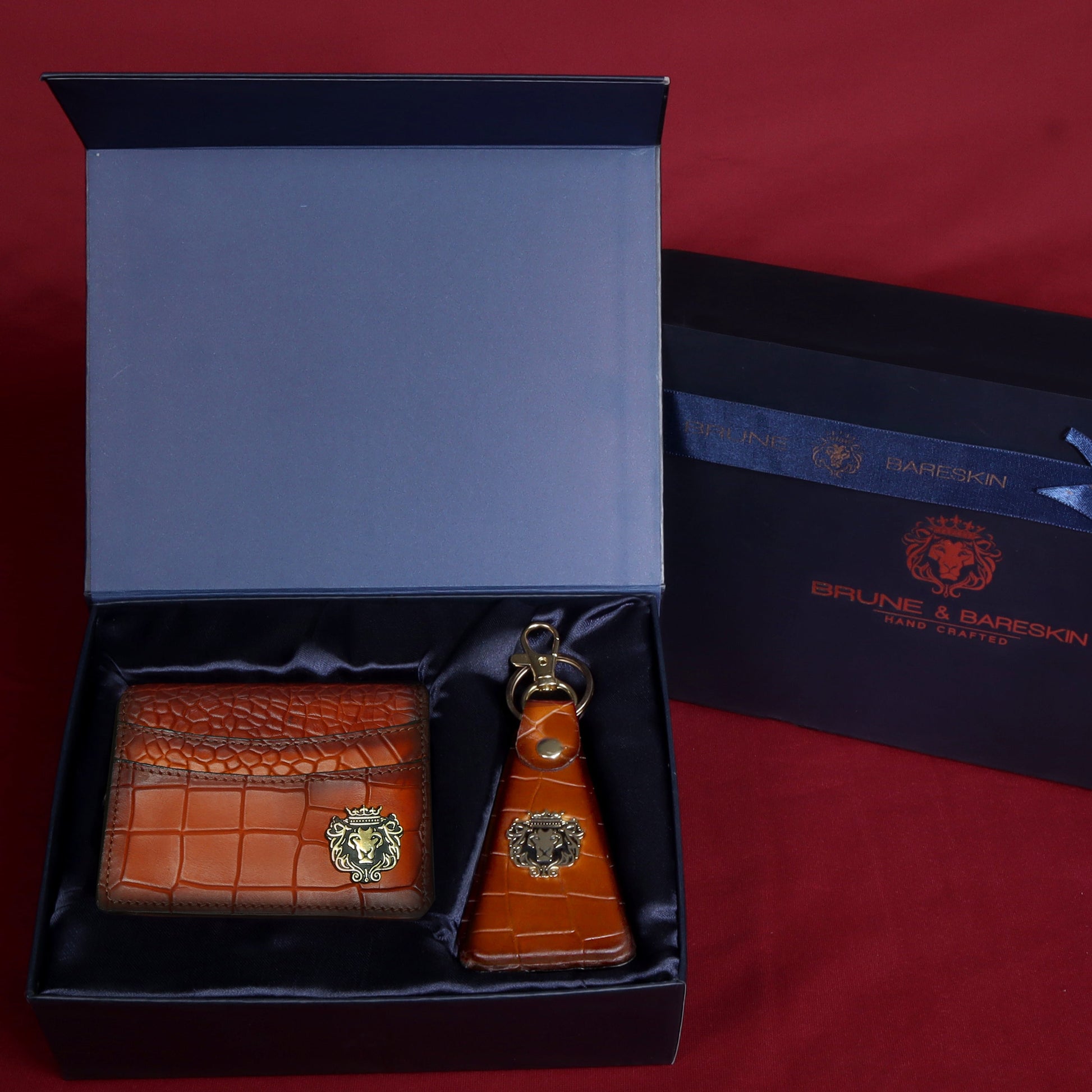 This combo of stylish tan and dark brown deep cut leather card holder and key-chain from Brune & Bareskin is the perfect gift for your gentleman or brother. Its patina finish and deep cut croco textured leather offer both style and practicality, while the signature metal lion brand logo adds a touch of sophistication. Handcrafted with high-quality, premium leather, this combo is secure and easy to carry. Give the gift of style and functionality with this ultimate gifting combo.