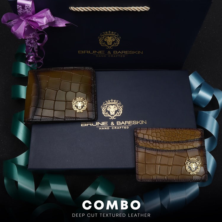 The latest olive croco textured leather Accessories are made to give you an extra style edge. The elegant combo you would love to have. This is a must have combination of products to carry. The perfect Men's Wallet and Card Holder will complete your look. The BRUNE & BARESKIN signature metal Lion brand logo increases the style quotient. The men wallet along and unisex card holder is a perfect pair of products to carry or gifting. The card holder can also be use by women, girls. You can customize this further in your favorite color and also add the name initials.