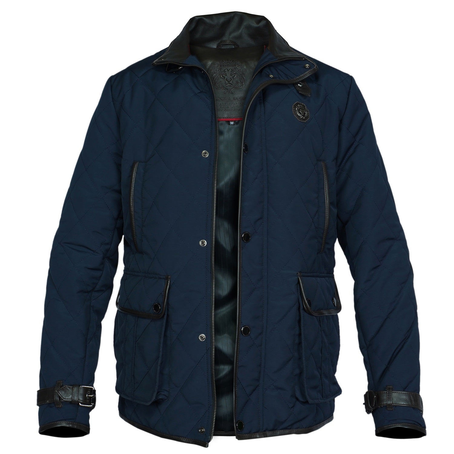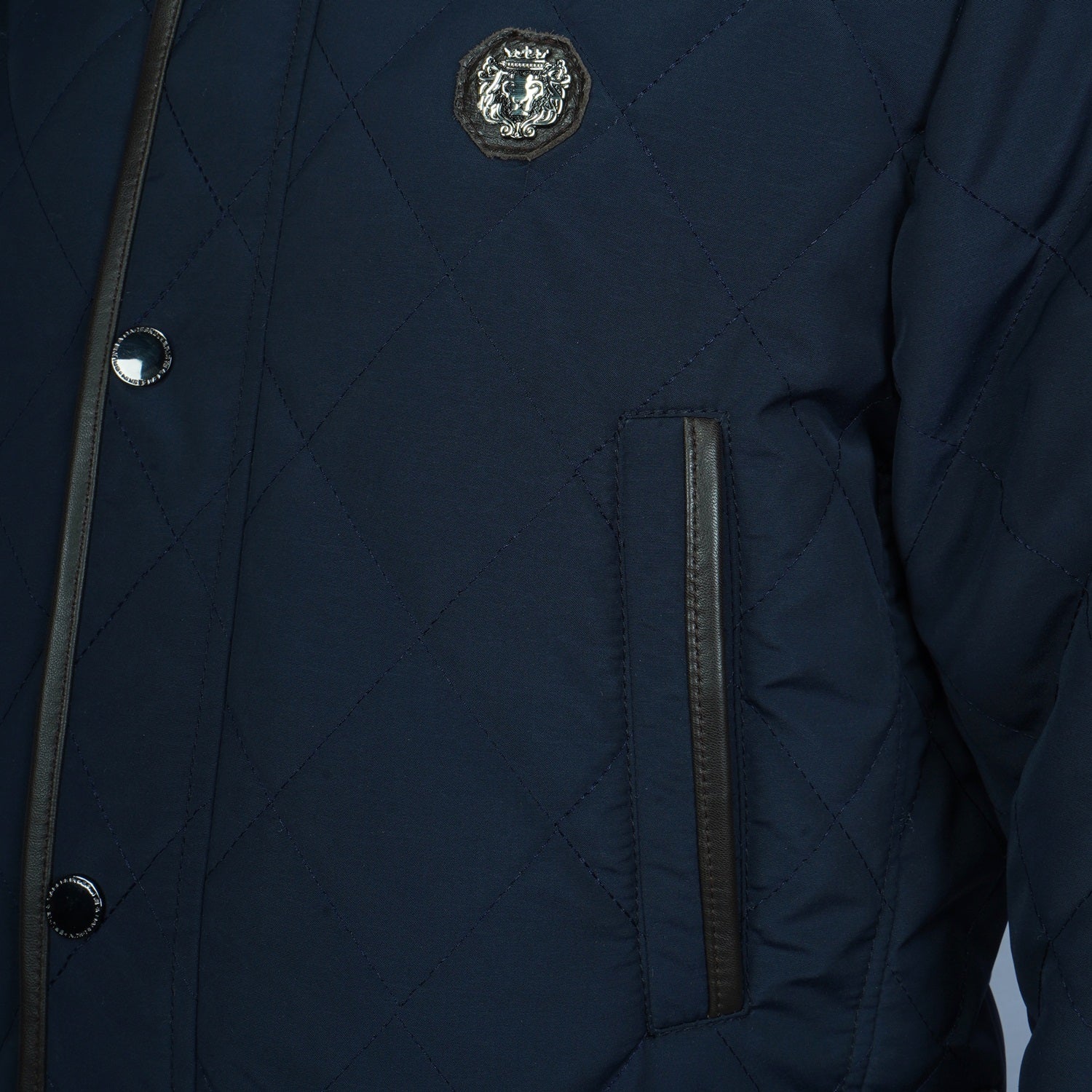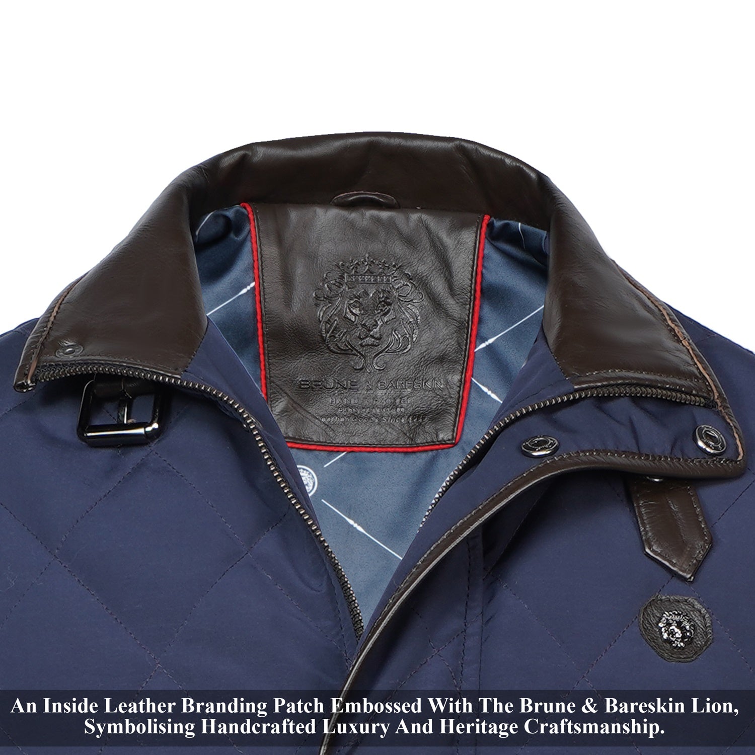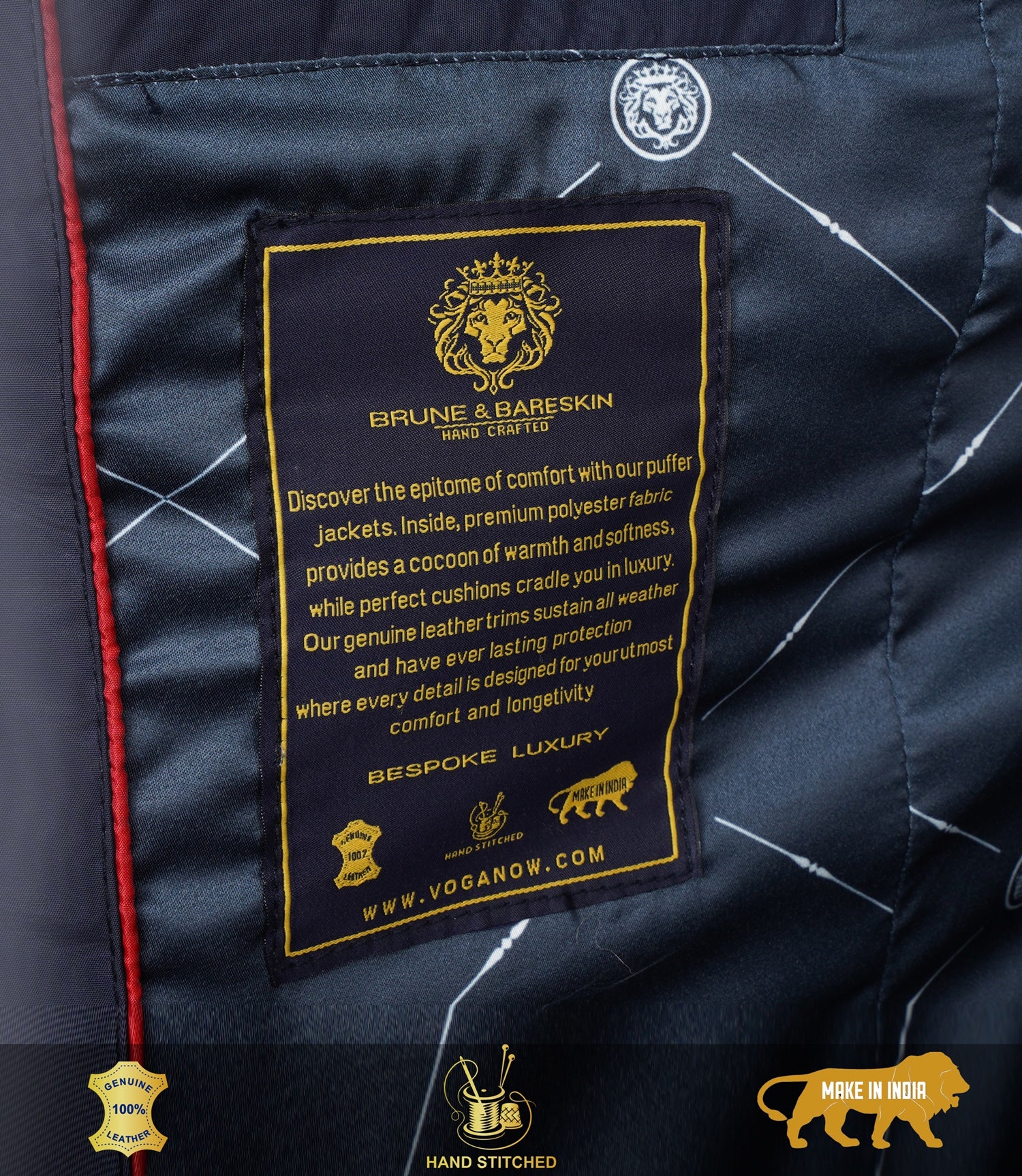 This men's Blue puffer coat jacket will keep you warm in style. Crafted from ultra-soft materials, the jacket has diamond stitching and contrasting dark brown leather trims at the neck, arms, and pockets. With its adjustable neck belt strap and multiple pockets, this jacket is the perfect blend of both functionality and luxury.