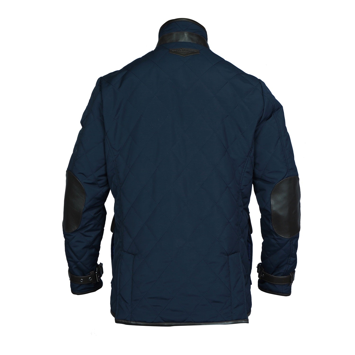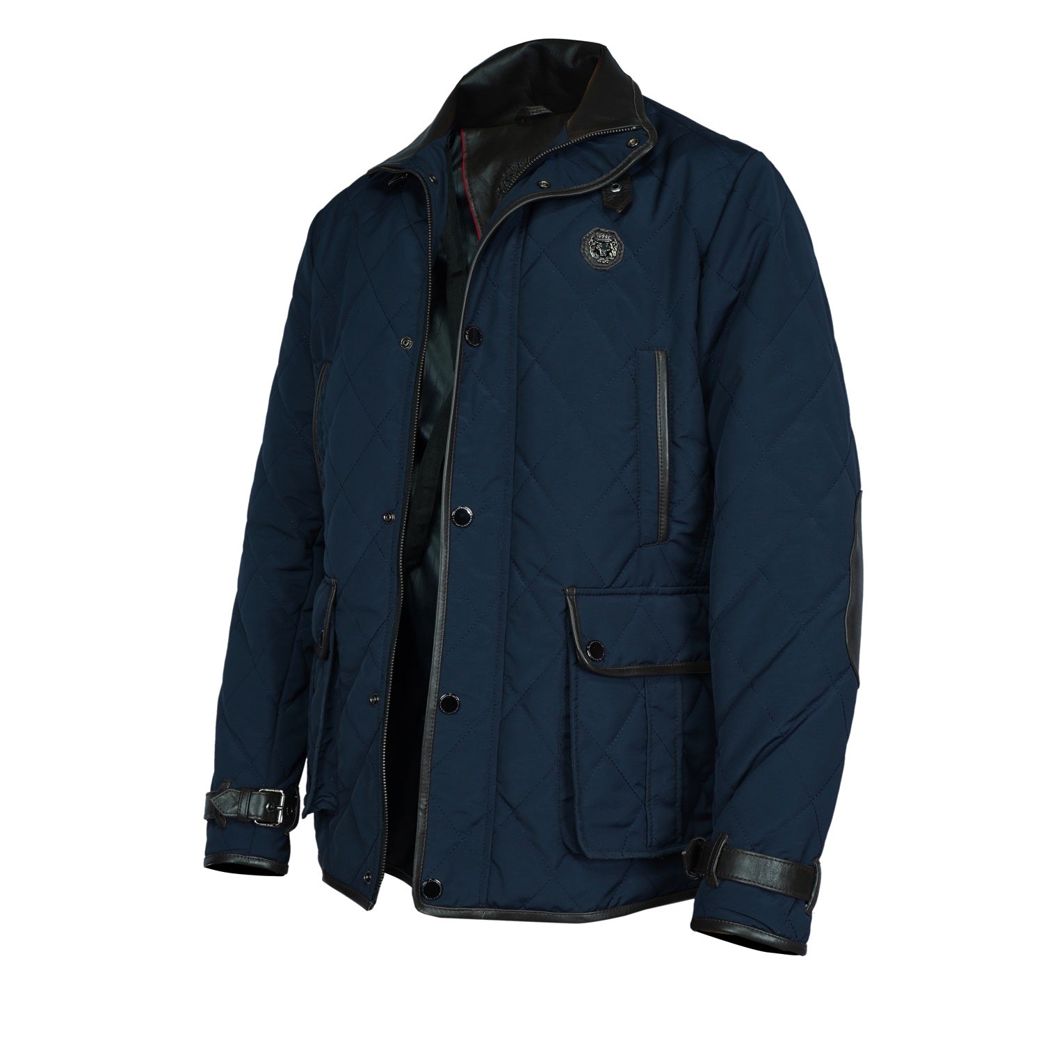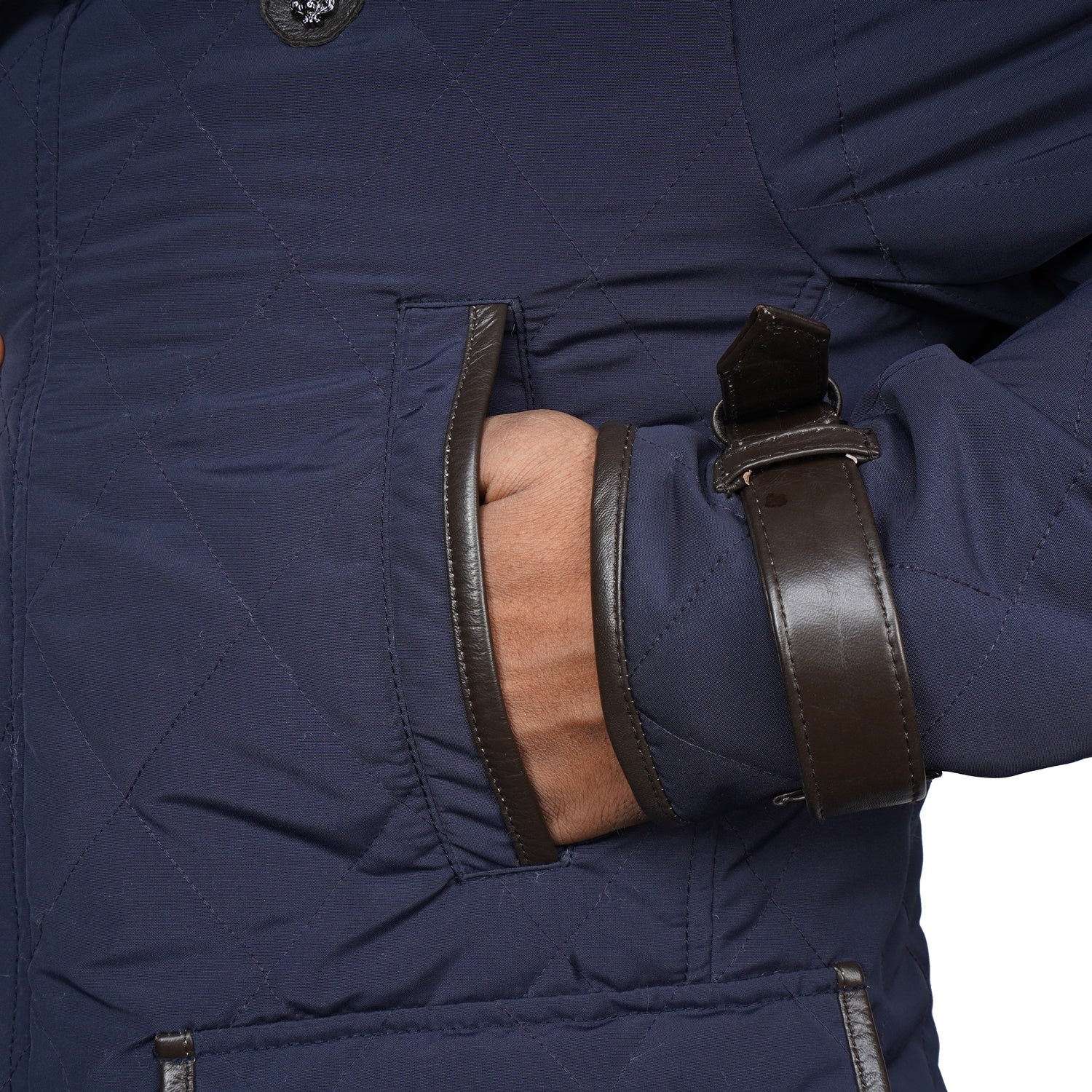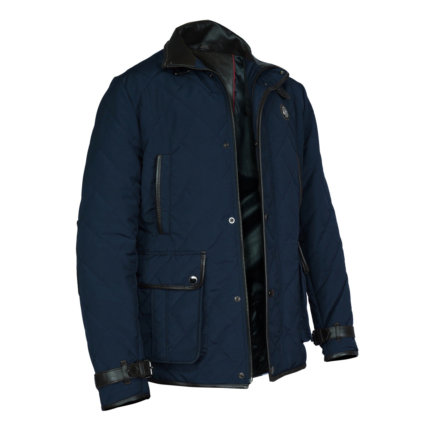 This men's Blue puffer coat jacket will keep you warm in style. Crafted from ultra-soft materials, the jacket has diamond stitching and contrasting dark brown leather trims at the neck, arms, and pockets. With its adjustable neck belt strap and multiple pockets, this jacket is the perfect blend of both functionality and luxury.