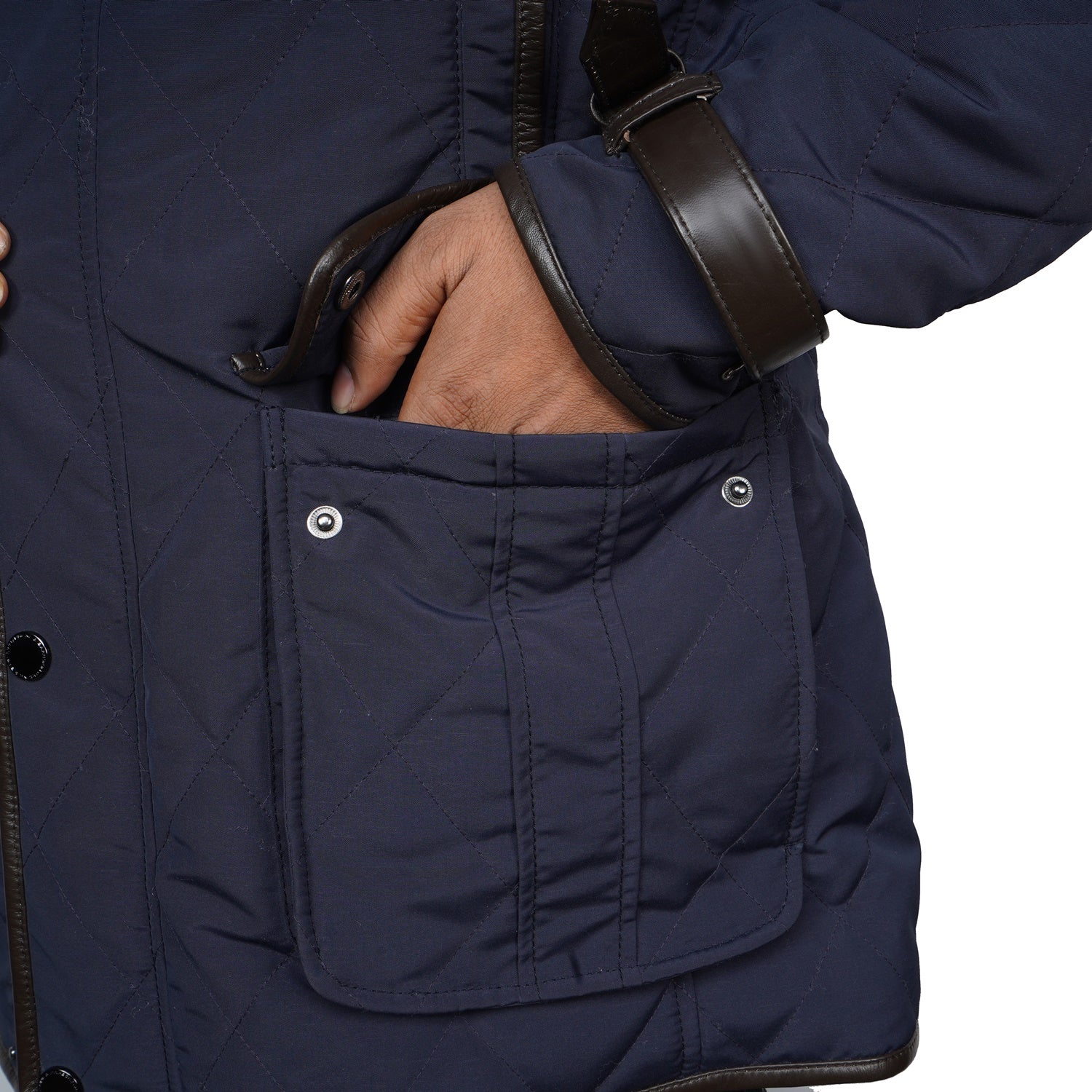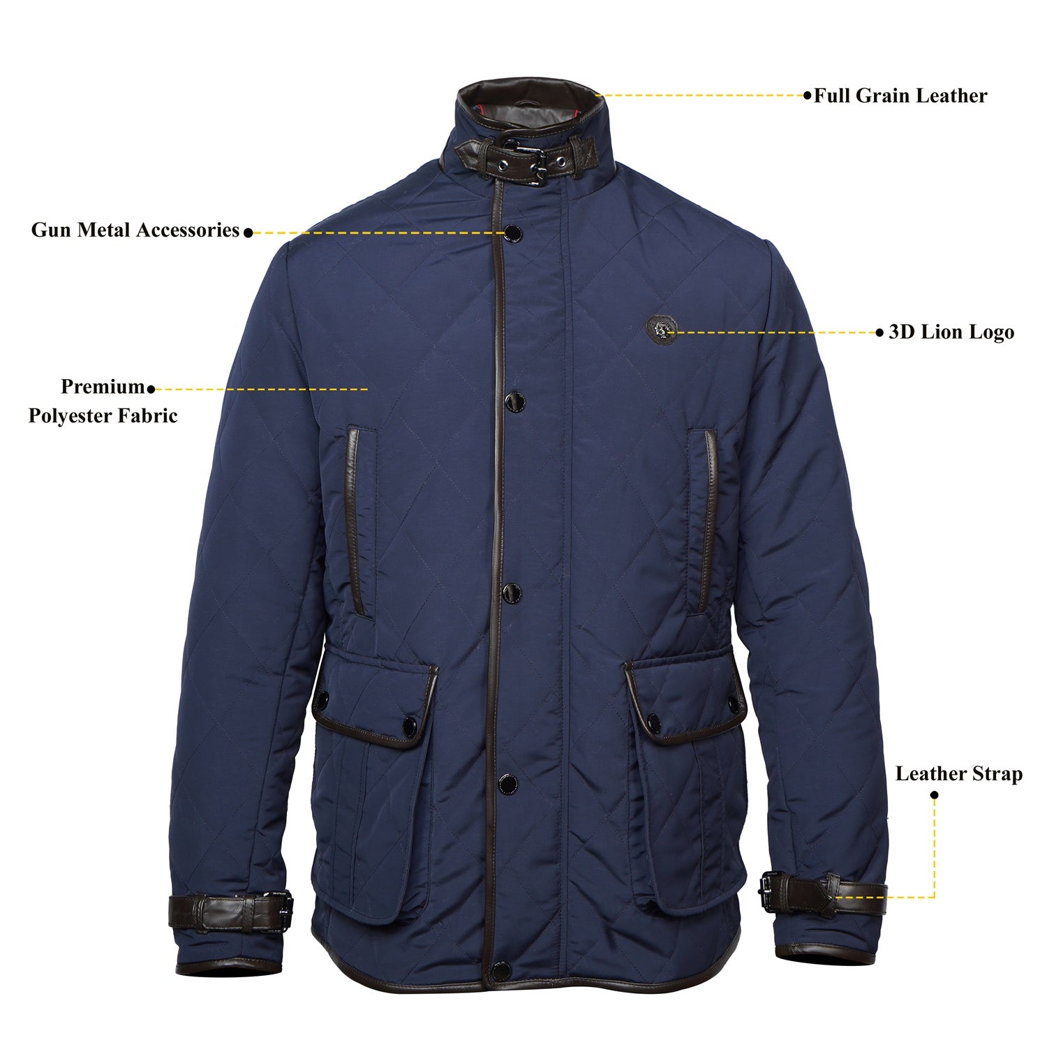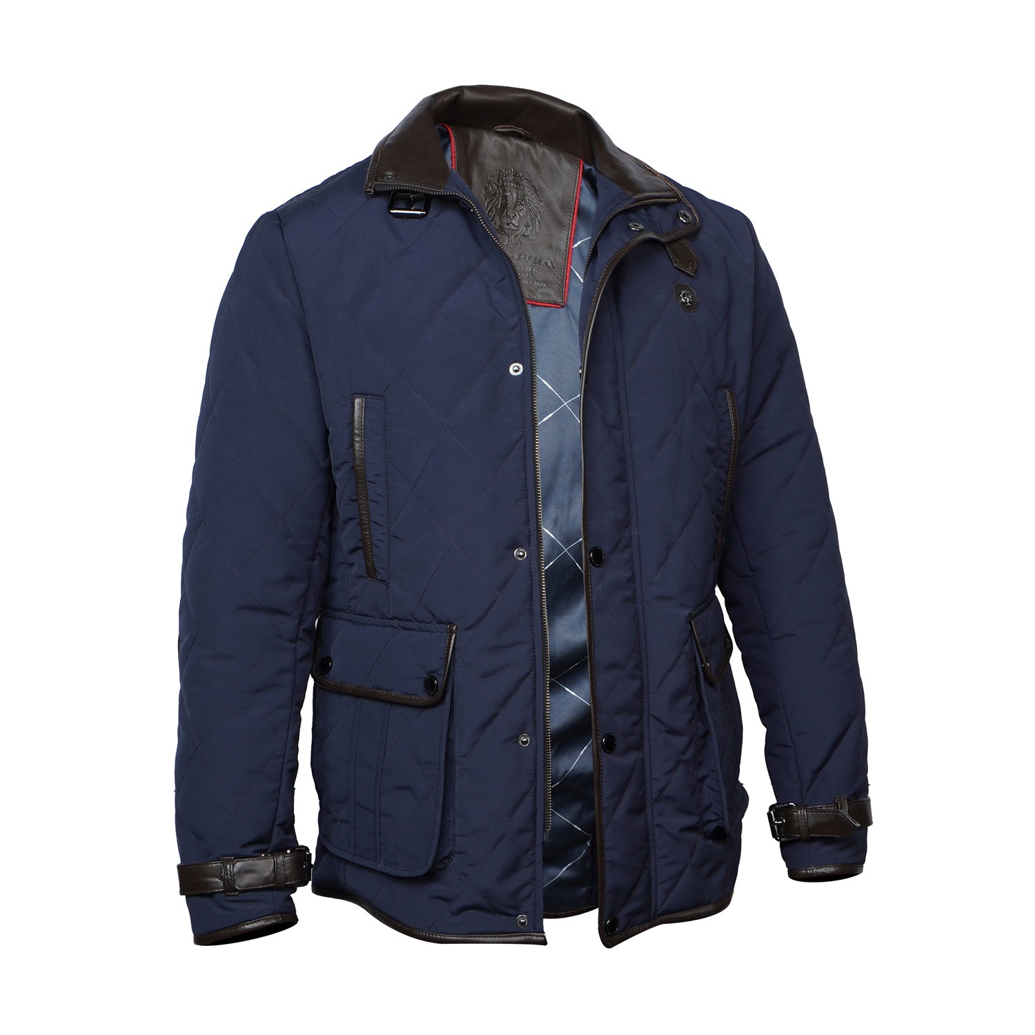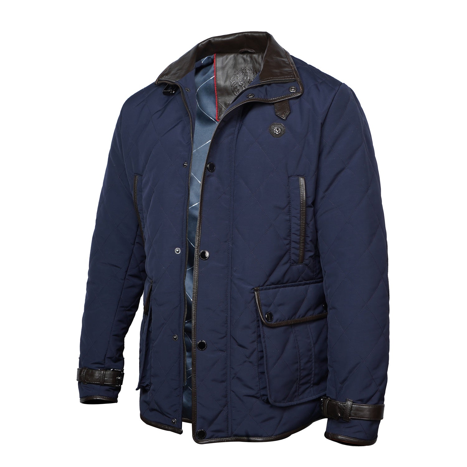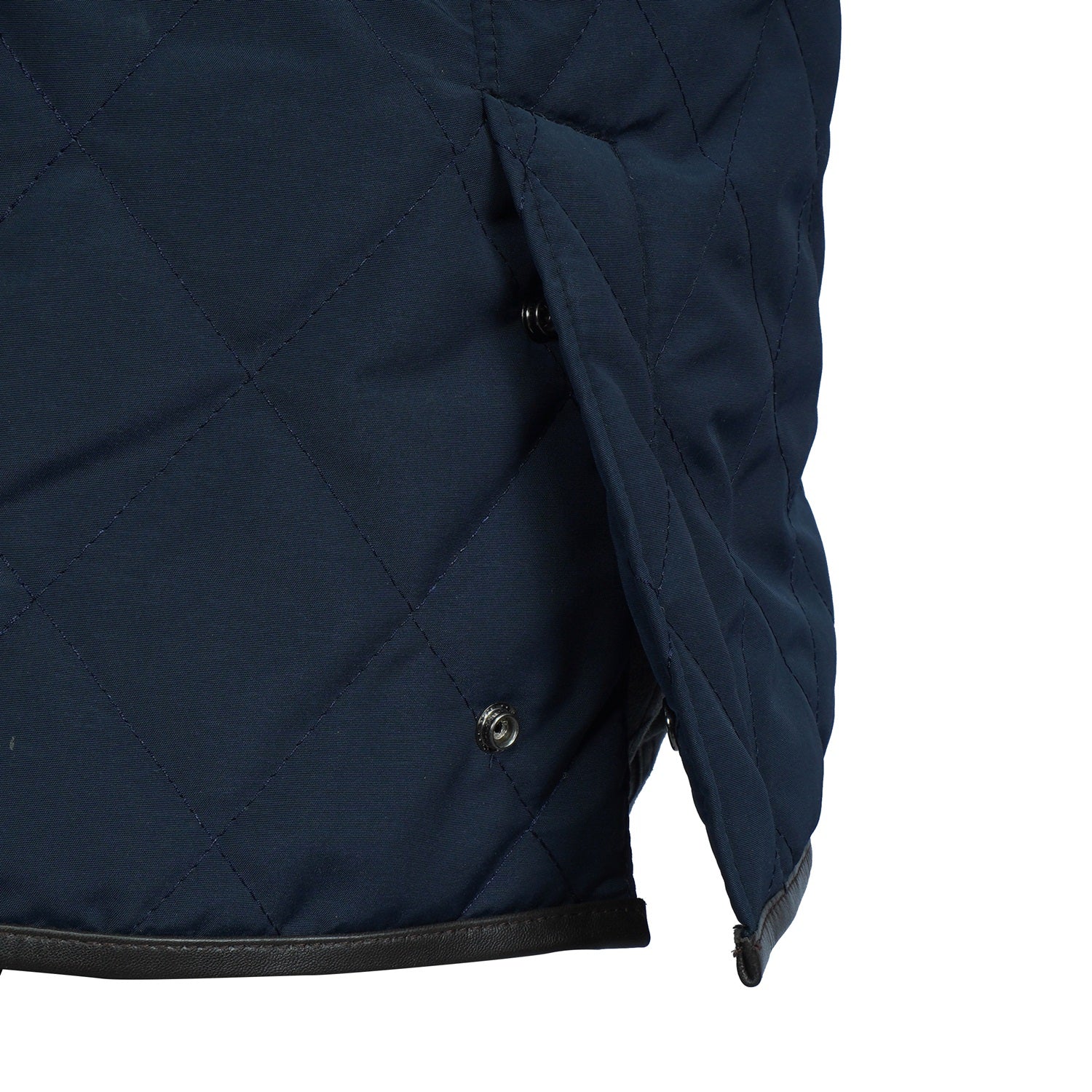 This men's Blue puffer coat jacket will keep you warm in style. Crafted from ultra-soft materials, the jacket has diamond stitching and contrasting dark brown leather trims at the neck, arms, and pockets. With its adjustable neck belt strap and multiple pockets, this jacket is the perfect blend of both functionality and luxury.
