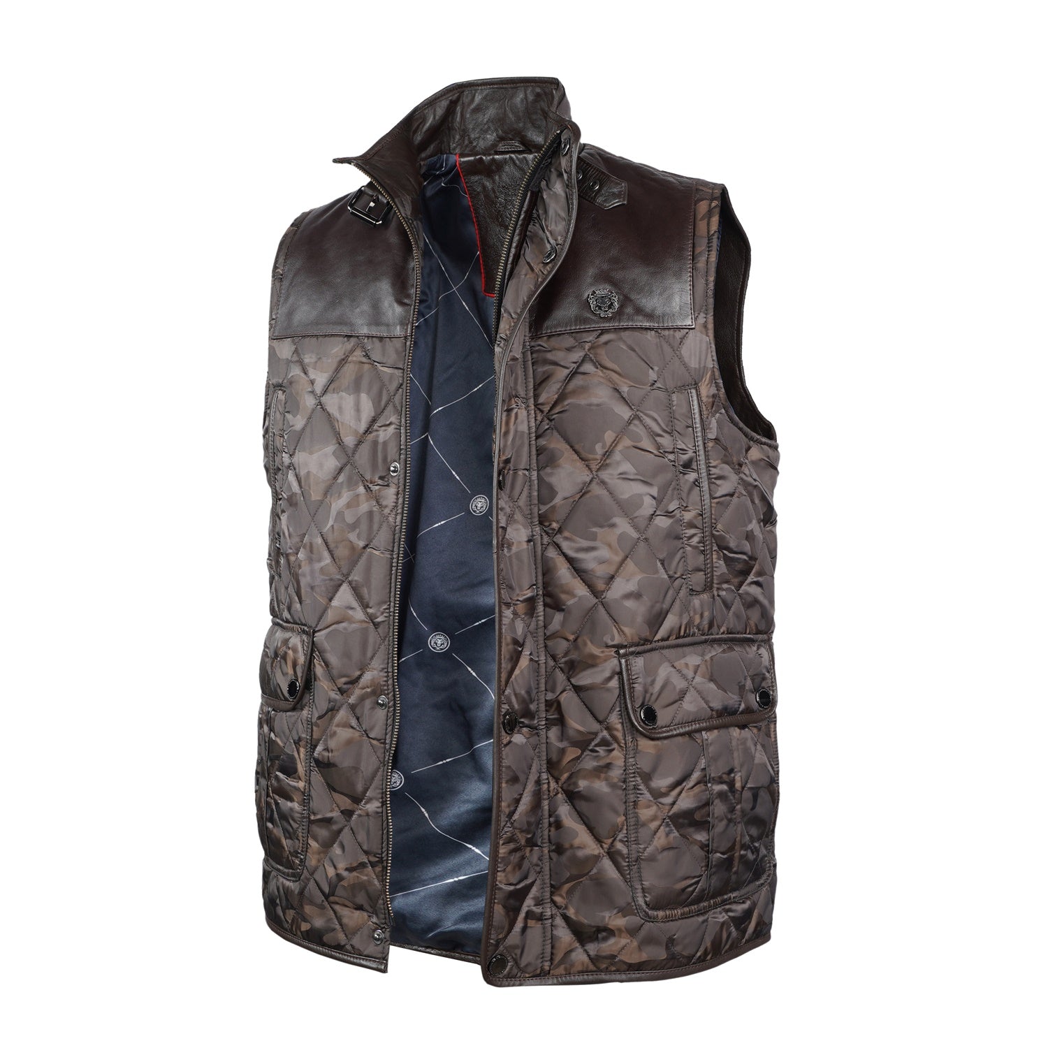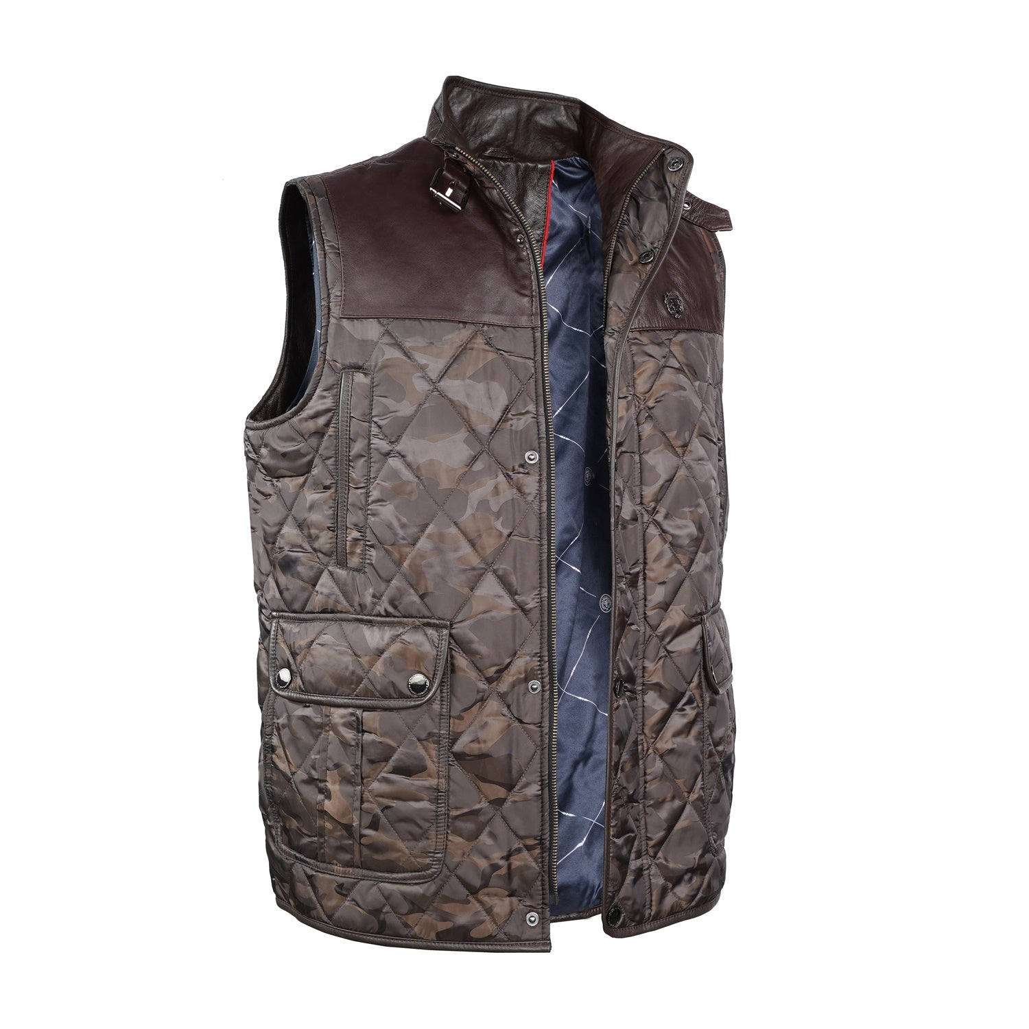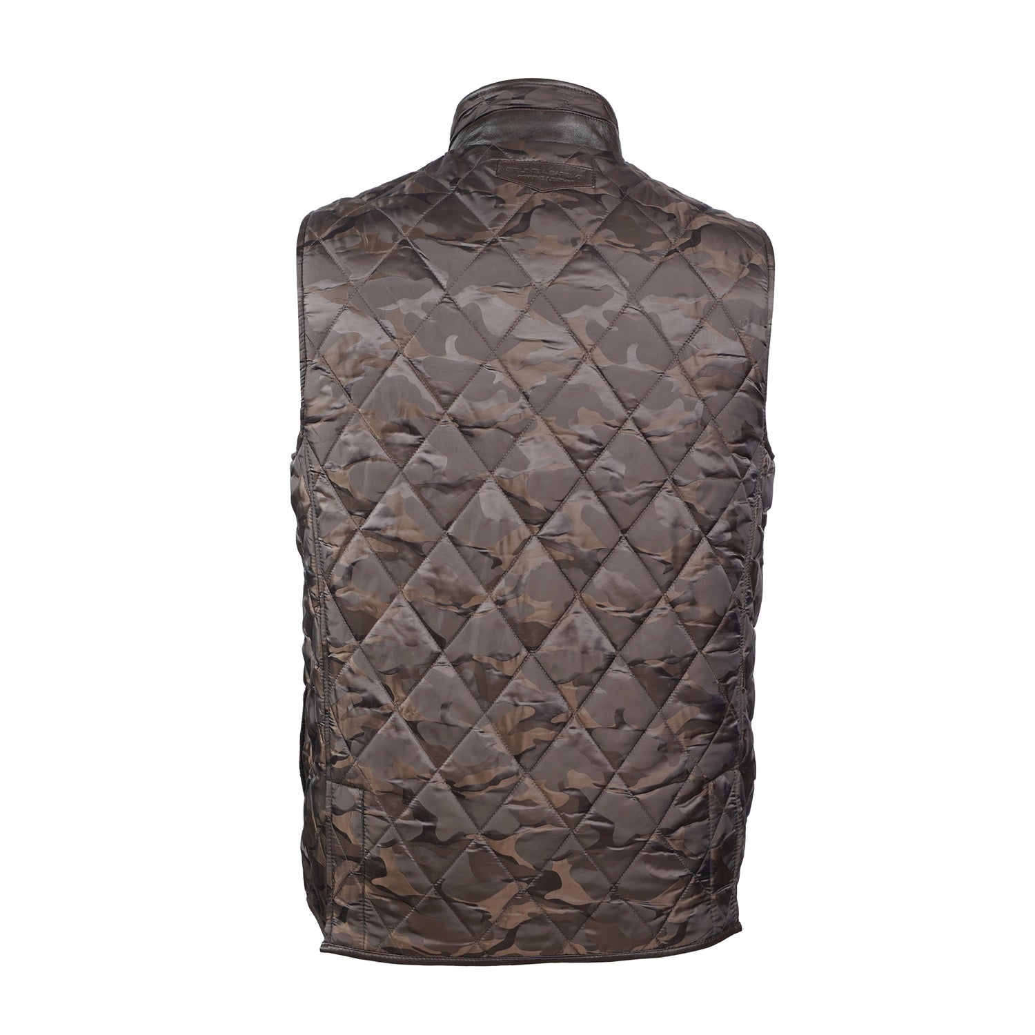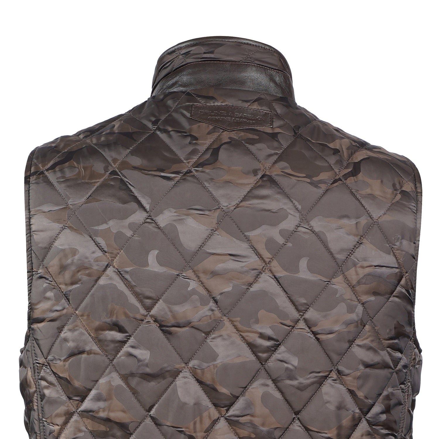 Experience superior luxury and comfort with this exquisite camo contrasting leather vest by Brune & Bareskin. Meticulously crafted from genuine leather and premium polyester, this high-neck vest showcases a diamond-quilted pattern and contrasting leather trims on the shoulders and panels, adding a touch of timeless sophistication.