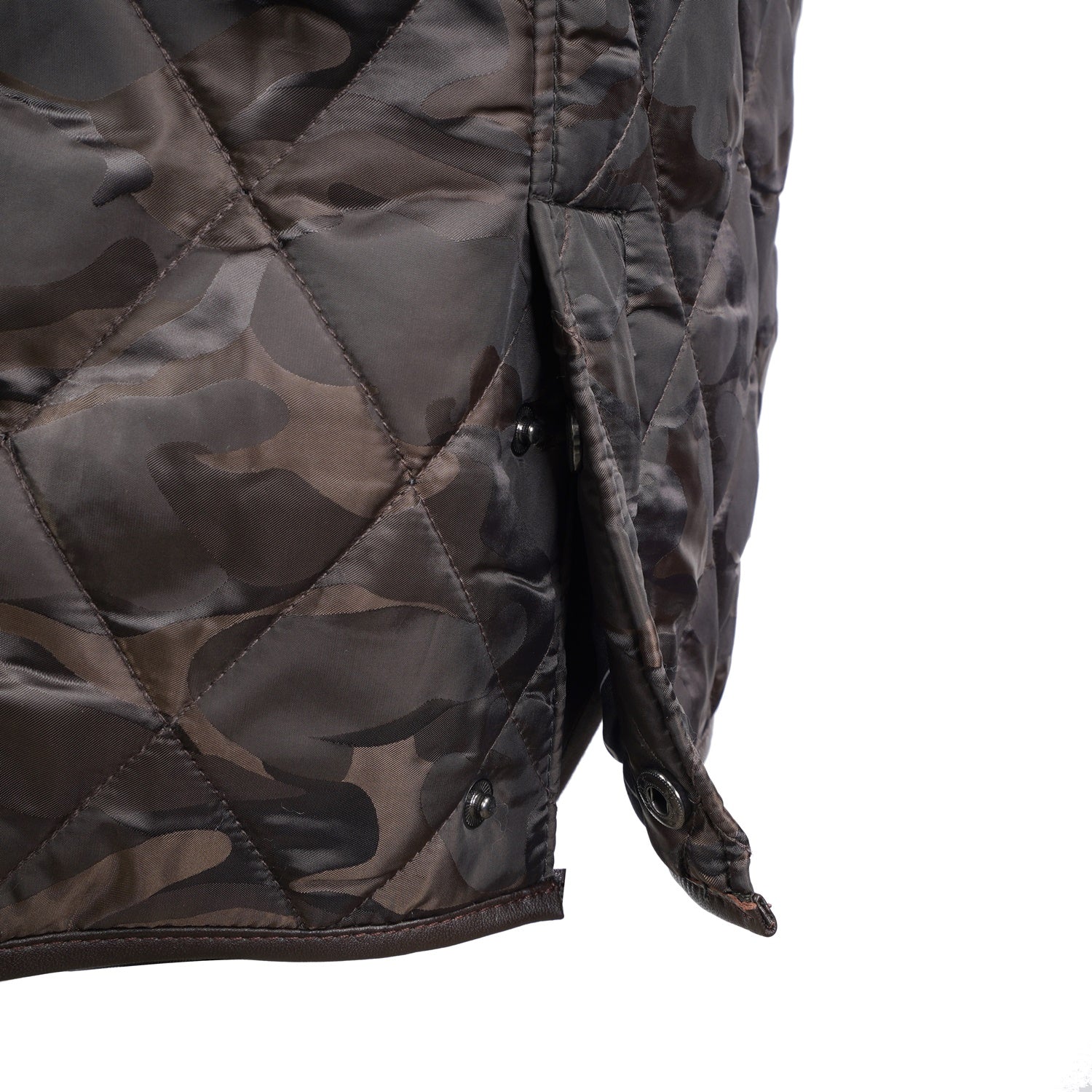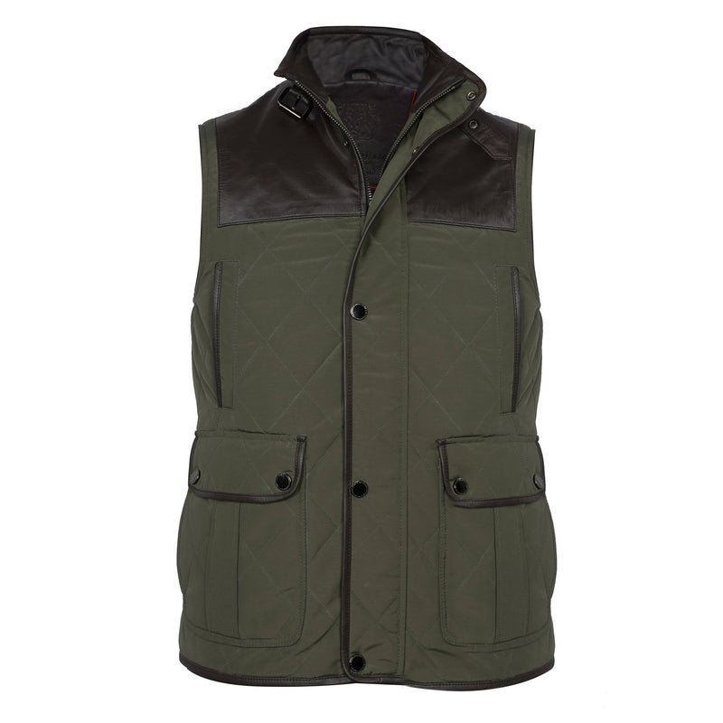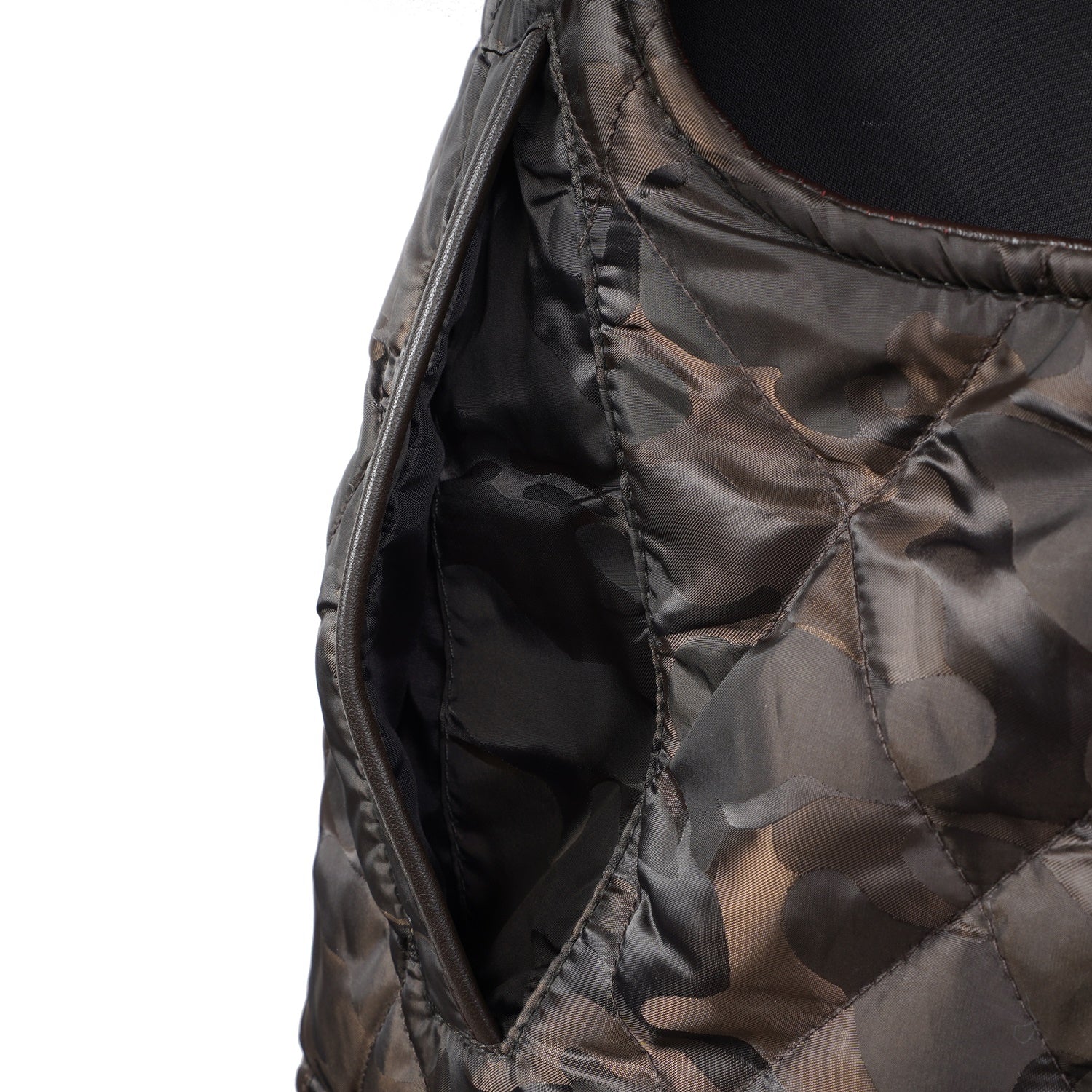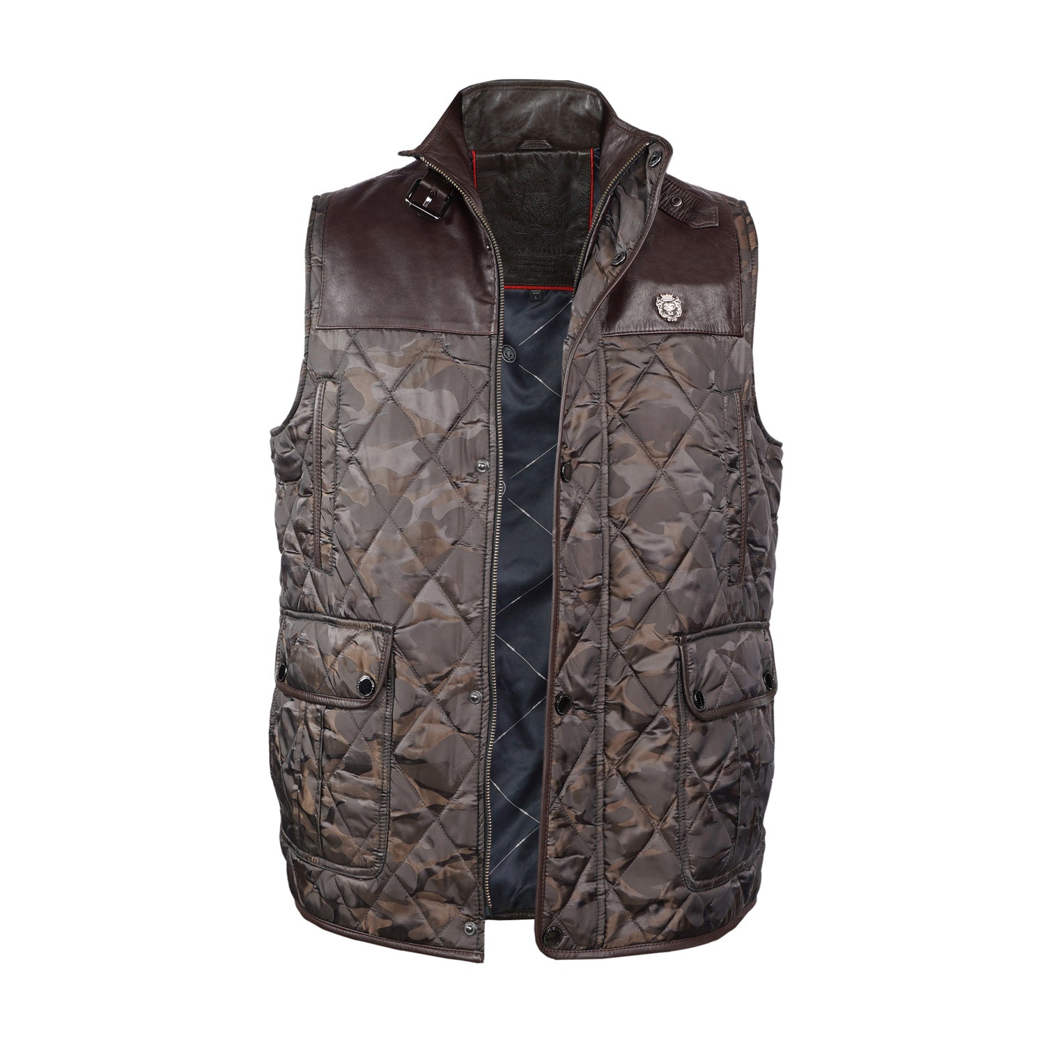 Experience superior luxury and comfort with this exquisite camo contrasting leather vest by Brune & Bareskin. Meticulously crafted from genuine leather and premium polyester, this high-neck vest showcases a diamond-quilted pattern and contrasting leather trims on the shoulders and panels, adding a touch of timeless sophistication.