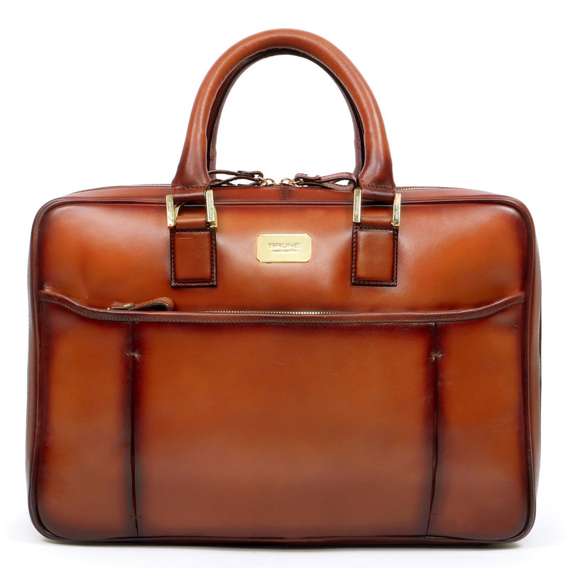 Brune & Bareskin dark brown office leather briefcase is a professional-looking bag typically used for carrying important documents, a laptop, and other work essentials. It is usually made of high-quality leather and has a sleek and sophisticated design. The briefcase typically features one or more compartments with zippered closures, as well as internal pockets for organizing items such as pens, business cards, and mobile phones. The exterior of the briefcase may be adorned with metal hardware and may have a top handle or a detachable shoulder strap for easy carrying. Overall, a dark brown office leather briefcase is a stylish and practical accessory for anyone who wants to convey a sense of professionalism and sophistication in the workplace.