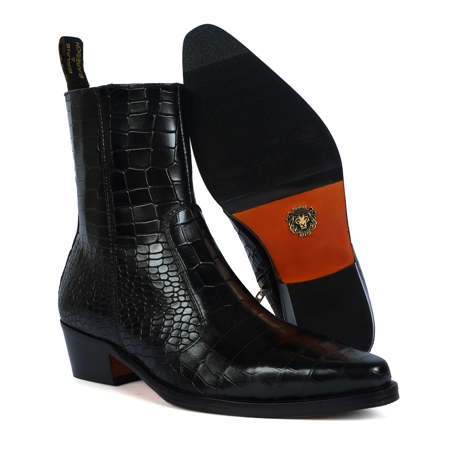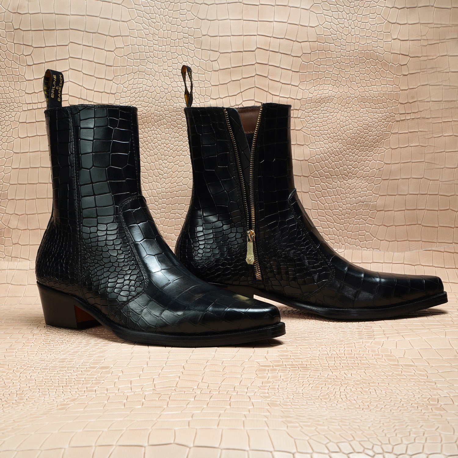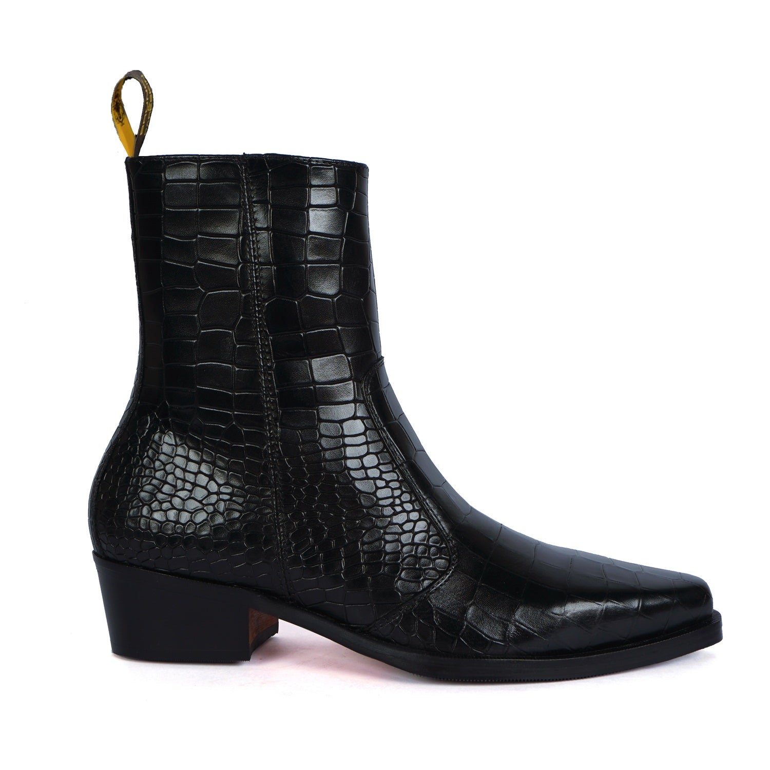 Cow Boy Cuban Heel Black Croco Textured Leather Boot