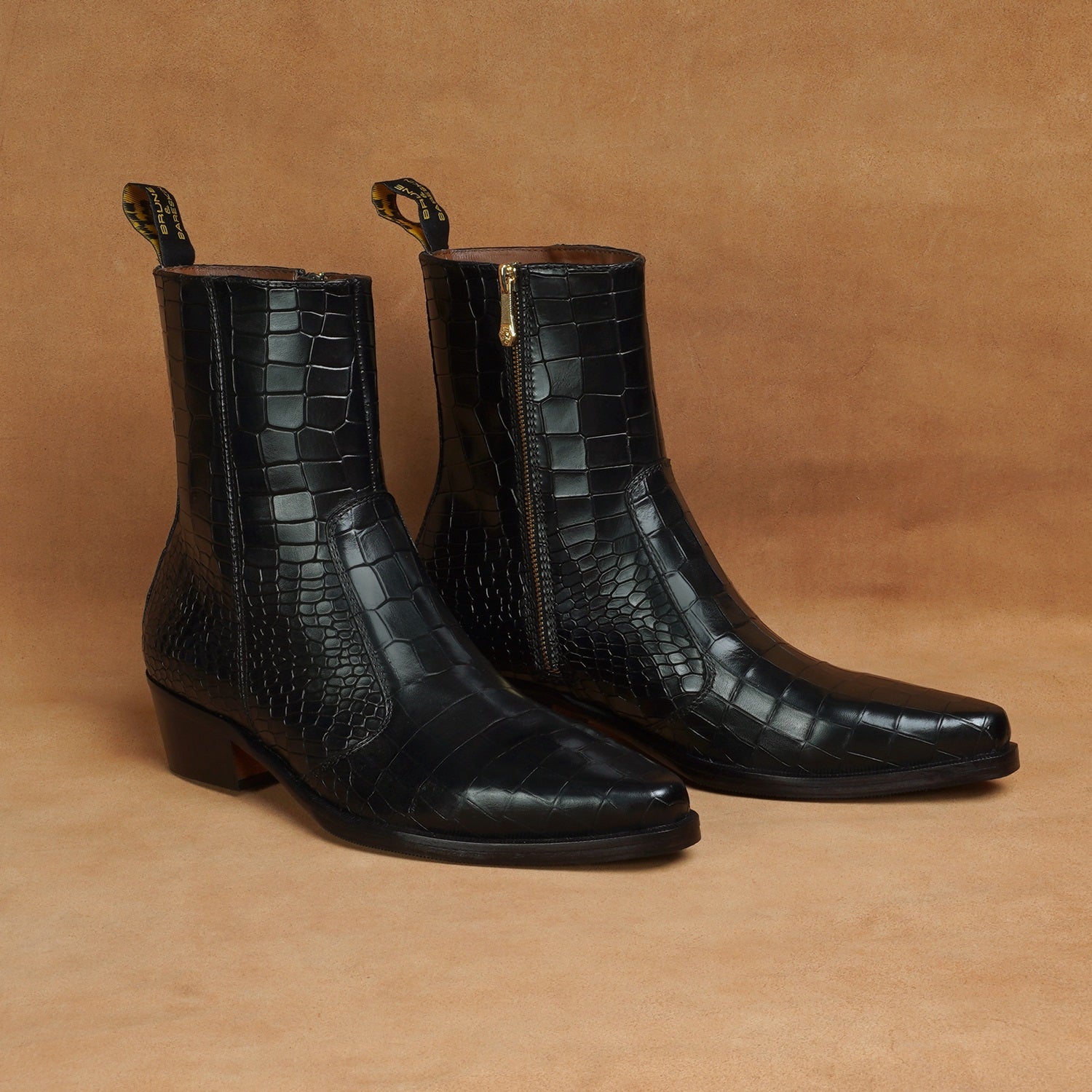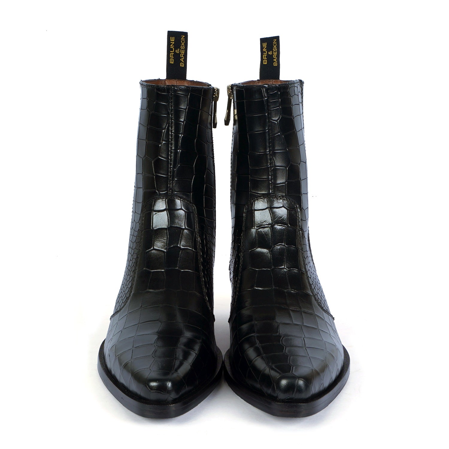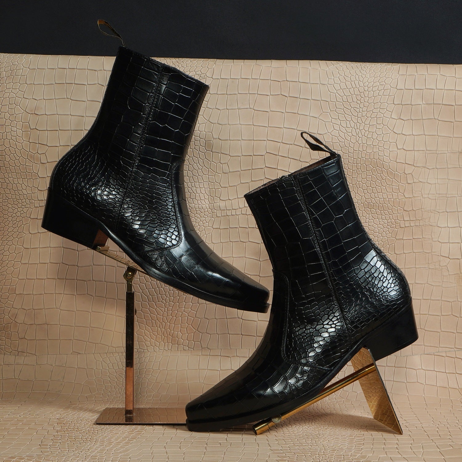 Cow Boy Cuban Heel Black Croco Textured Leather Boot