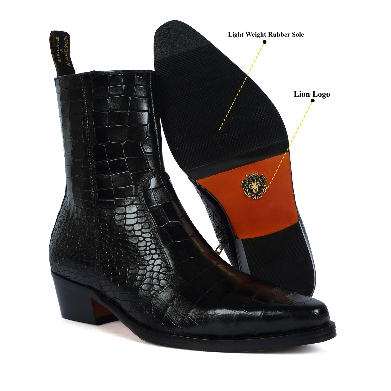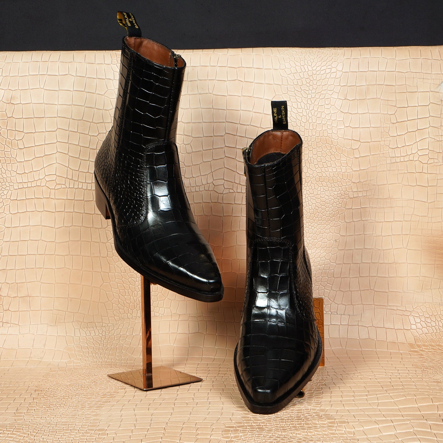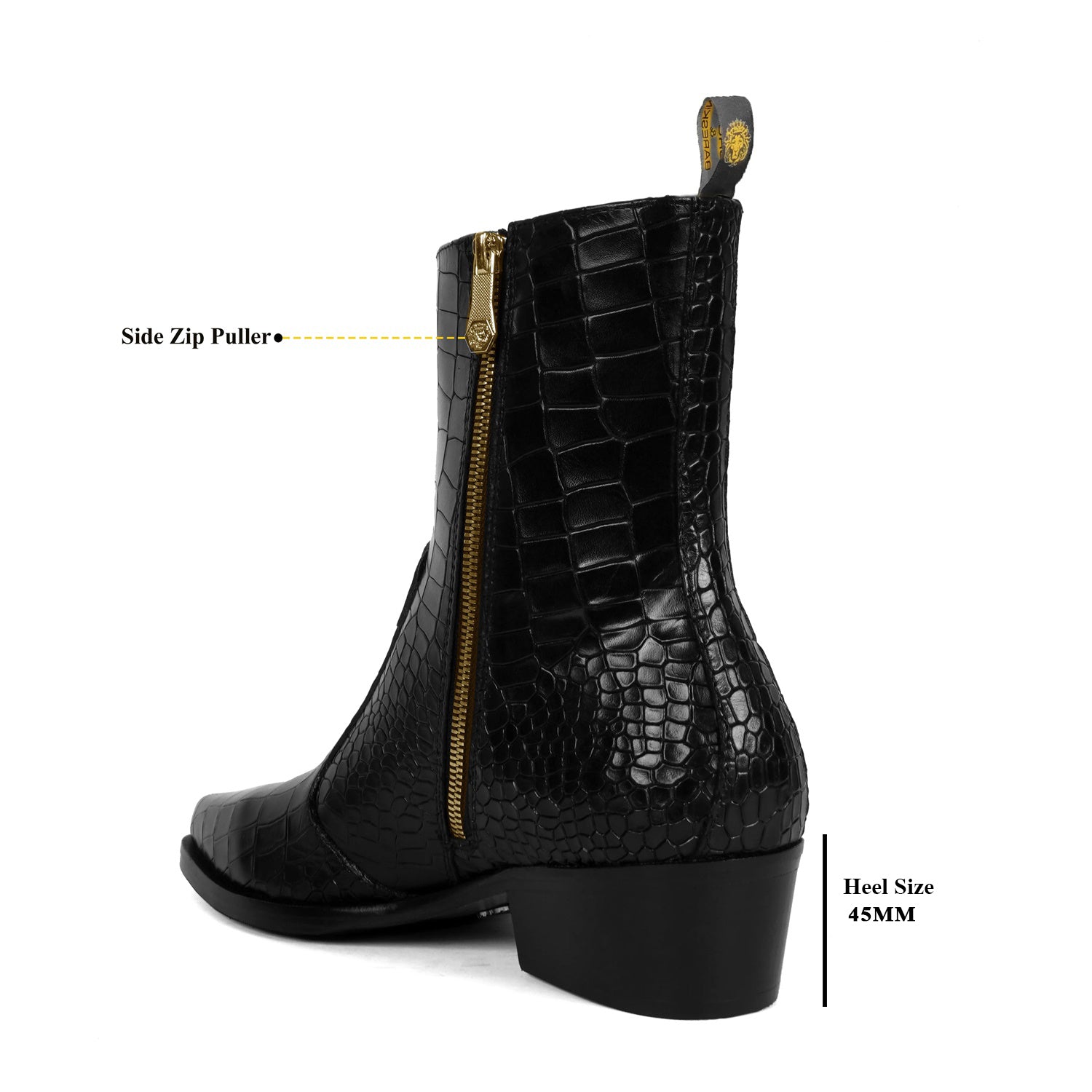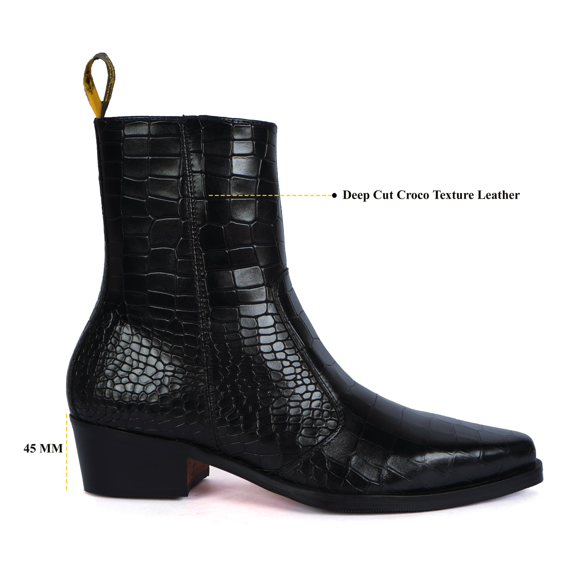 Step into sophistication and luxury with our Cow Boy Cuban Heel Black Croco Textured Leather Boot. This hand crafted boot features premium quality croco textured leather and greater detailing of an inner side zipper closure. The 40mm cuban heel and high ankle design give a sassy and chic look, while the rubber sole provides comfort and durability. With stitched detailing on the quarter and pointed toe, this boot is a must-have for any fashion-forward individual. Elevate your style with our exclusive and stylish boot.