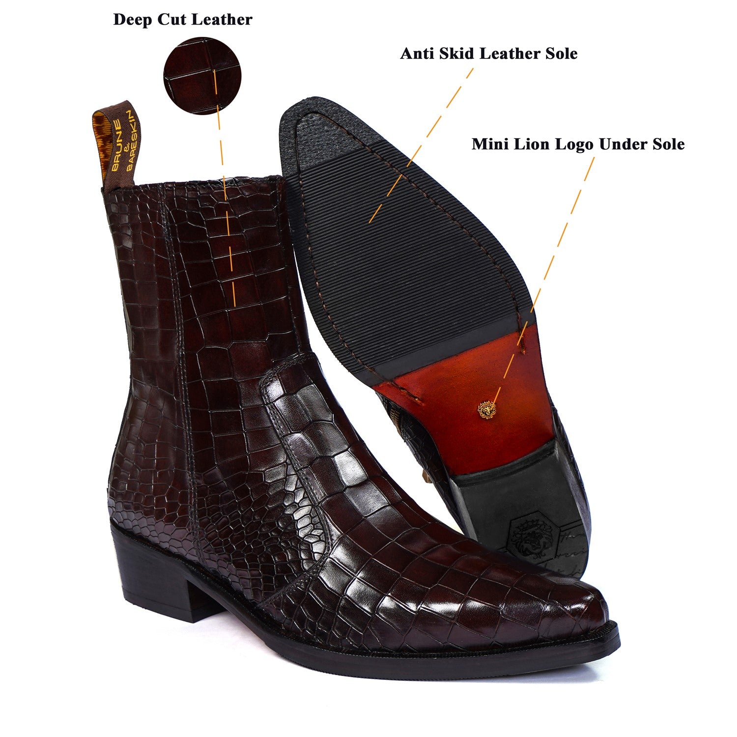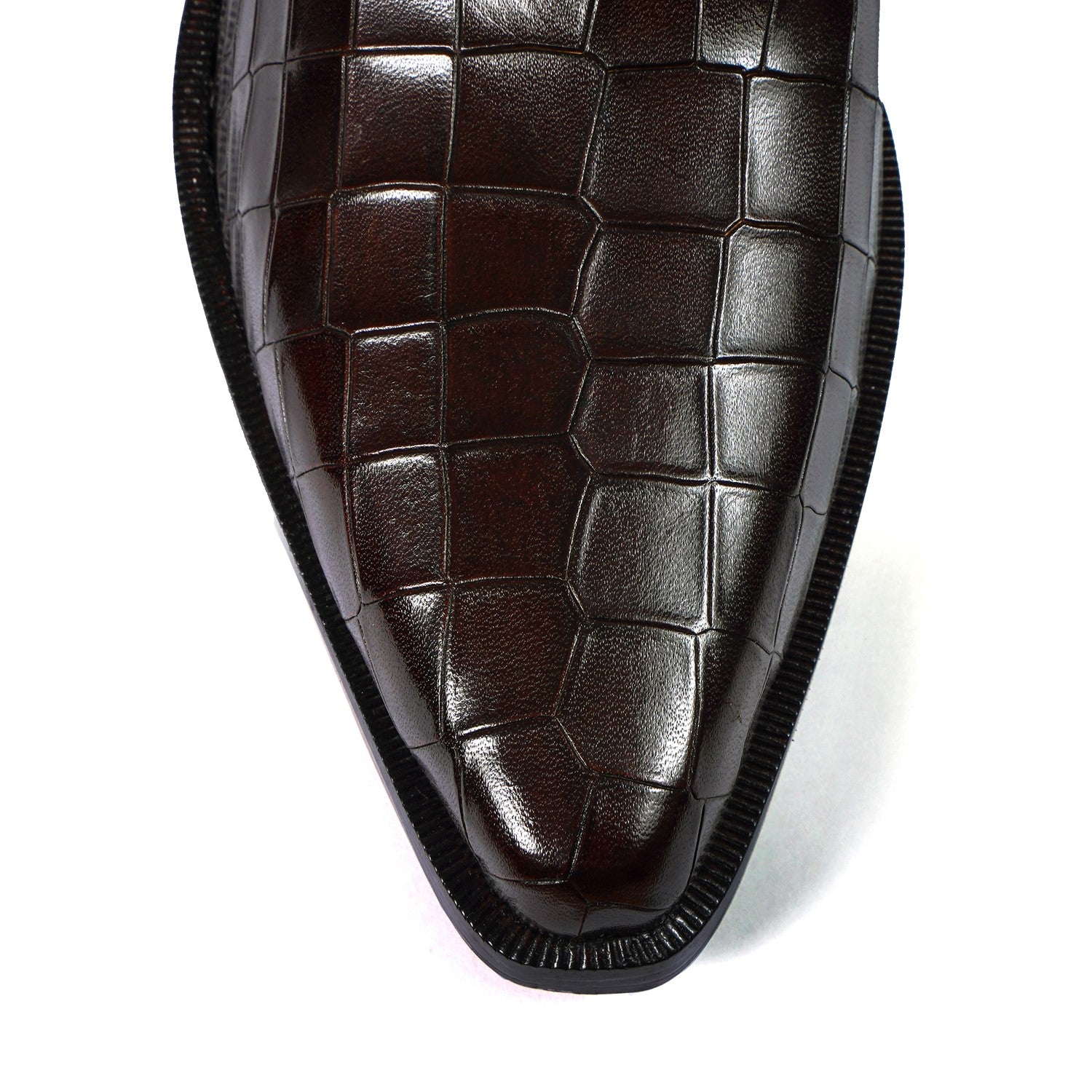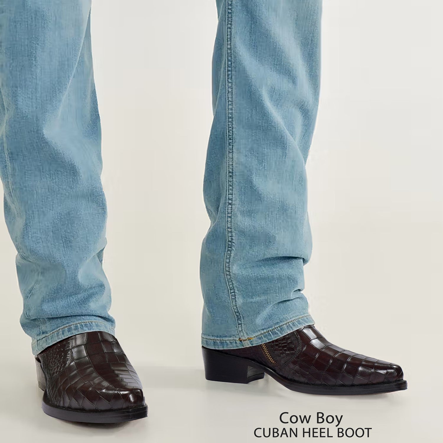 Ankle boot in leather are a dream come true for many a fashion-aware executives. We craft these high ankle dark brown brushed off leather cowboy boots to give you an elite look. This shoe can be customized according to your liking. This Shoe is entirely handcrafted by our expertise.