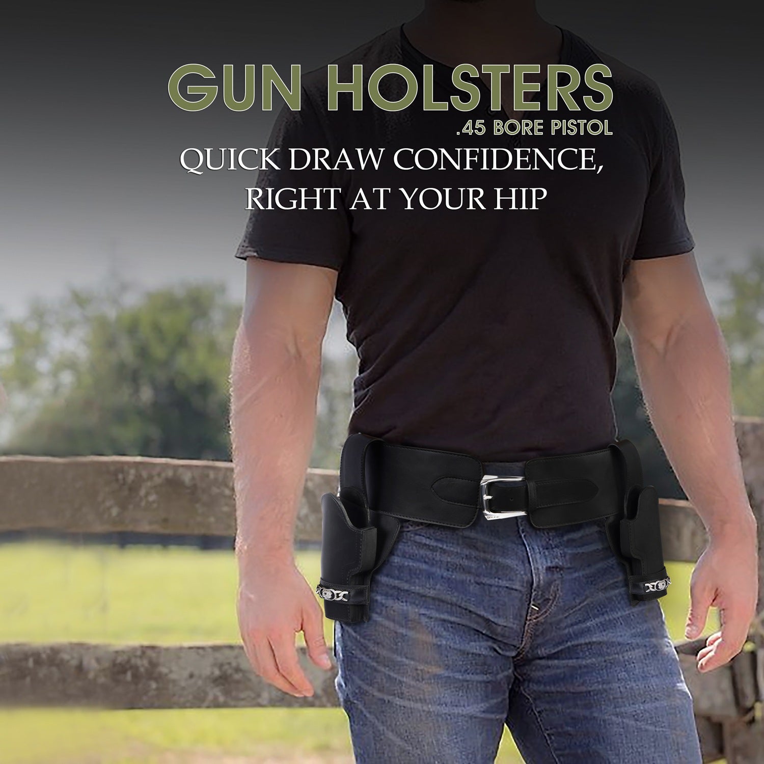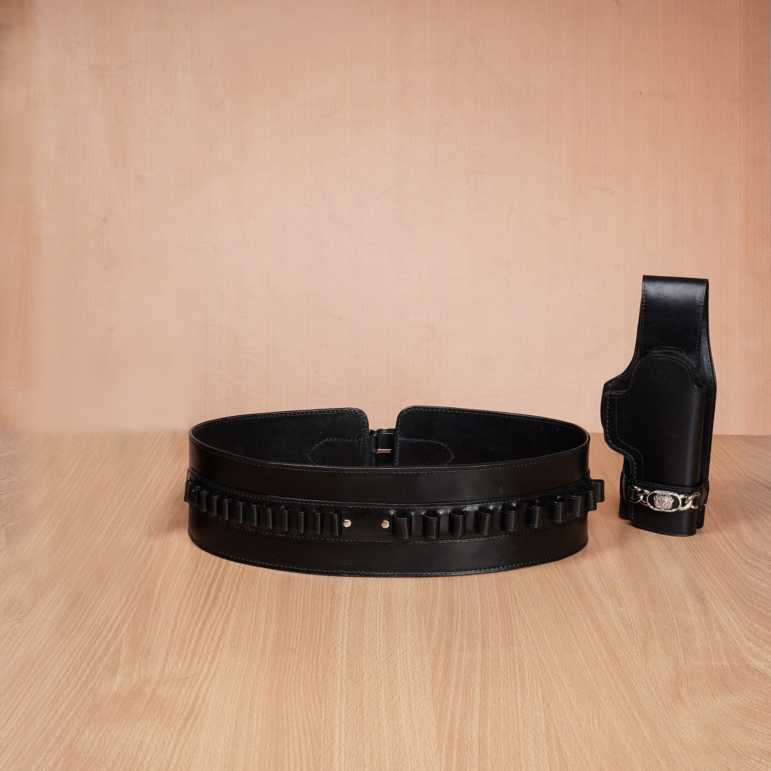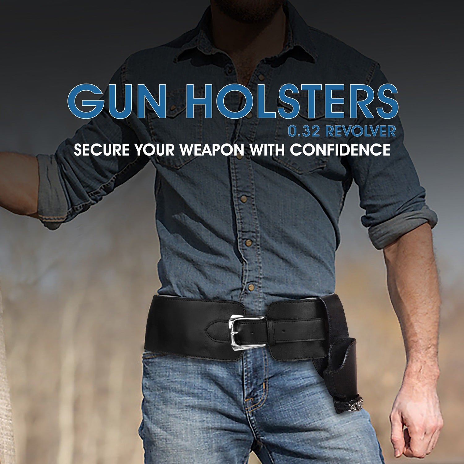 Secure your firearm in style with our Cowboy Western Style Gun Holster & Belt Set. Hand-crafted from premium quality genuine leather and featuring a trademark lion logo buckle, this set is perfect for those seeking a perfect cowboy look. With a detachable armor cover and interchangeable options between .45 pistol and .32 revolver, this heavy-duty set is ideal for any rough rider.