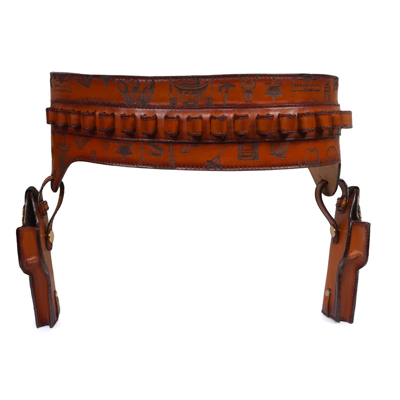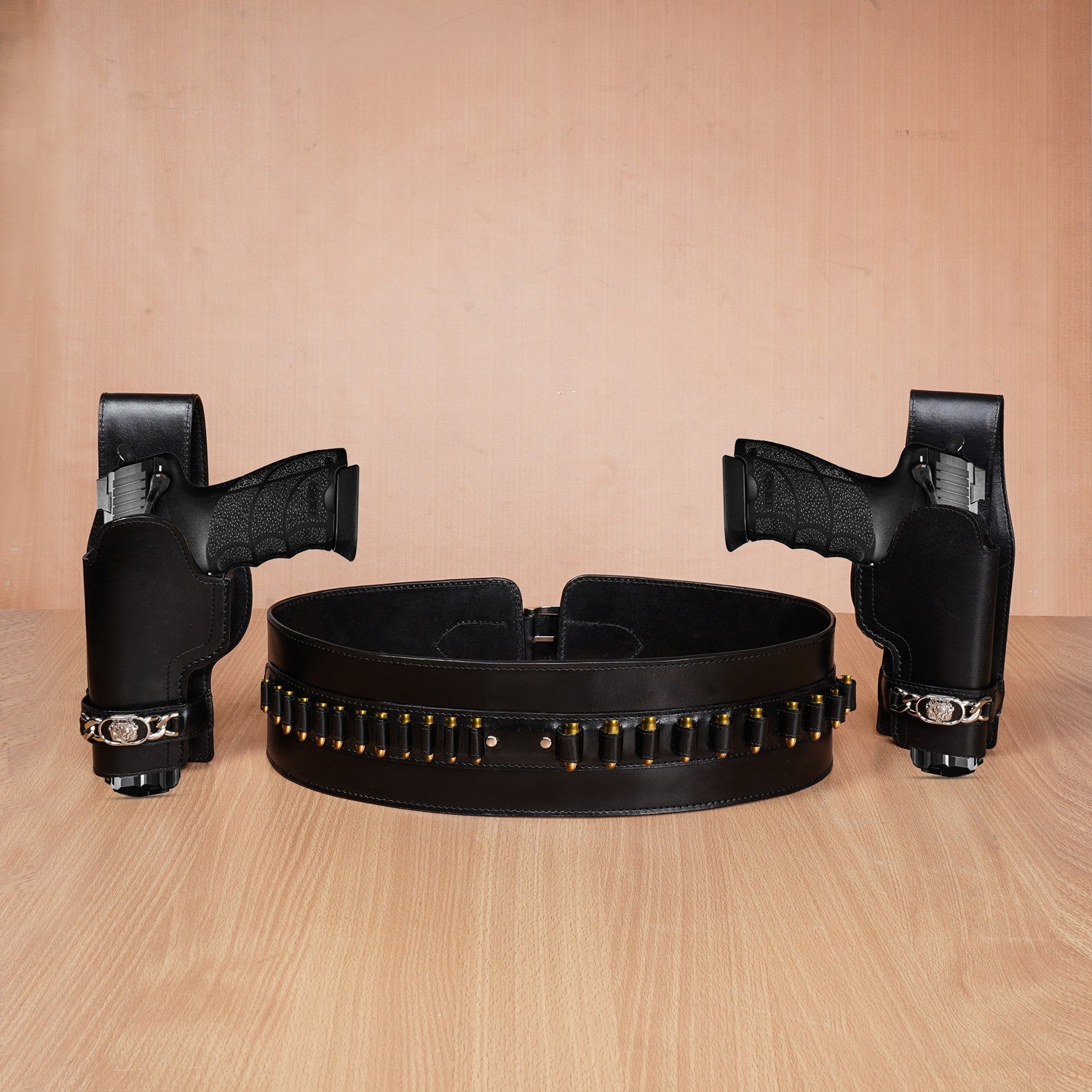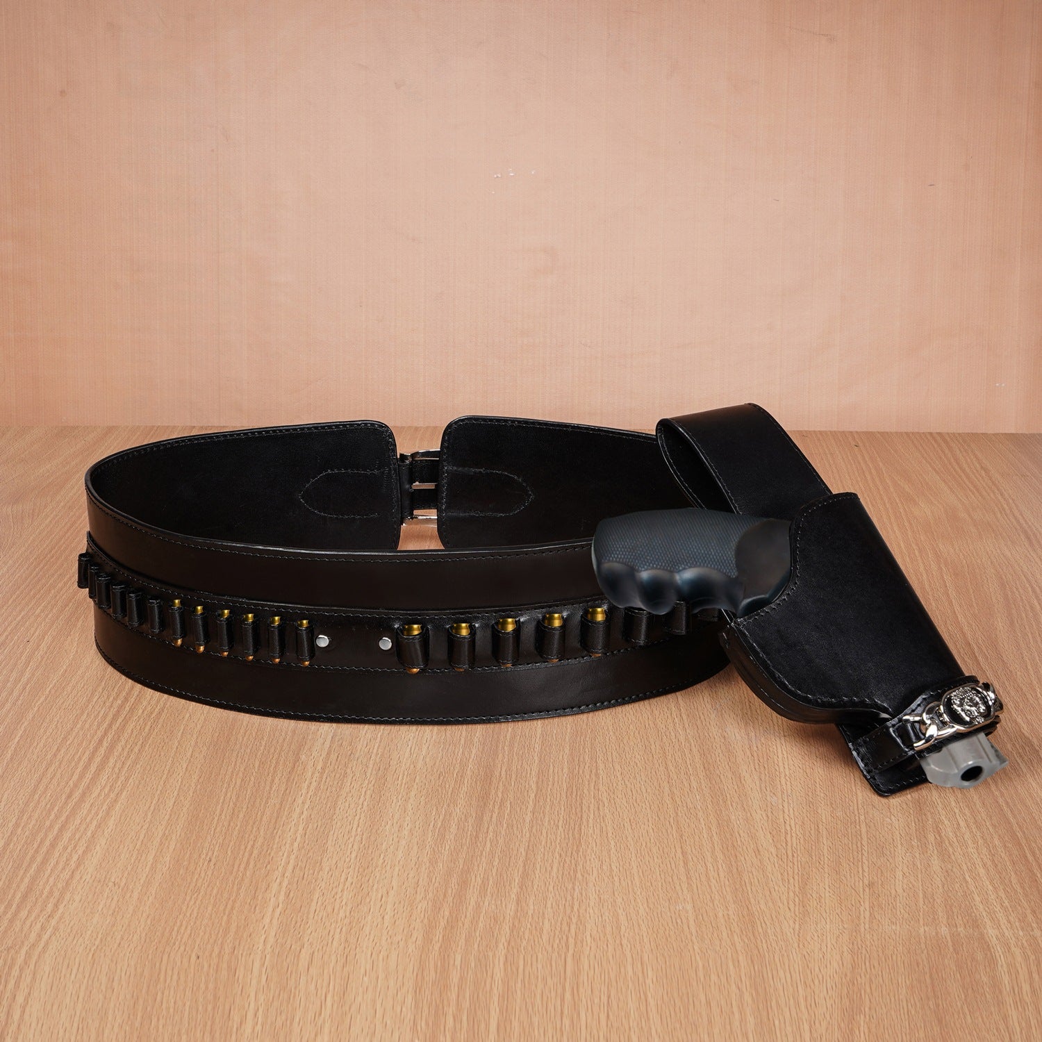 Secure your firearm in style with our Cowboy Western Style Gun Holster & Belt Set. Hand-crafted from premium quality genuine leather and featuring a trademark lion logo buckle, this set is perfect for those seeking a perfect cowboy look. With a detachable armor cover and interchangeable options between .45 pistol and .32 revolver, this heavy-duty set is ideal for any rough rider.