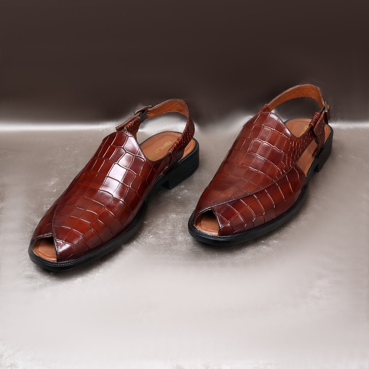Croco Dark Brown Genuine Leather Cross Design Light Weight Peshawari Sandals For Men by Brune & Bareskin