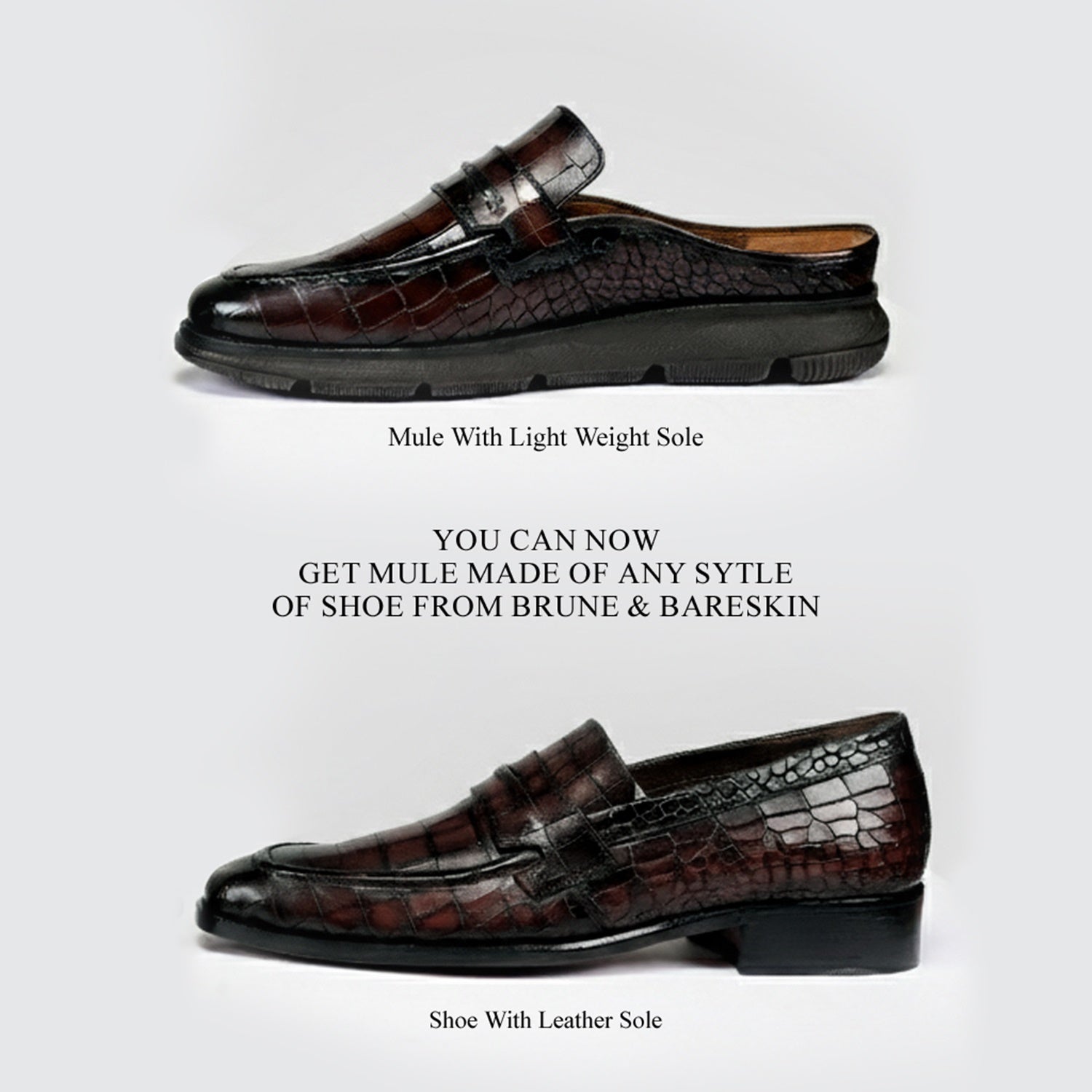 At Brune & Bareskin, you can customize mules in any shoe style.