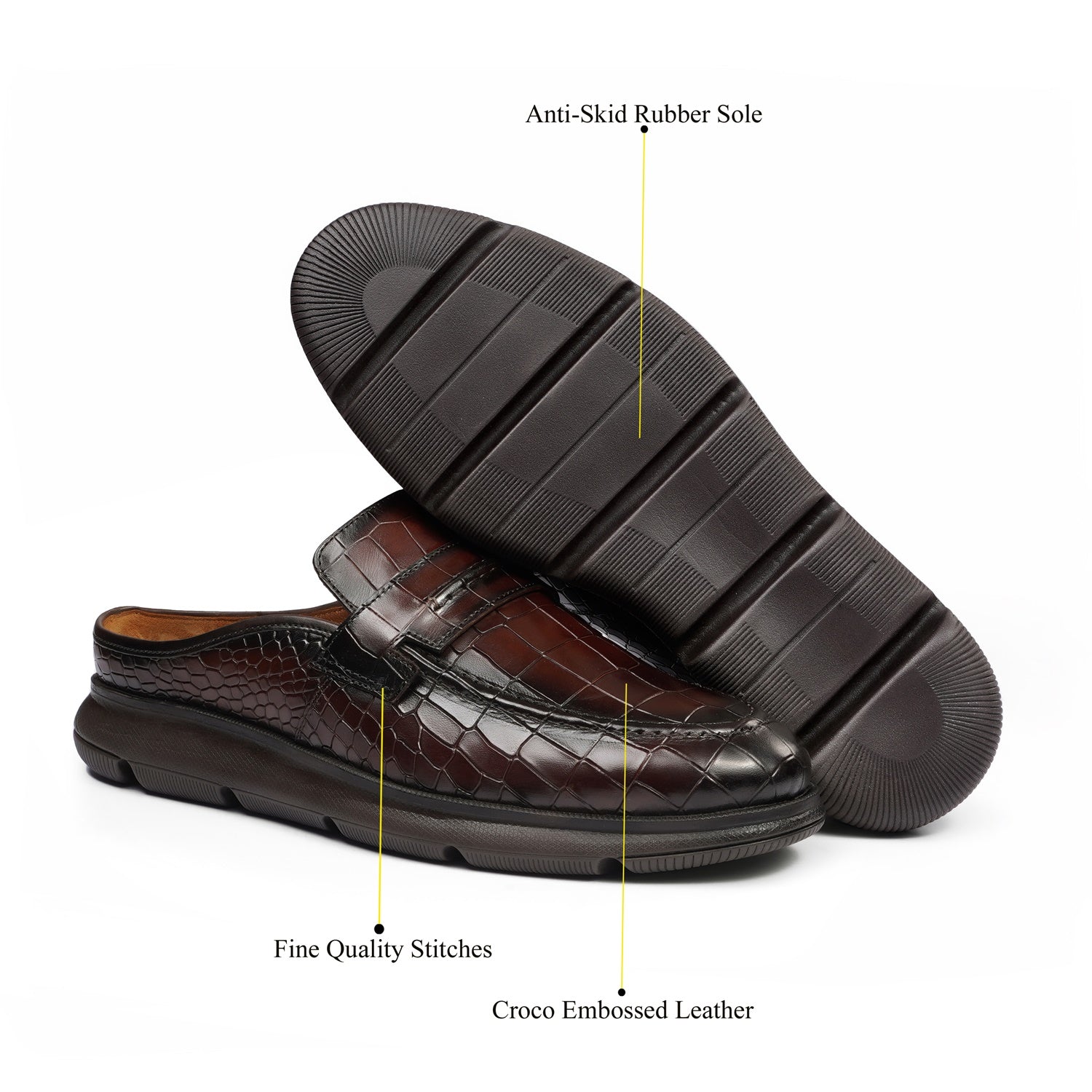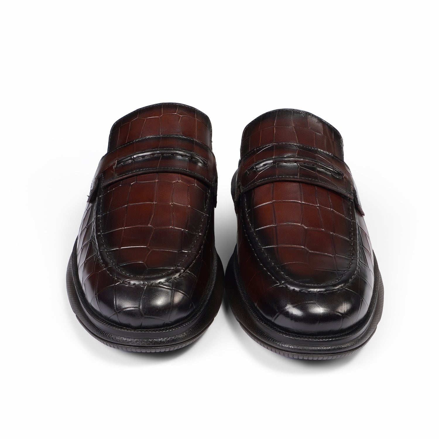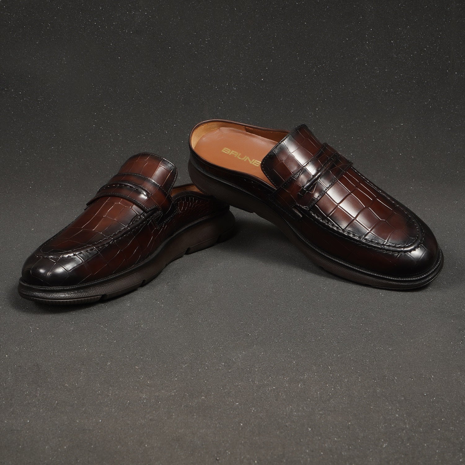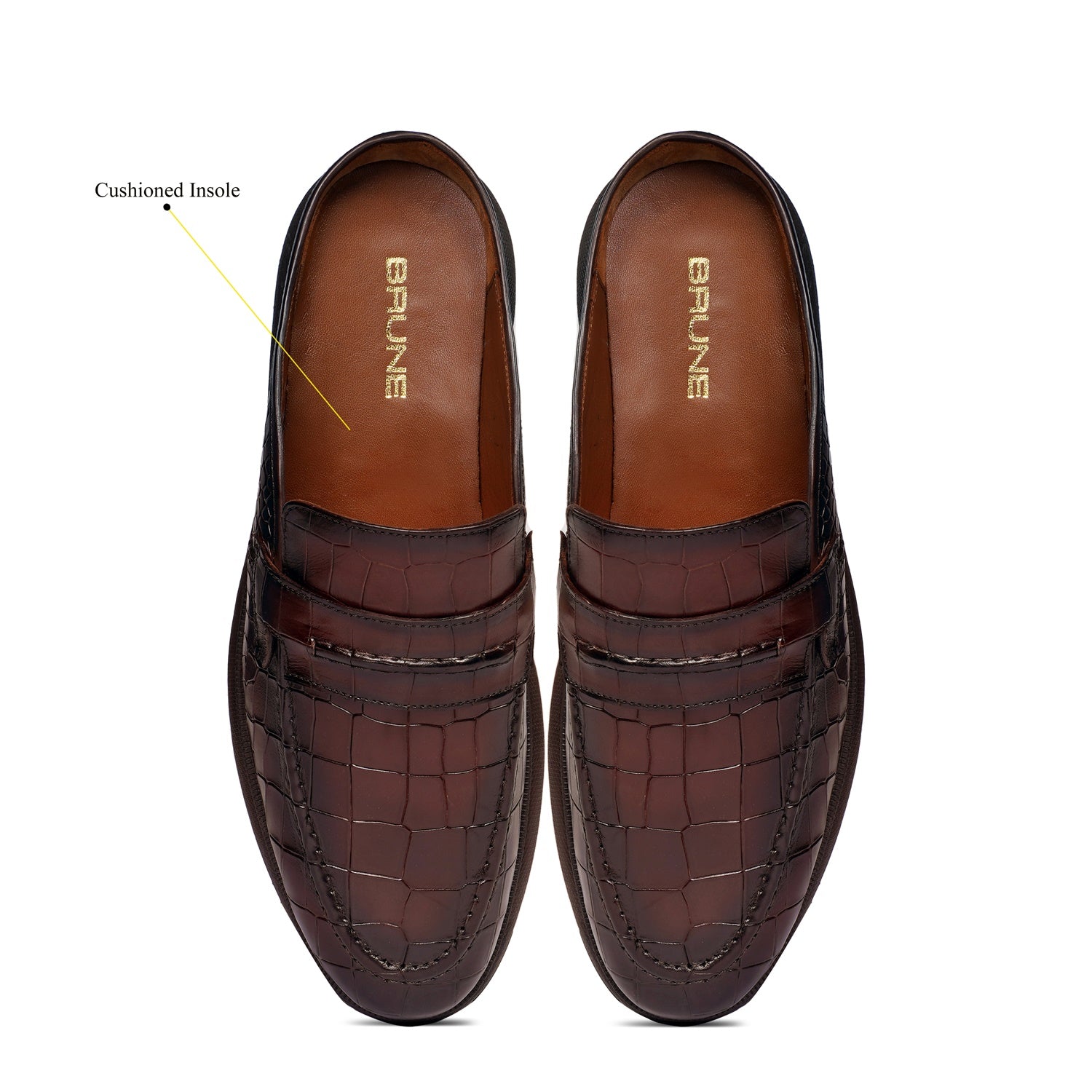 Indulge in the rich allure of dark brown croco-embossed leather—handcrafted for that signature Brune & Bareskin sophistication. Featherlight design keeps you moving freely, while the anti-skid rubber sole ensures confident steps on any surface. Perfect for seamless style from desk to dinner.