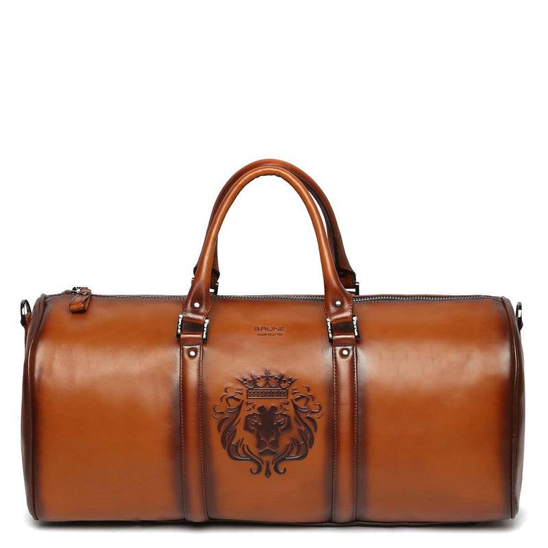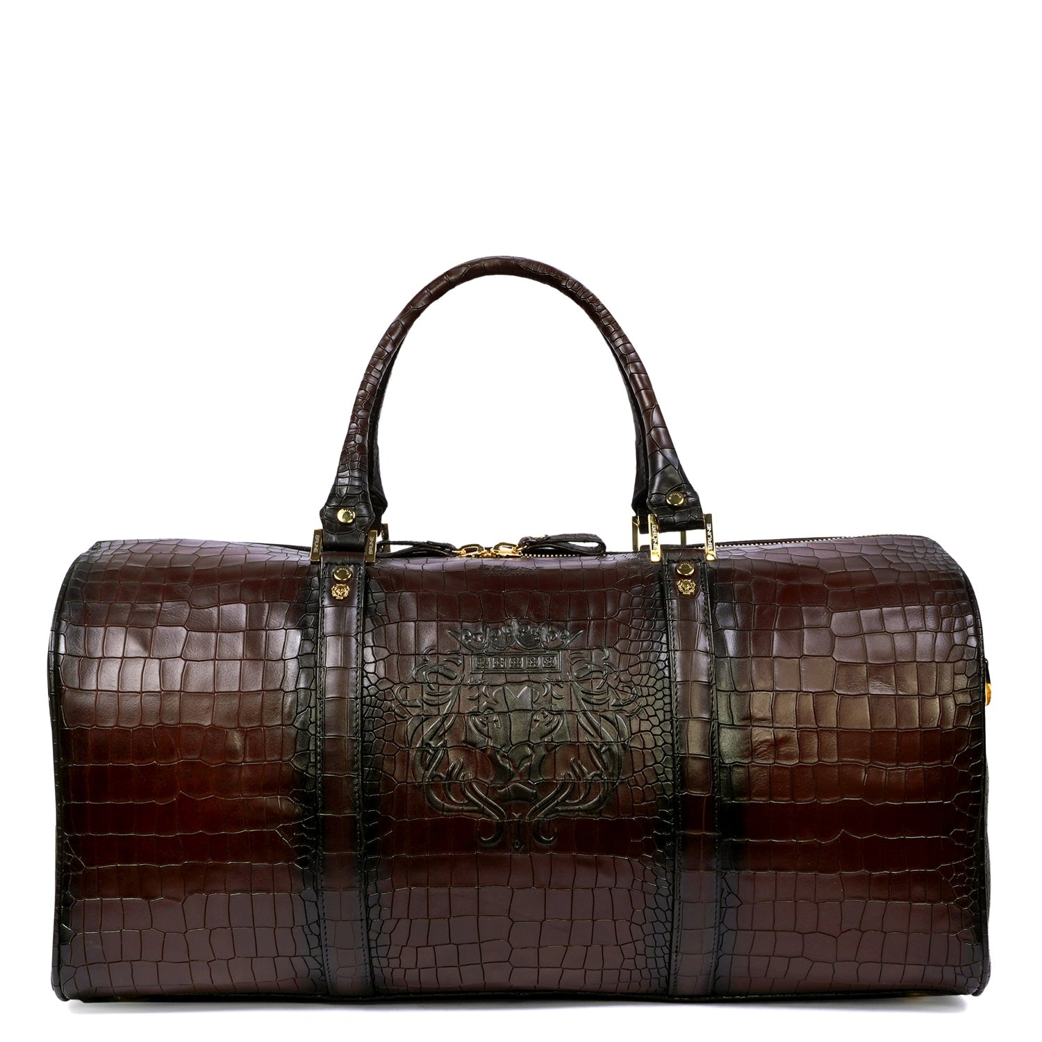 This artisanal duffle bag is expertly handcrafted with deep cut croco-embossed textured leather, resulting in a striking dark brown color and burnished patina finish. The large zipper compartment and removable adjustable shoulder strap make for a most comfortable and functional traveler's bag. Complete with a signature embossed lion logo and a mini metal lion, this bag exudes an artistic, high-end look. Plus, with our bespoke services, you can even customize the color and add your own initials for a personalized touch.