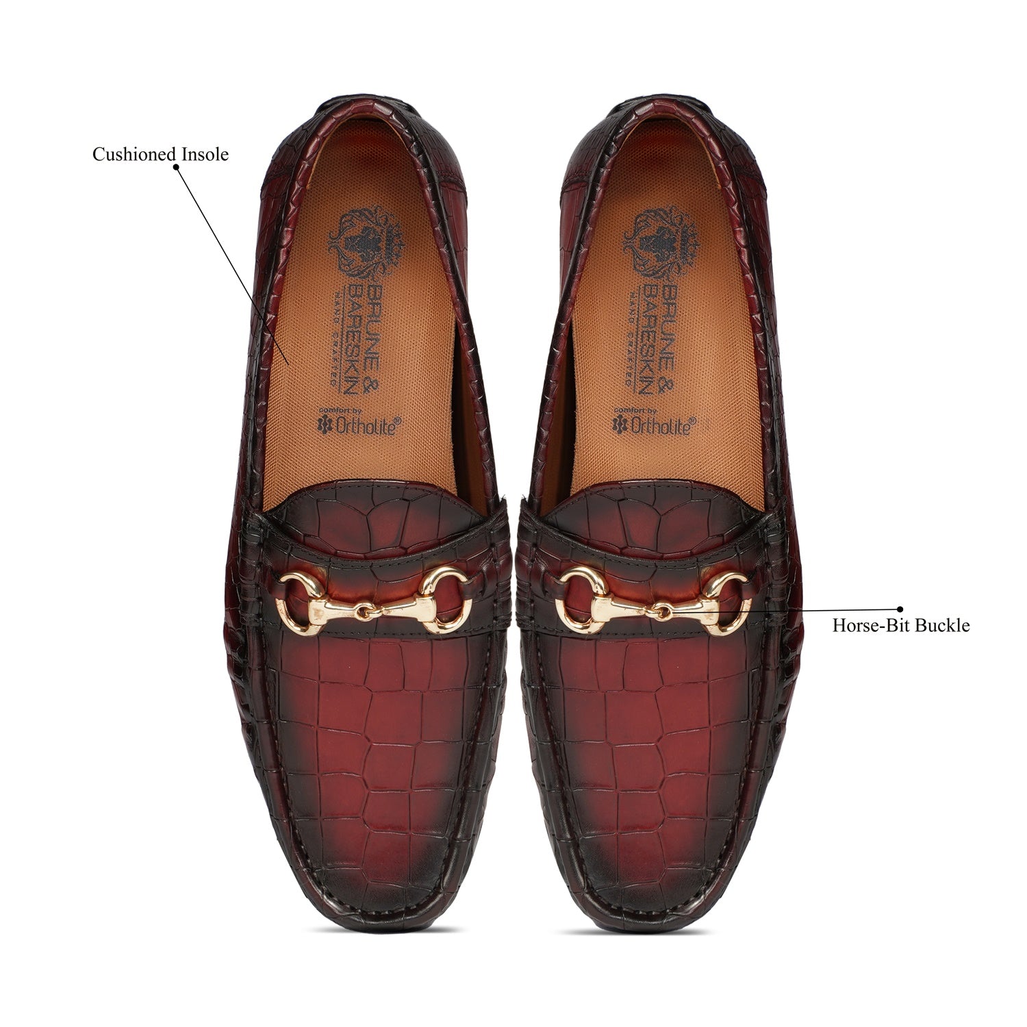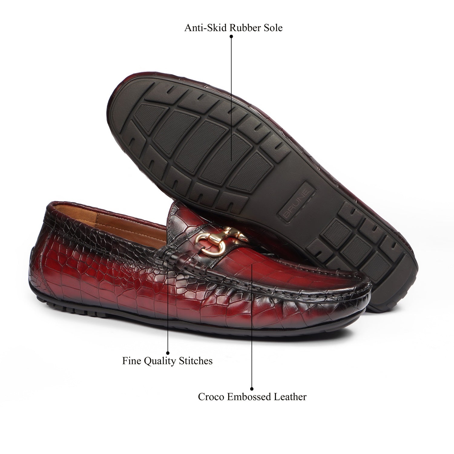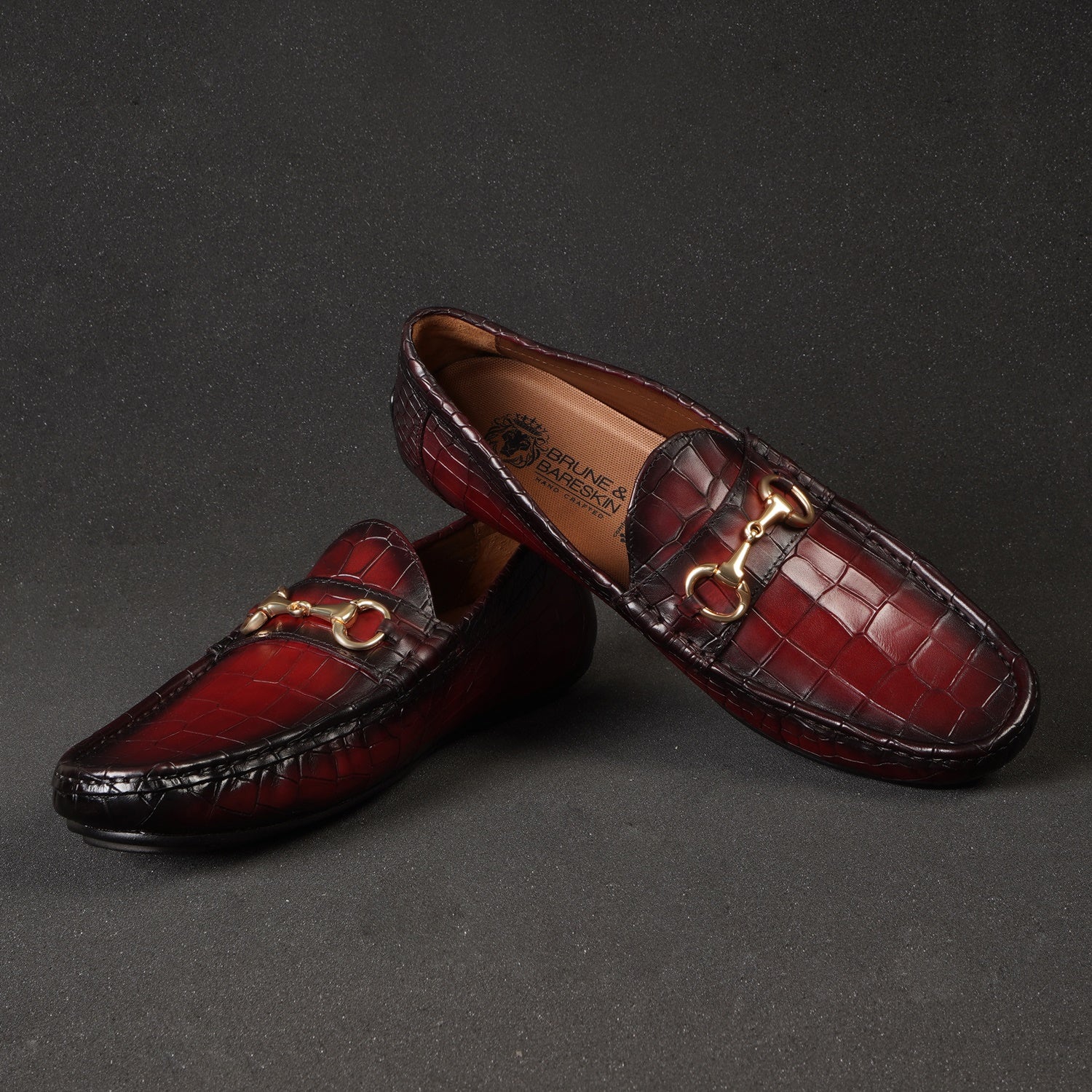 Elevate your look with our Croco Textured Driver Loafer Shoe in Wine Leather, crafted with sleek design and luxurious texture. Elevate your look with our Croco Textured Driver Loafer Shoe in Wine Leather, this shoe features an intricately textured, wine-toned leather finish that is perfect for the modern man's wardrobe. Each shoe is styled with a rubberized sole, making it comfortable for long days. The signature Brune & Bareskin brand is featured for a luxurious finish.