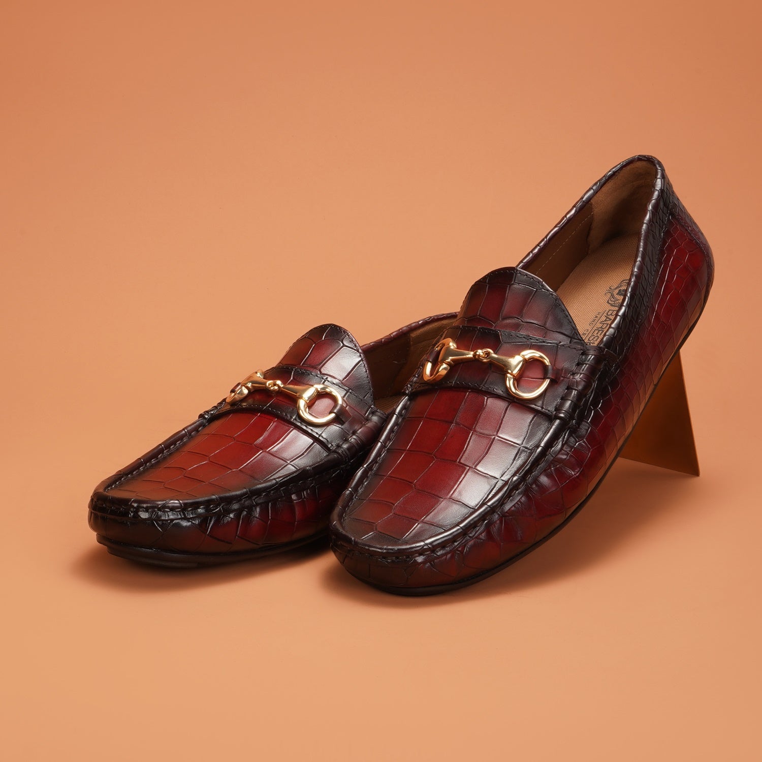 Croco Textured Driver Loafer Shoe in Wine Leather