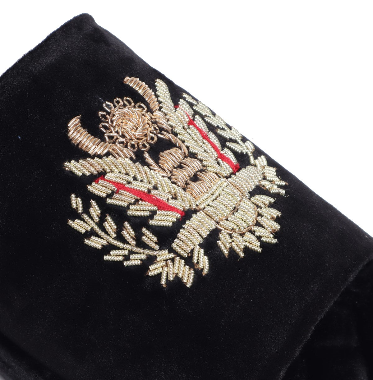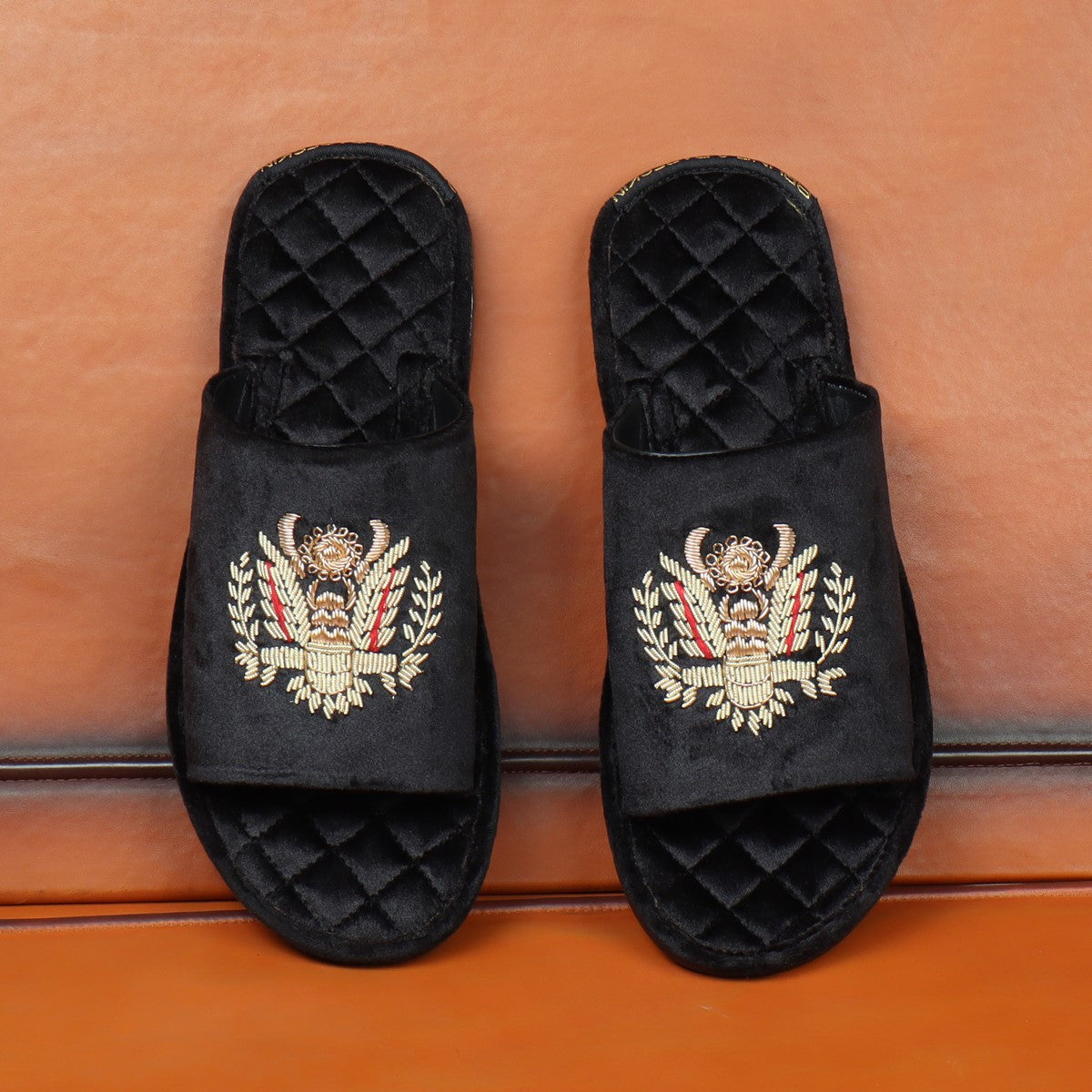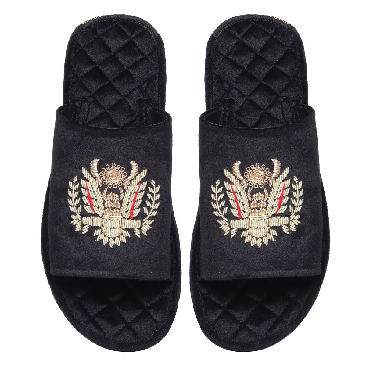 Quilted Base Slide-in Slippers with Crown Eagle Zardosi on Black Velvet
