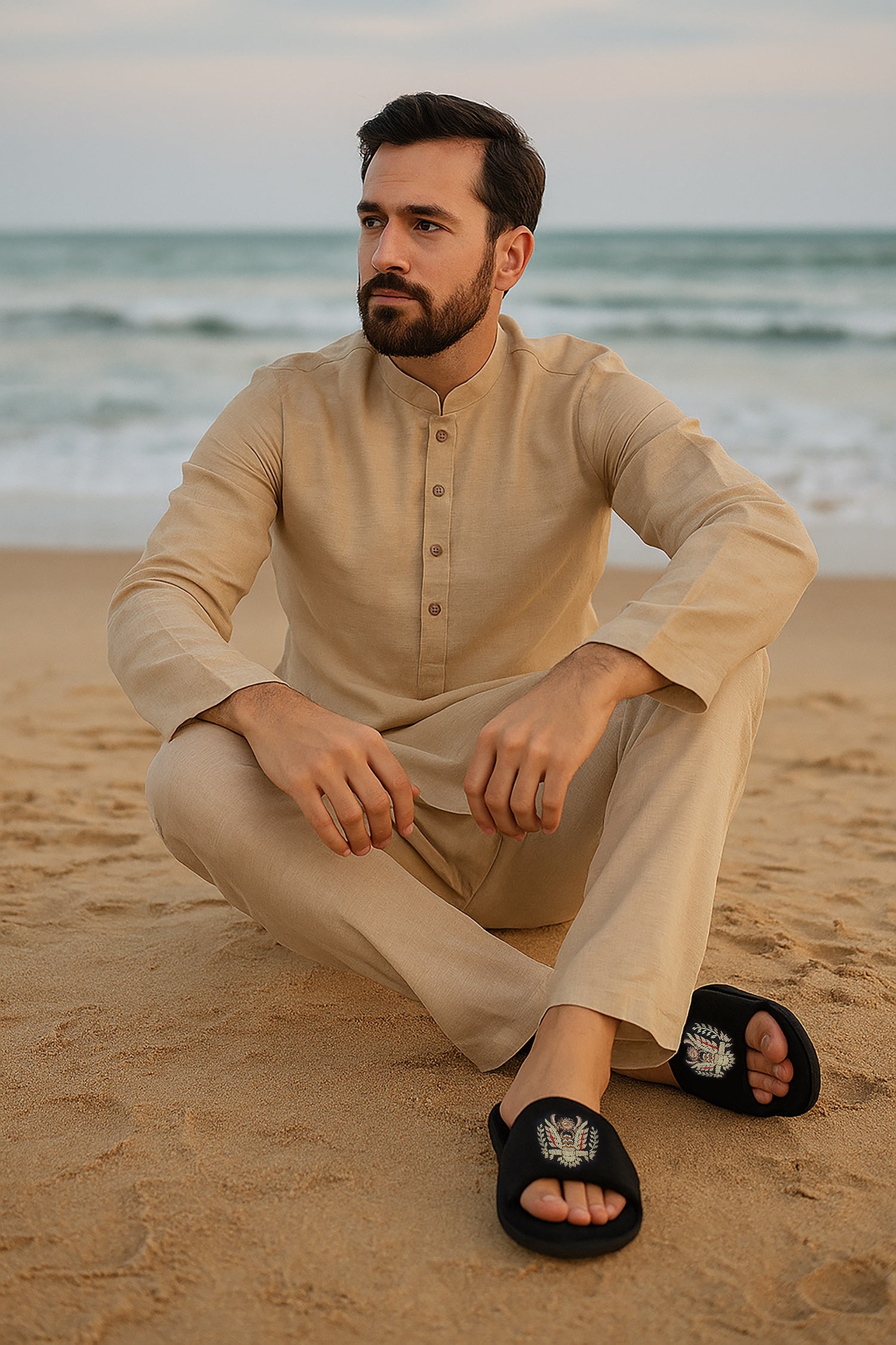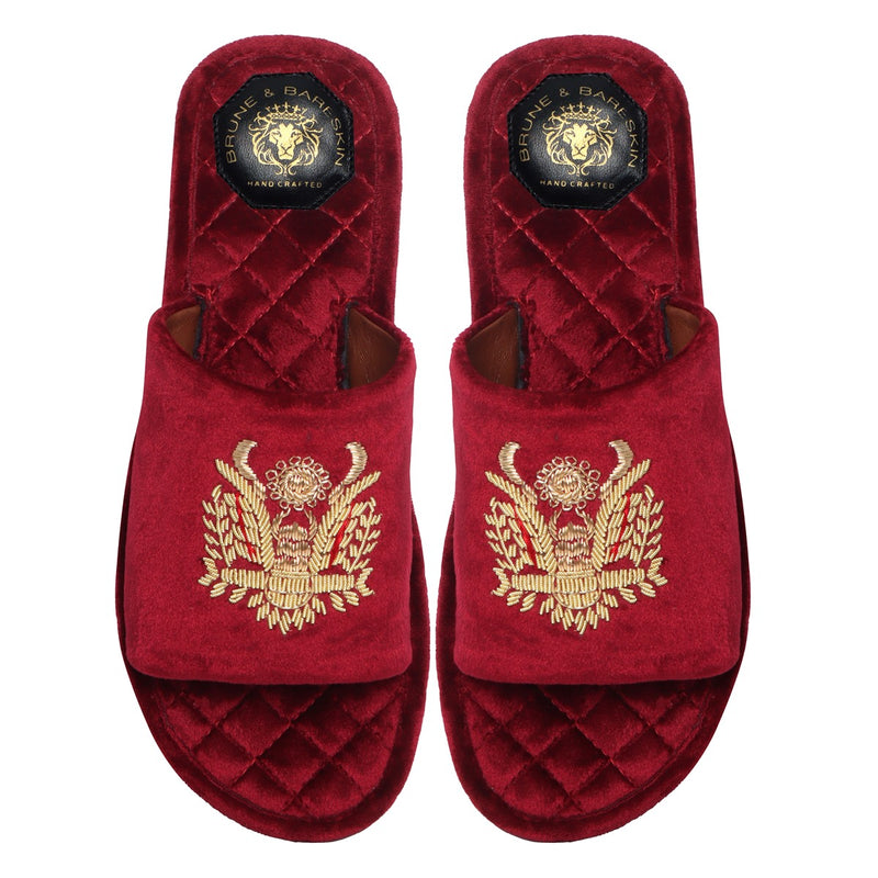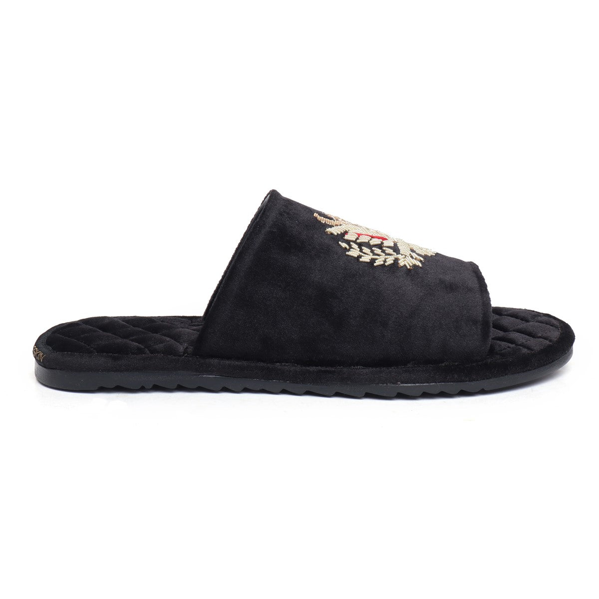 Quilted Base Slide-in Slippers with Crown Eagle Zardosi on Black Velvet