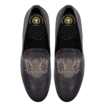 Grey Genuine Leather Slip-On Shoes with Crown Eagle Crest Zardosi For Men By Brune & Bareskin