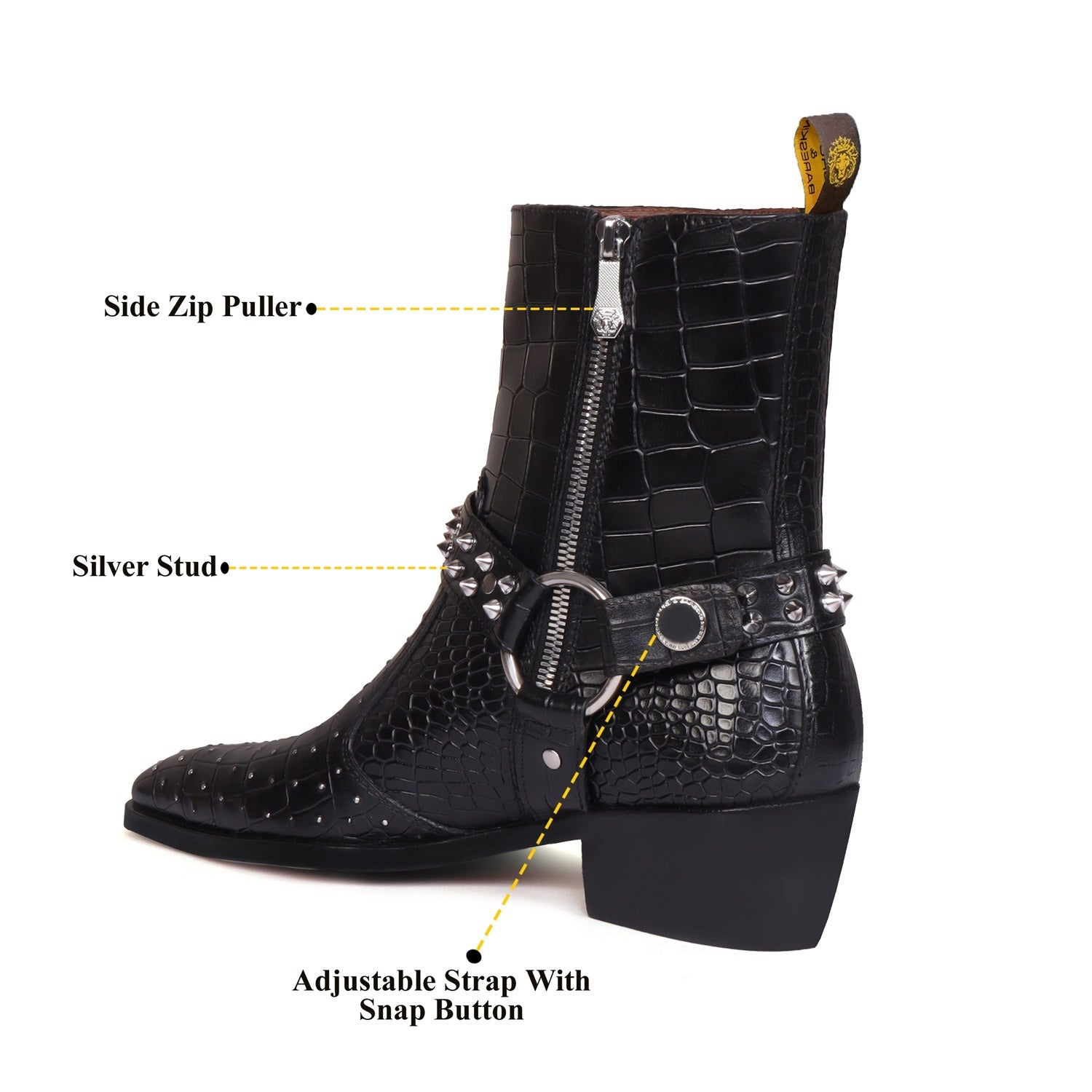 This shoe can be customized according to your liking. Black Deep Cut leather boot with Silver studs and Metal Fleck detailing makes this boot the first choice of every Fashionista. Silver studs on Cut Croco Textured leather upper provide a unique swanky look. This Shoe is entirely handcrafted by our expertise. The greater detailing of Inner side zipper closure at the ankles lend a classy look to these deep cut leather formal shoes. Fixed Stylish buckles Straps around the ankle take care of the appropriate fit and comfort. These deep cut croco textured leather ankle-length shoes are fitted to emphasize the size and shape of your feet to perfection. These boots provide the distinct and sassy look. They are easy to team with formal trousers as they blend well with the classic fabrics as well as the modern blended synthetic fabric pants, slacks and trousers. The leather sole and Cuban heel adds the extra elegance to it. You can customize this chic boots in any of your favorite color with our bespoke services.