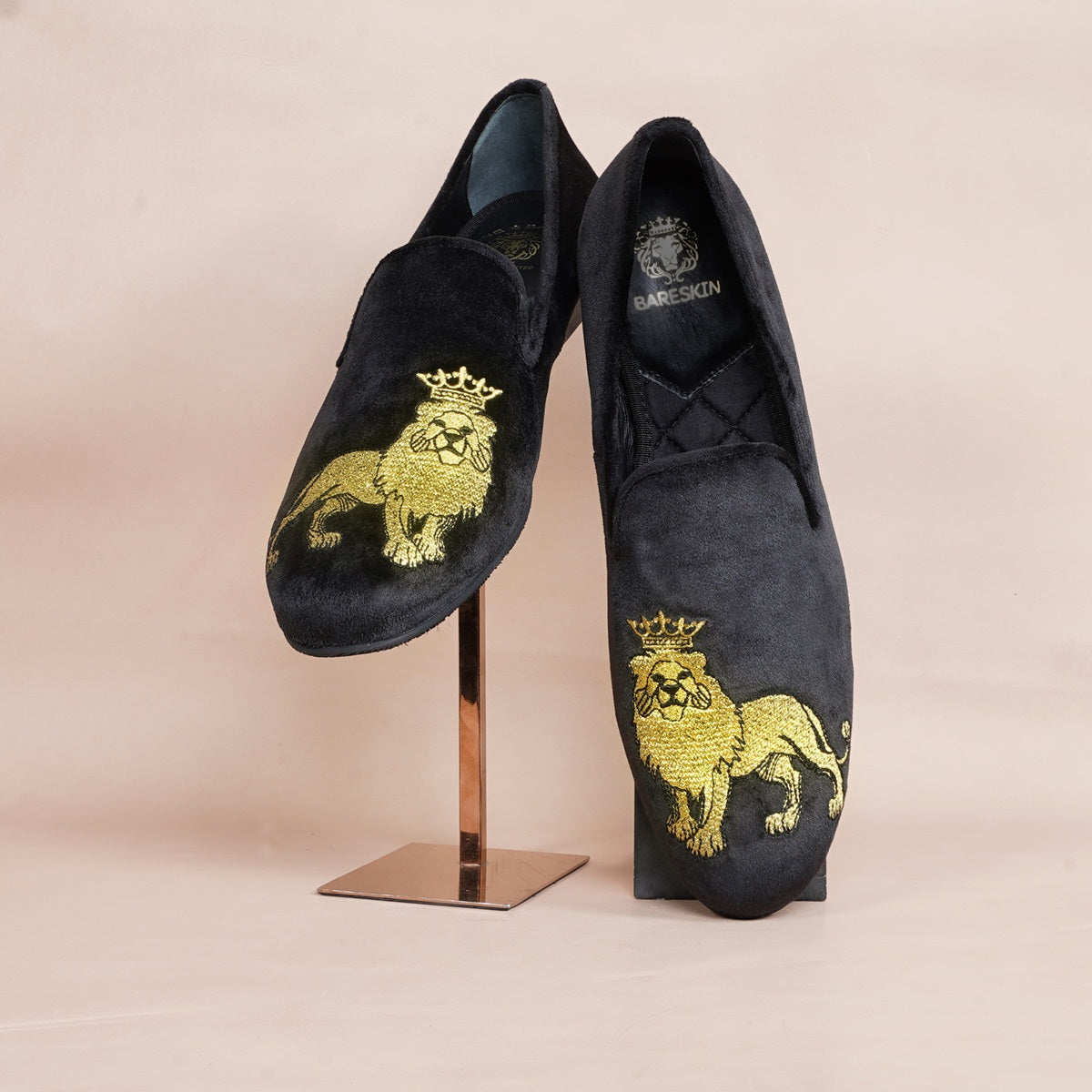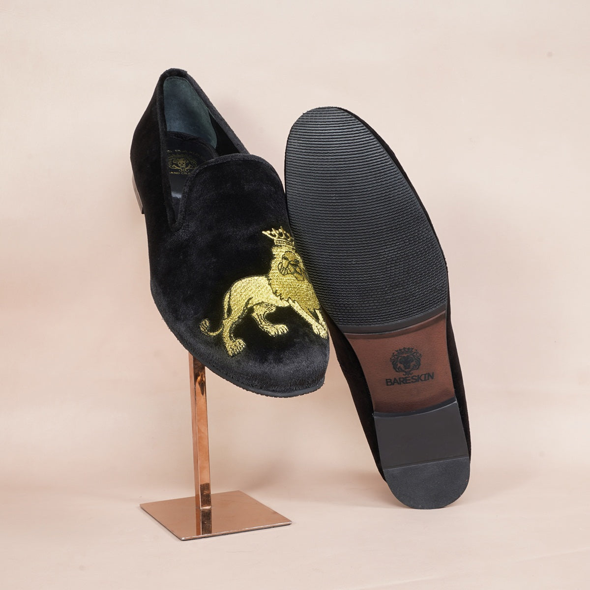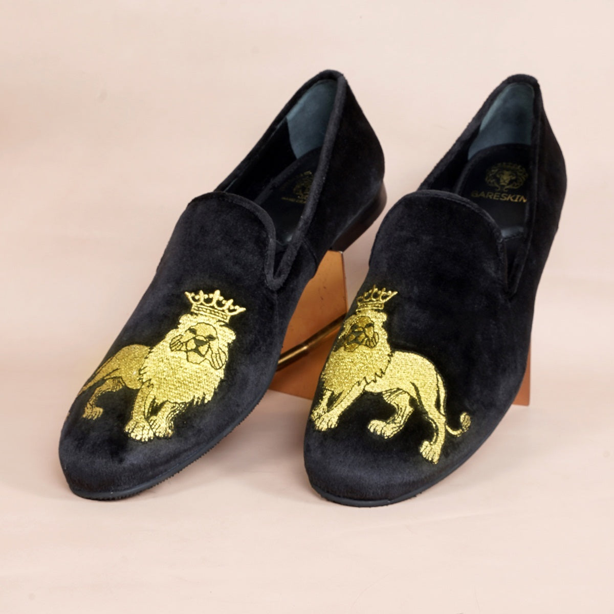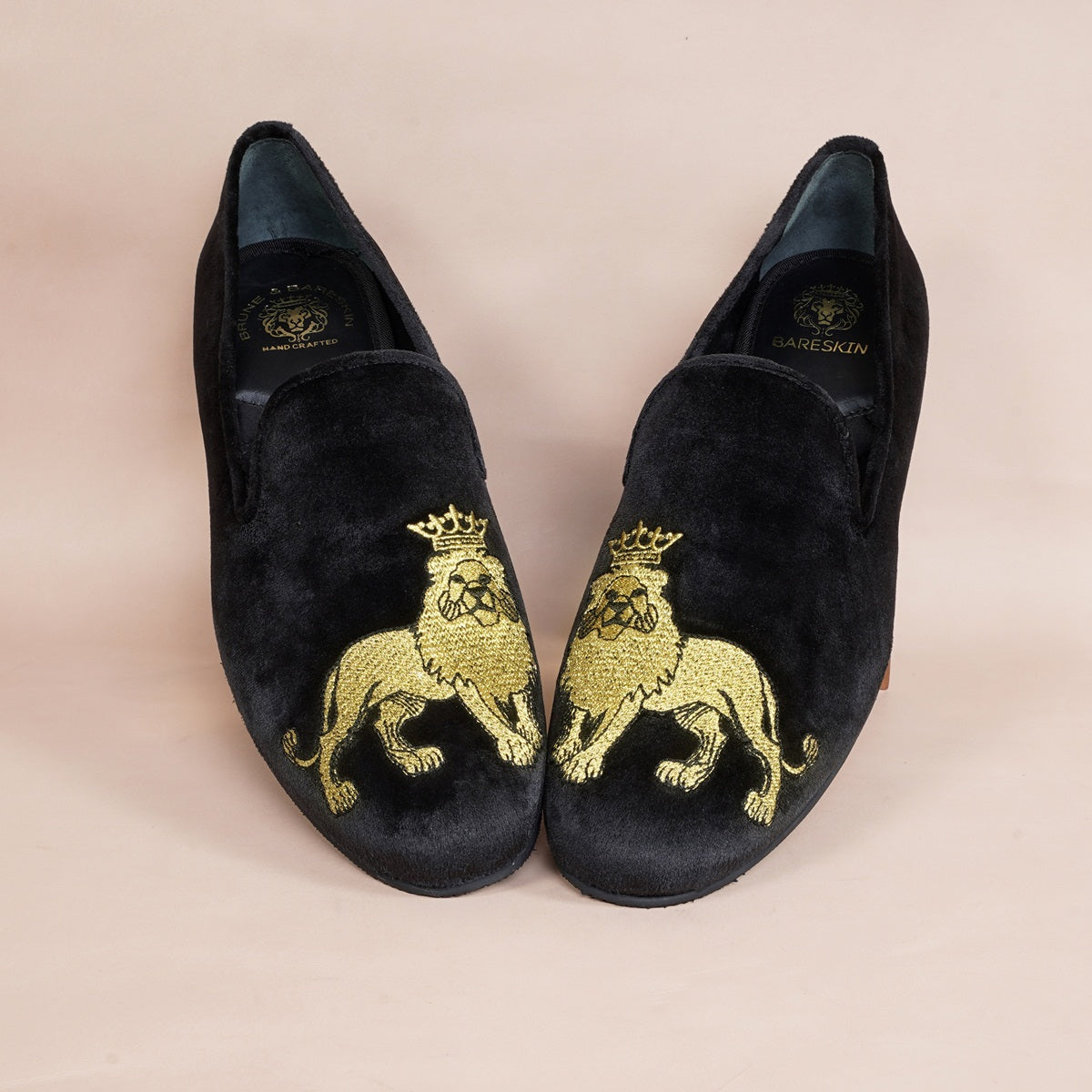 Elevate your luxury wardrobe with these custom-made, handcrafted black velvet slip-on shoes for men. Crafted from Italian velvet and a super soft insole, these shoes feature a unique embroidered lion design on the upper side, and an anti-skid rubber sole to provide perfect grip. Perfect for special occasions, these Brune & Bareskin shoes are an exclusive addition to any wardrobe.