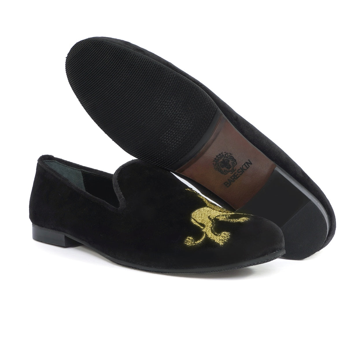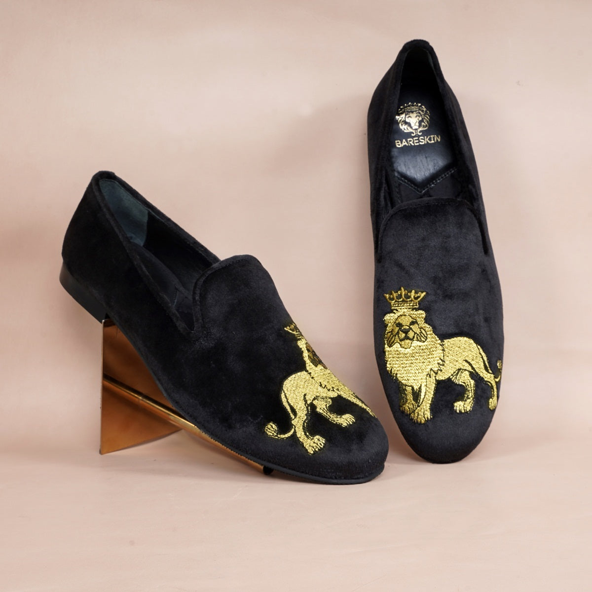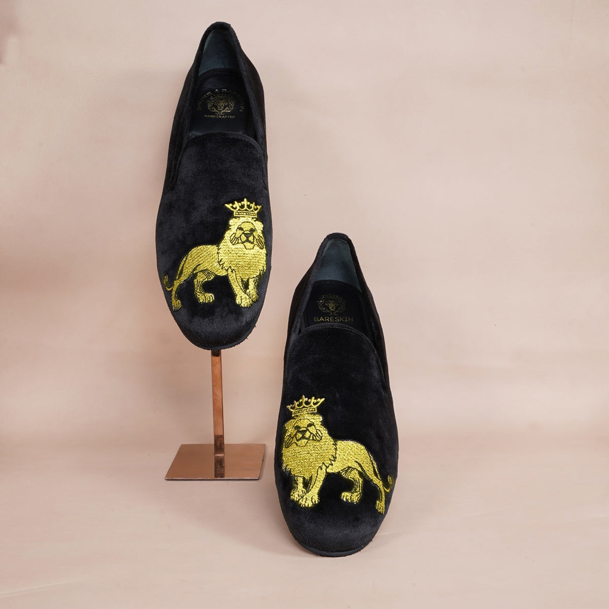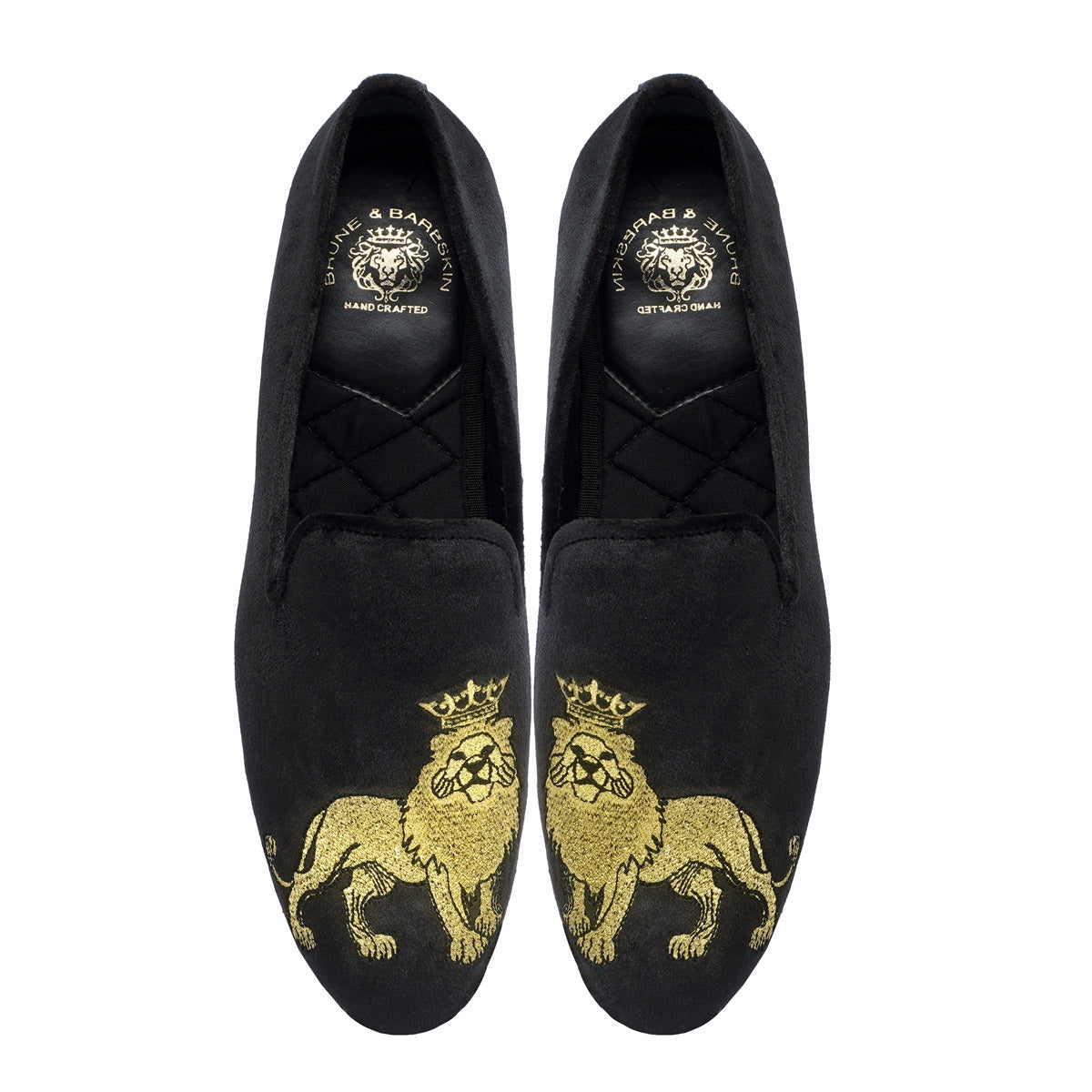 Elevate your luxury wardrobe with these custom-made, handcrafted black velvet slip-on shoes for men. Crafted from Italian velvet and a super soft insole, these shoes feature a unique embroidered lion design on the upper side, and an anti-skid rubber sole to provide perfect grip. Perfect for special occasions, these Brune & Bareskin shoes are an exclusive addition to any wardrobe.