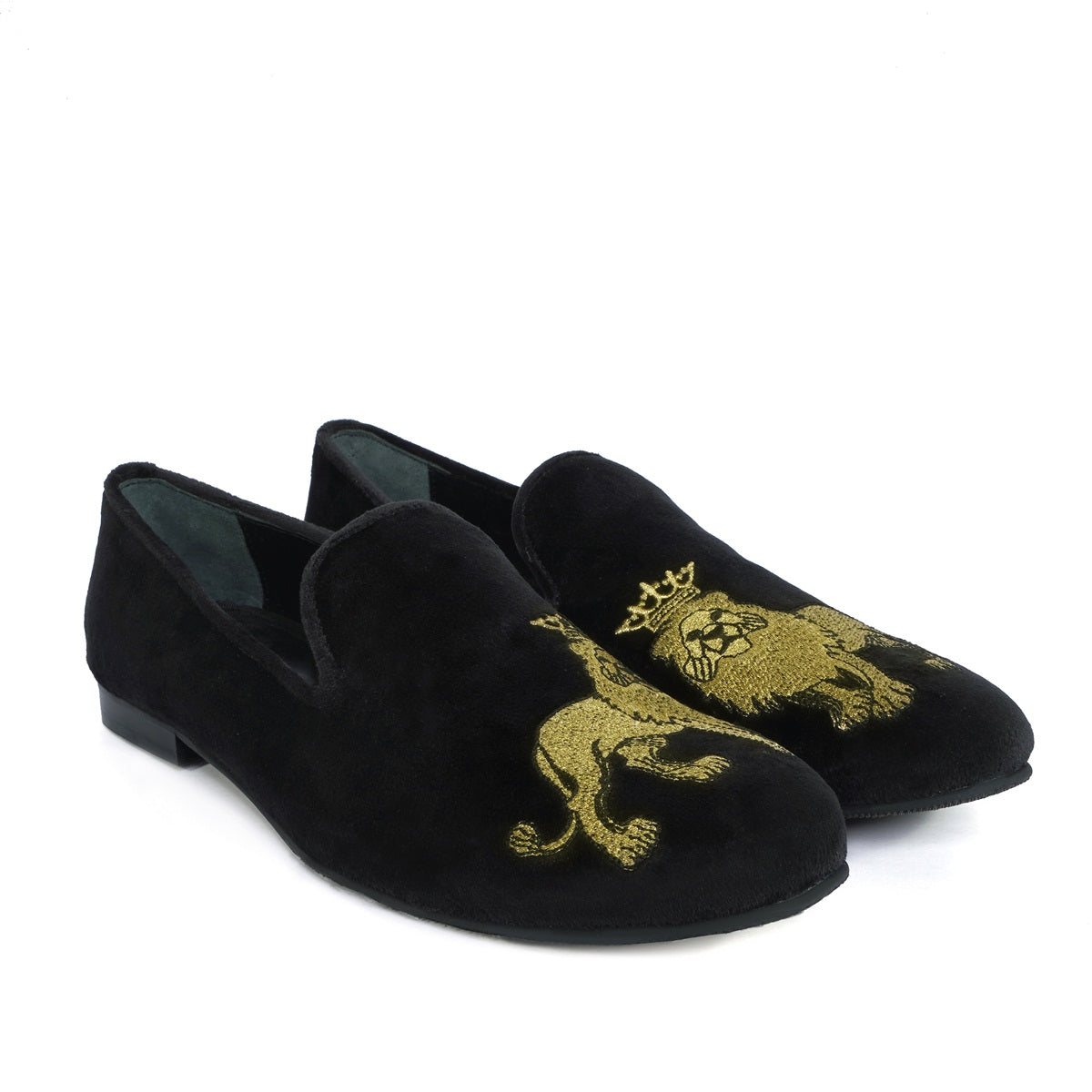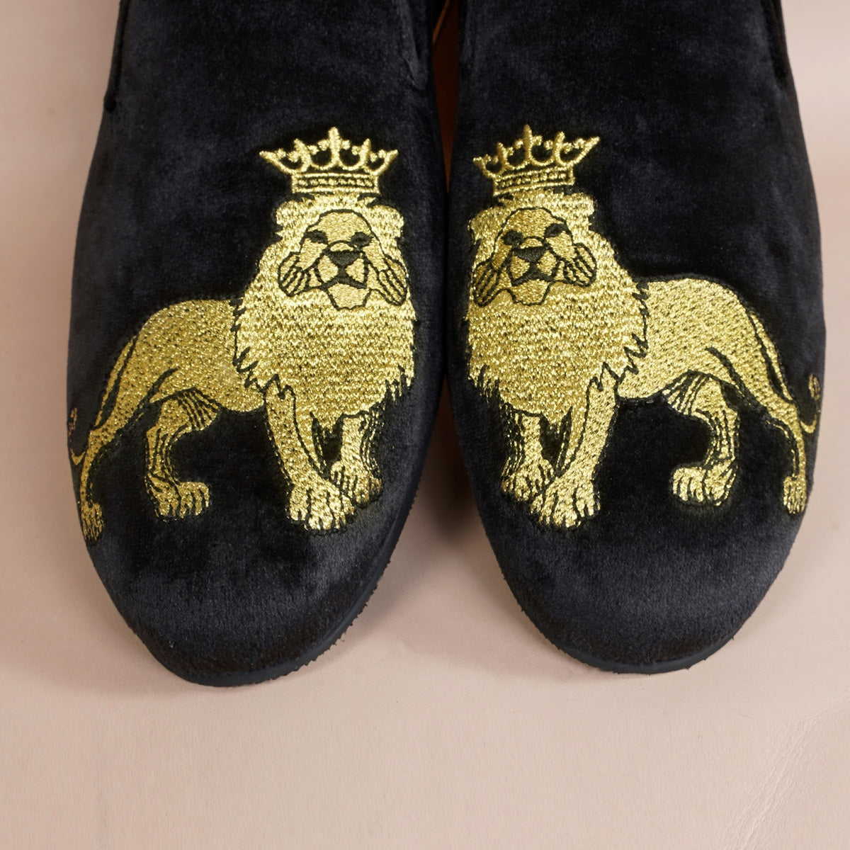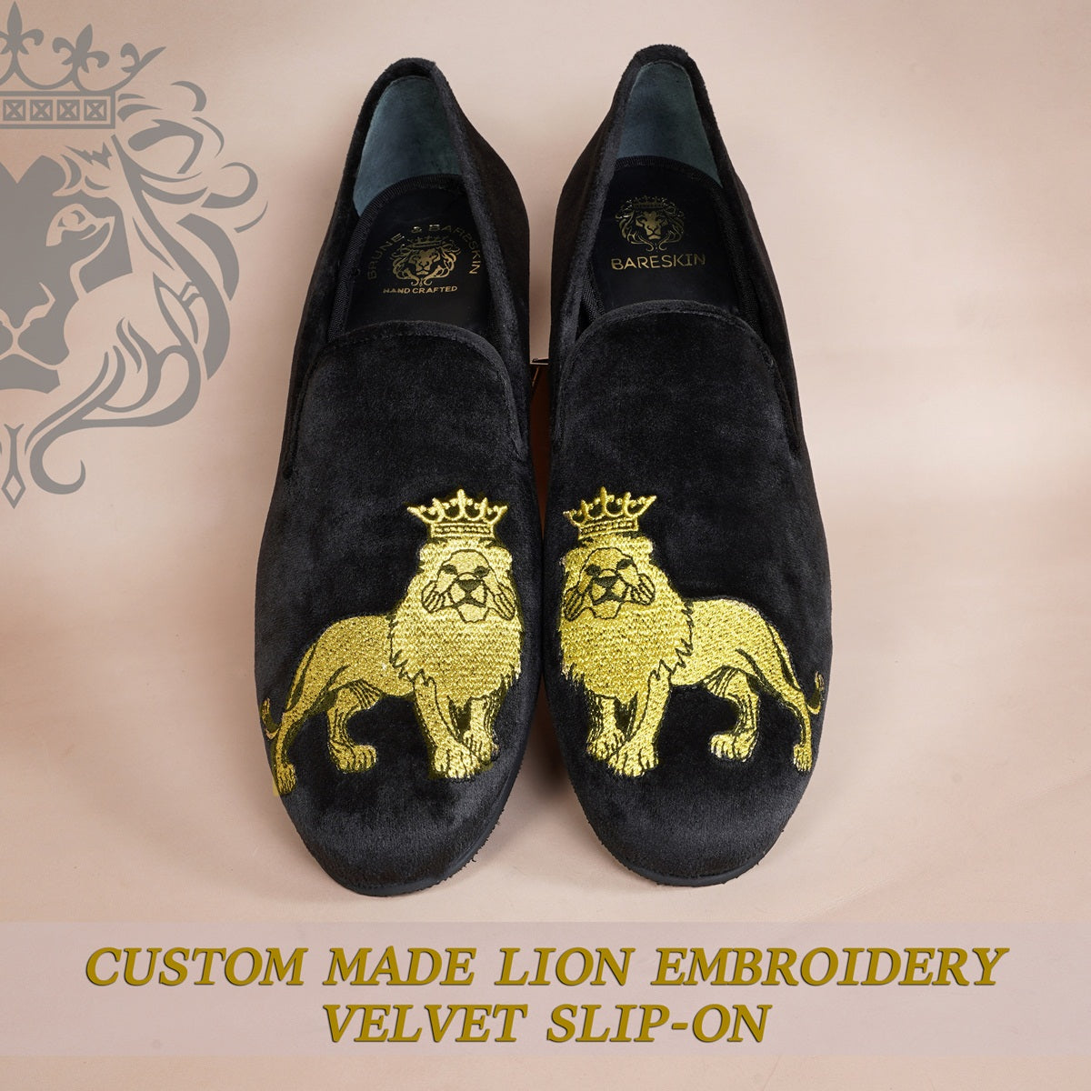 Custom Made Embroidered Lion Black velvet Slip-On Shoes for Men