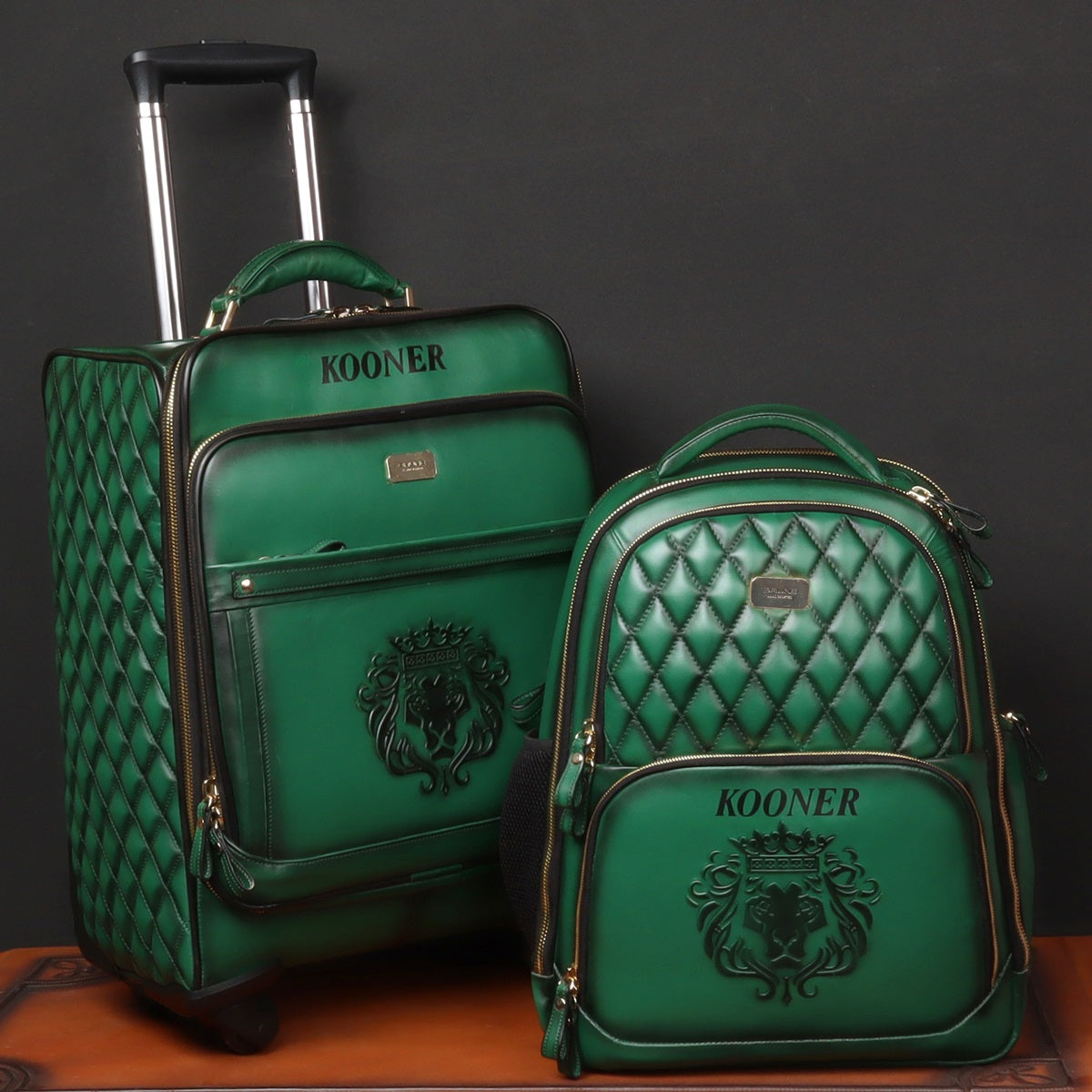 Customised Combo of Green Leather Trolly Bag & Backpack With Initials KOONER by Brune & Bareskin