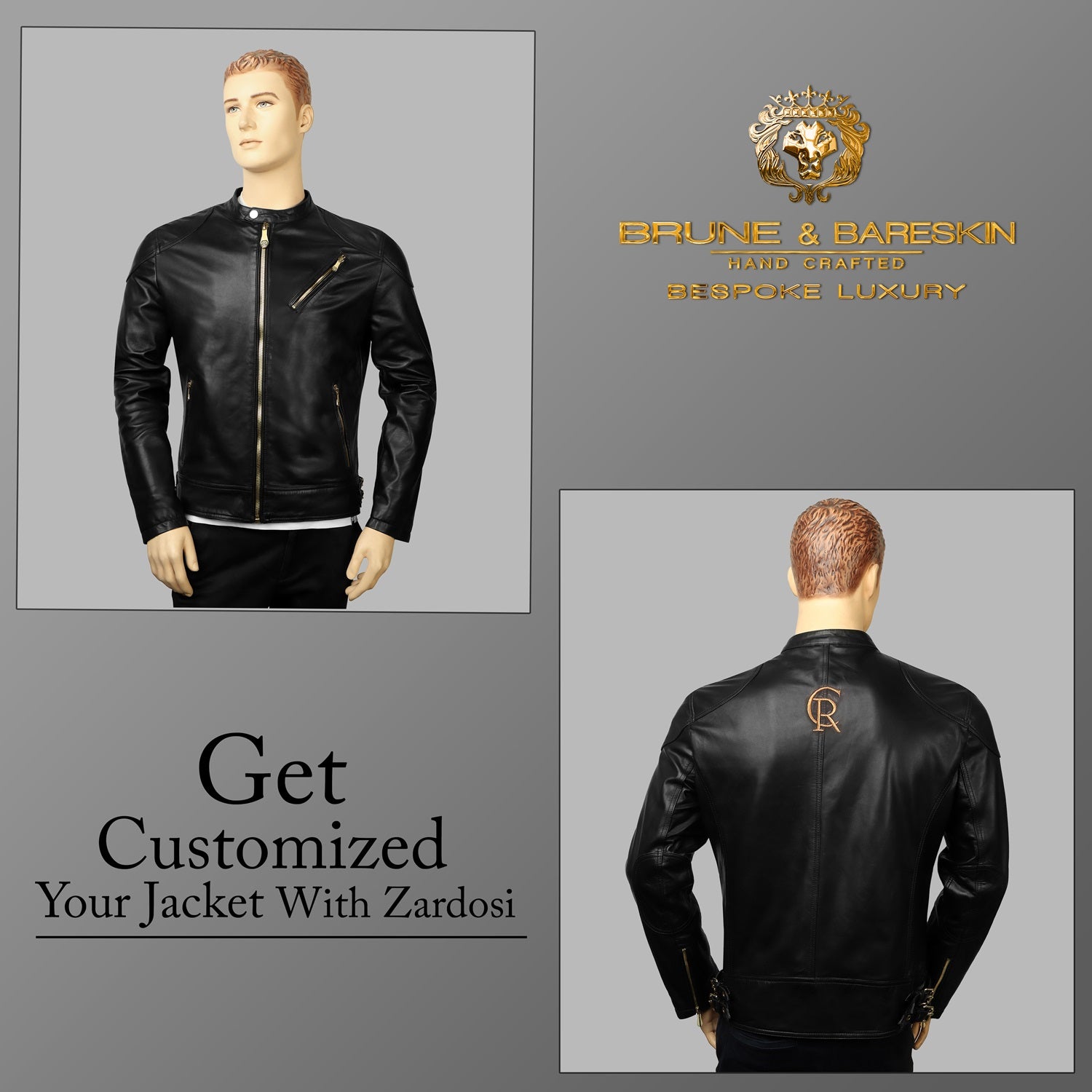 Customized "CR" Zardosi Initial Zip Closure Black Genuine Leather Biker Jacket by Brune & Bareskin