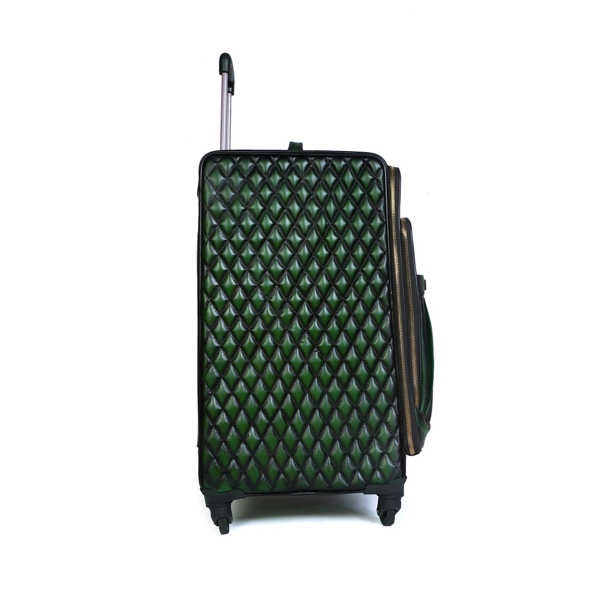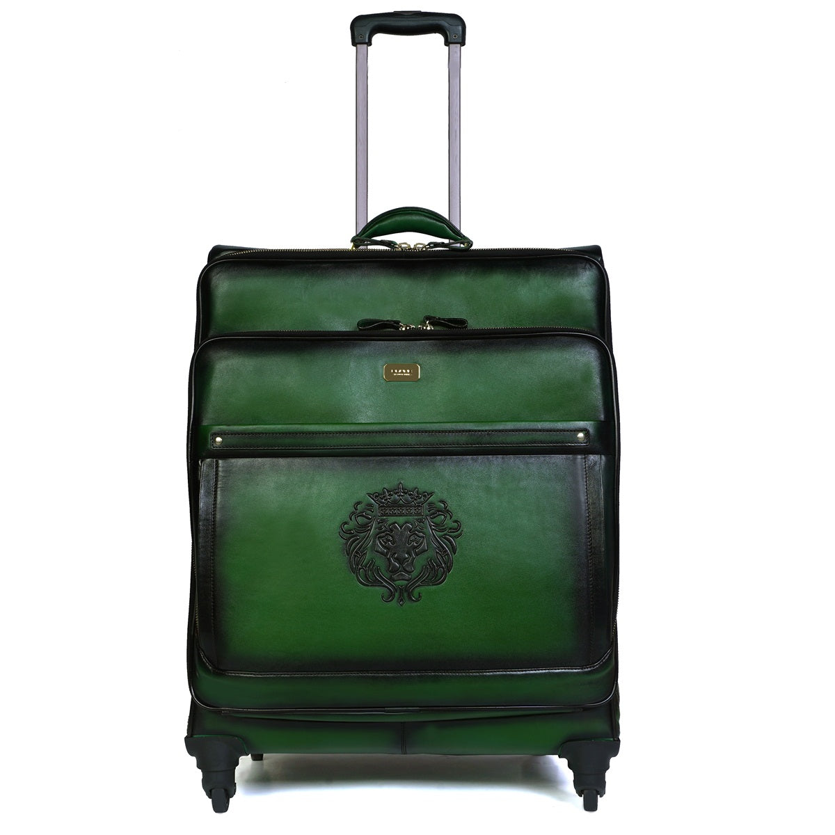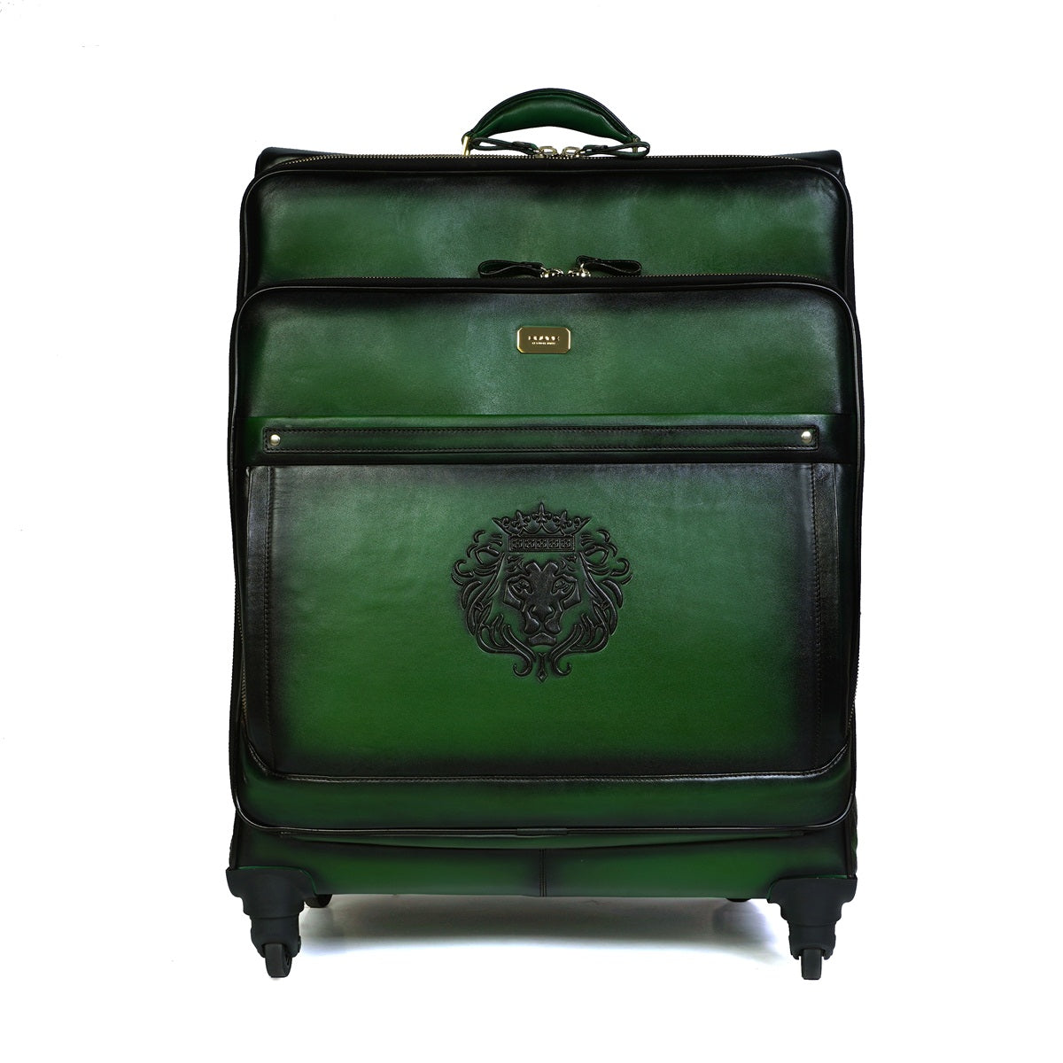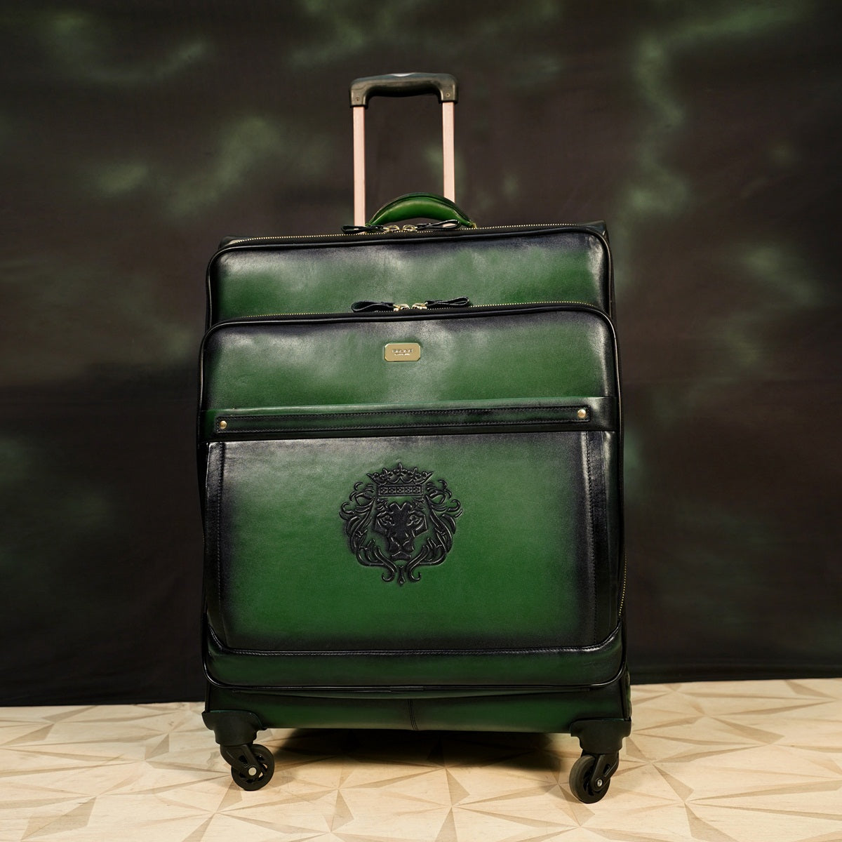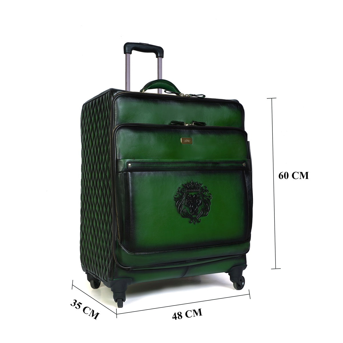 Travel in style with this Customized Extra Large Strolley Bag in Green Genuine Leather. Boasting a green color and side stitched diamond pattern, this brune & bareskin branded bag is made of genuine leather and comes with a customizable extra large size, complete with a padded laptop sleeve. Multiple zipper compartments and small pockets provide ample storage, while a telescopic handle and embossed lion logo on the front make this an effortlessly stylish choice. Wherever you go, make a statement with this high-quality bag!