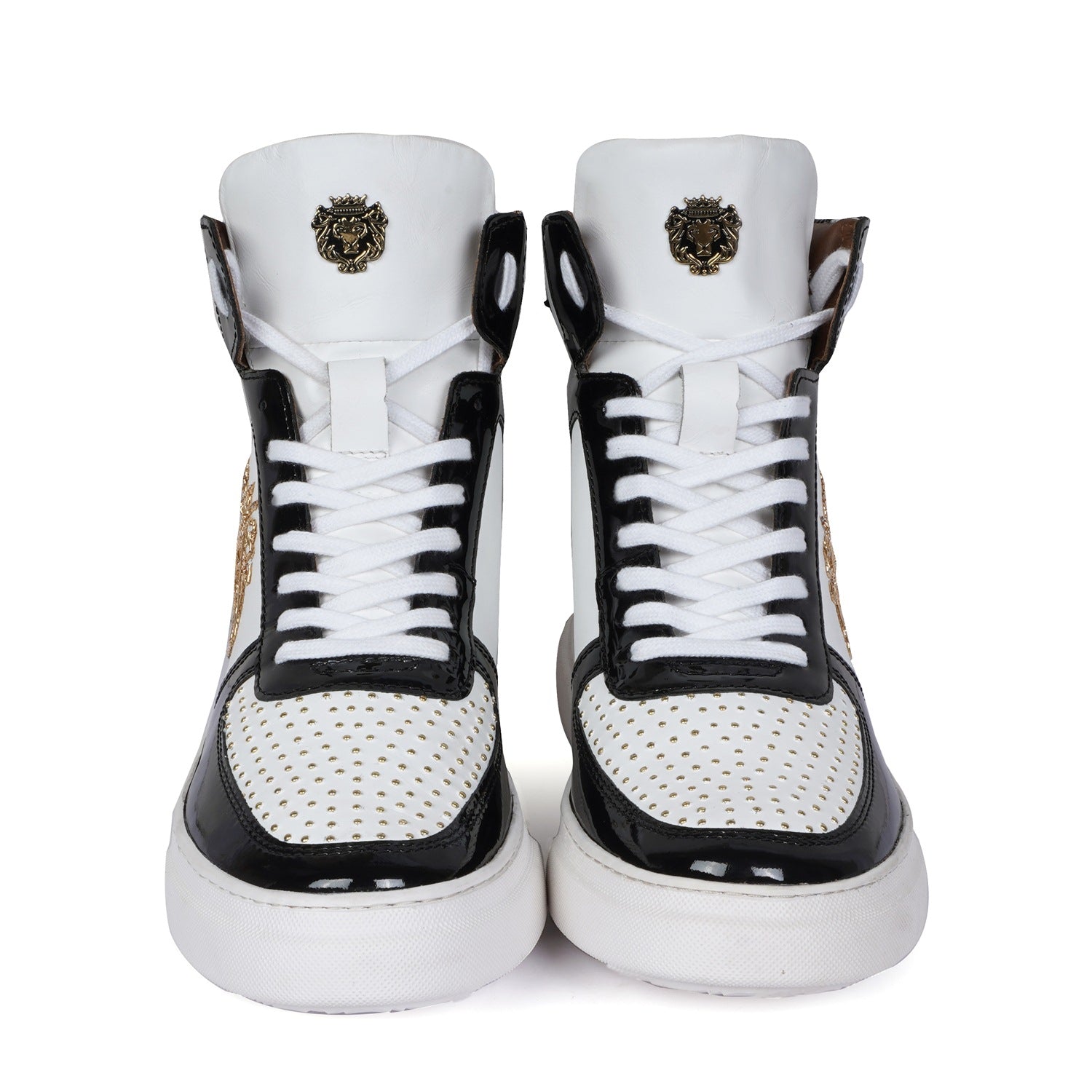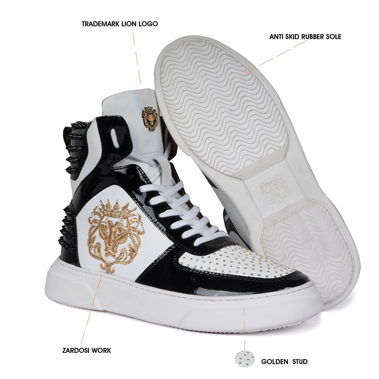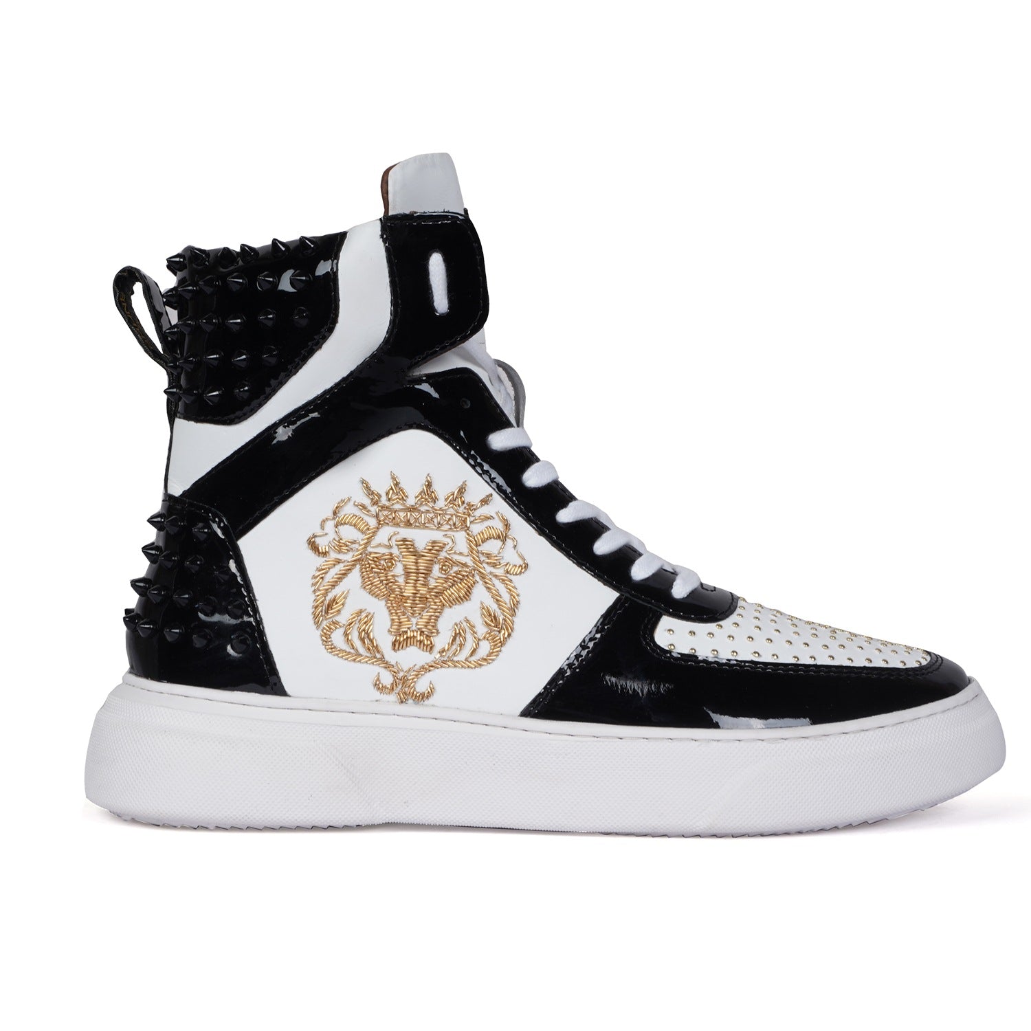 Expertly handcrafted with the highest quality genuine leather materials, this Customized "Zardosi Lion" High Top Sneaker from Brune & Bareskin is a true masterpiece. The iconic hand zardosi signature lion logo, complemented by contrasting black studs and patent leather, adds an artistic touch. With extra padding on the collar and a lace-up design for a perfect fit, this shoe also features a rubberized sole for superior grip. Elevate your style with this unique and luxurious high top sneaker.