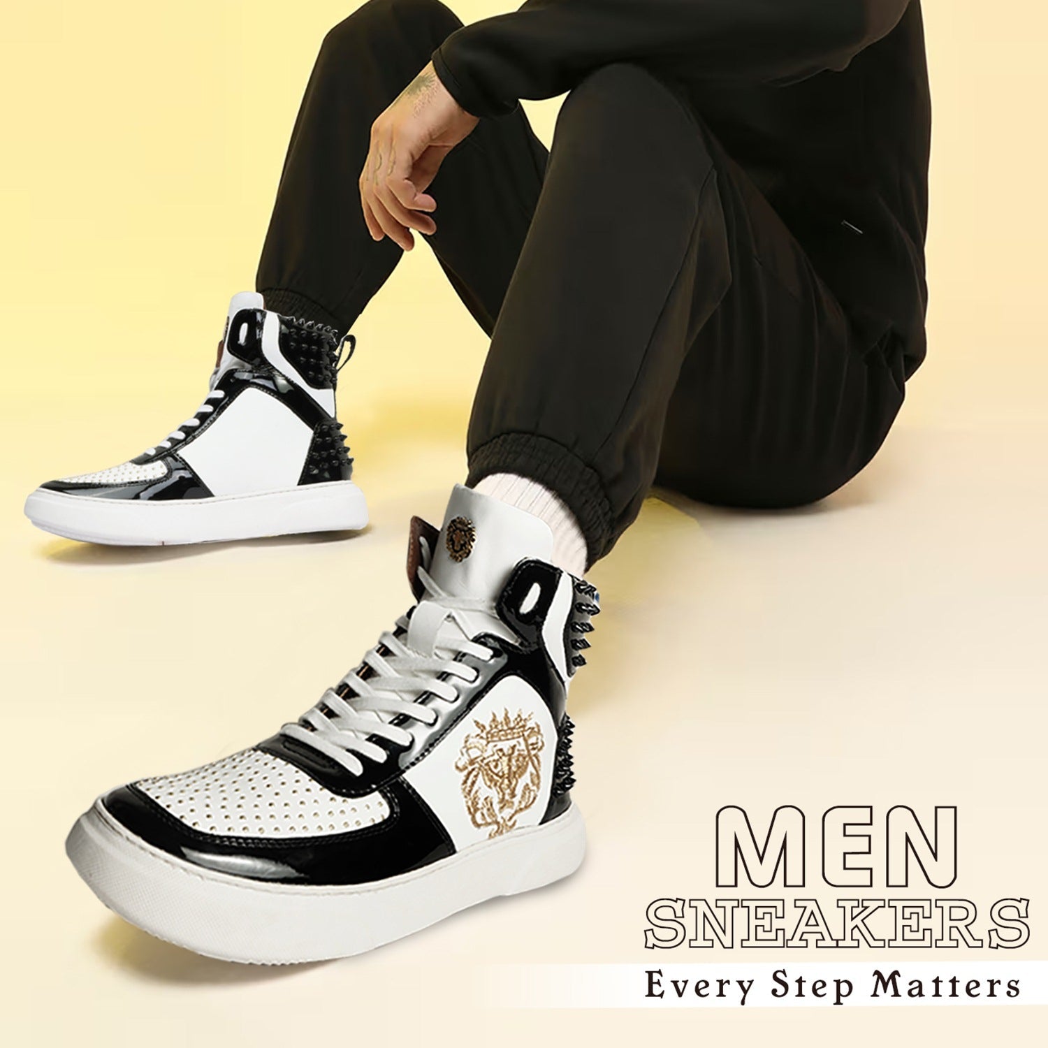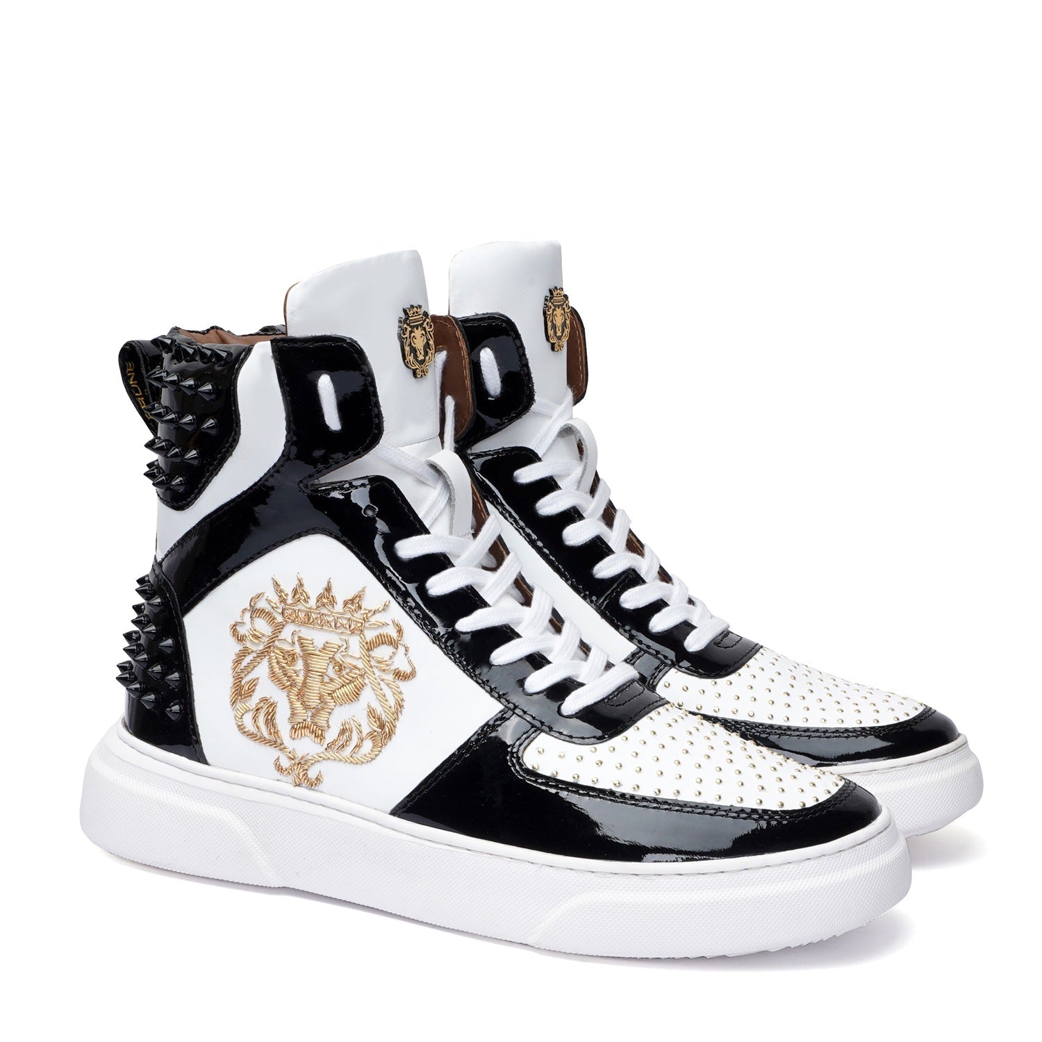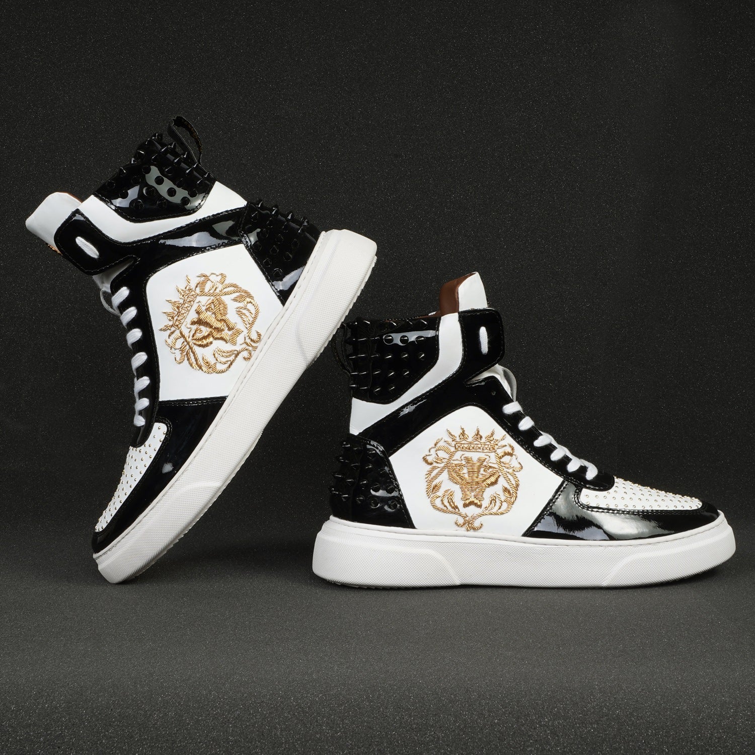 Expertly handcrafted with the highest quality genuine leather materials, this Customized "Zardosi Lion" High Top Sneaker from Brune & Bareskin is a true masterpiece. The iconic hand zardosi signature lion logo, complemented by contrasting black studs and patent leather, adds an artistic touch. With extra padding on the collar and a lace-up design for a perfect fit, this shoe also features a rubberized sole for superior grip. Elevate your style with this unique and luxurious high top sneaker.