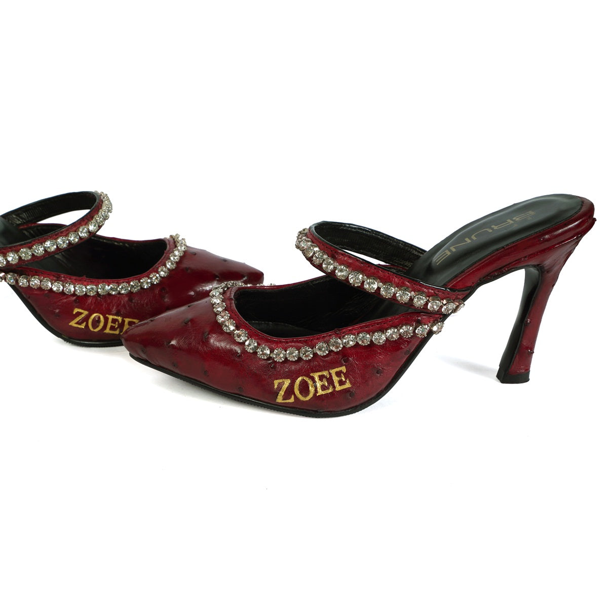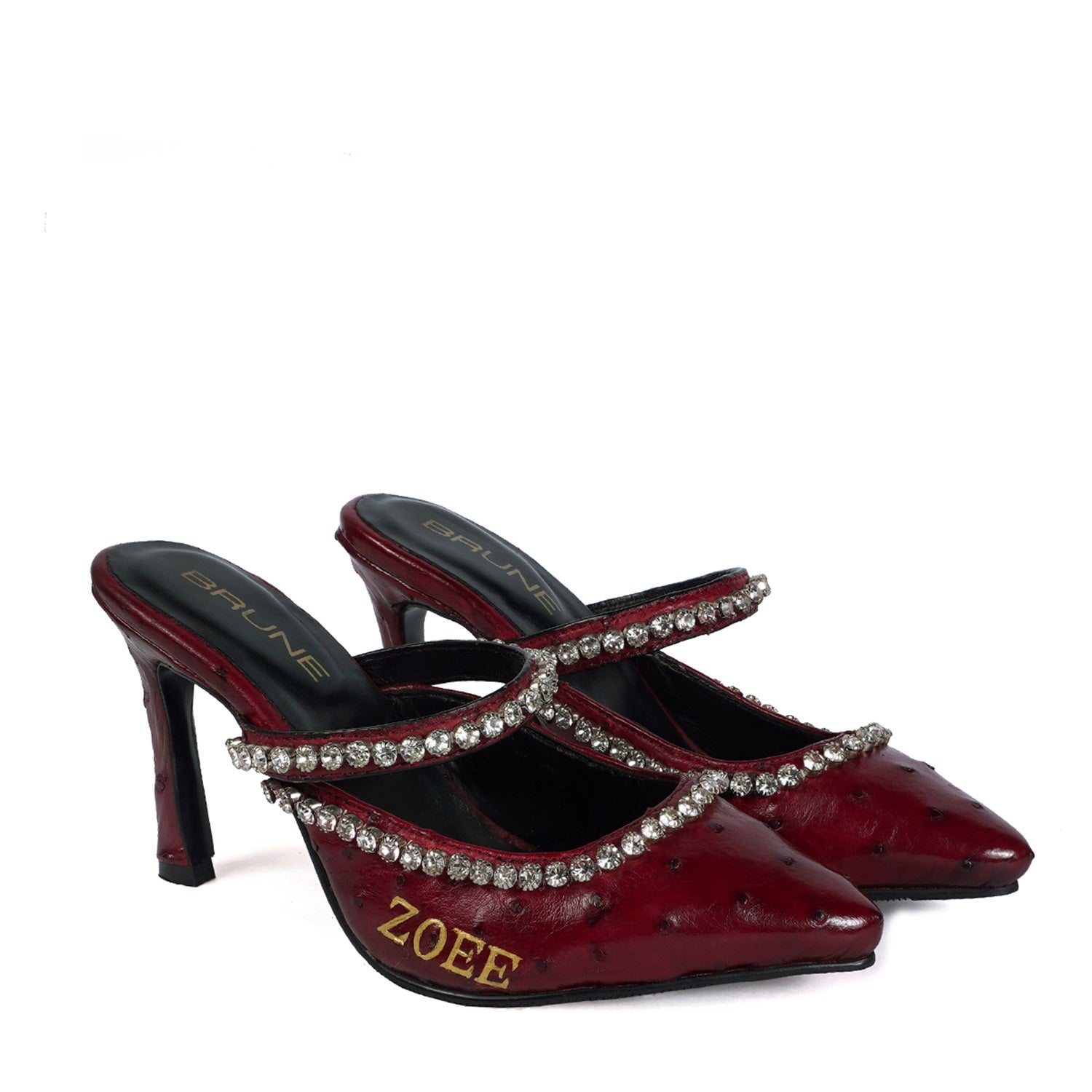 Luxuriously crafted to perfectly accent any special occasion look, our Customized "ZOEE" Name initial Heel Pumps Stiletto Pencil Heel in Wine Real Ostrich Leather are the perfect addition to any wardrobe. Beautiful wine color and brune & bareskin Brand make it stand out. An exclusive embossed customized name initial makes them truly your own. A pair of wine real ostrich leather Heel Pumps ,has regular ankle and open back embellished upper with western - embellished. Exquisite and exotic real ostrich leather gives a glamorous touch, while the pointed toe and a slim 90mm stiletto pencil heel add a touch of sophistication. Plus, the rubberized sole ensures a secure grip, and the crystal stone embellishment adds a magnificent finish. For those special moments, why not treat your lady in life to these exquisite designer shoes?