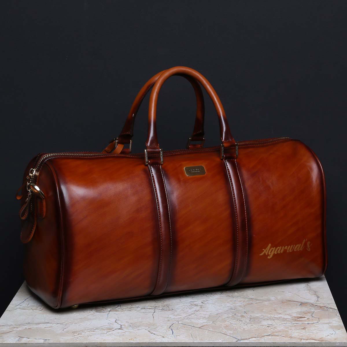 Crafted Tan Leather Duffle Bag with Name Initials AGARWAL'S by Brune & Bareskin