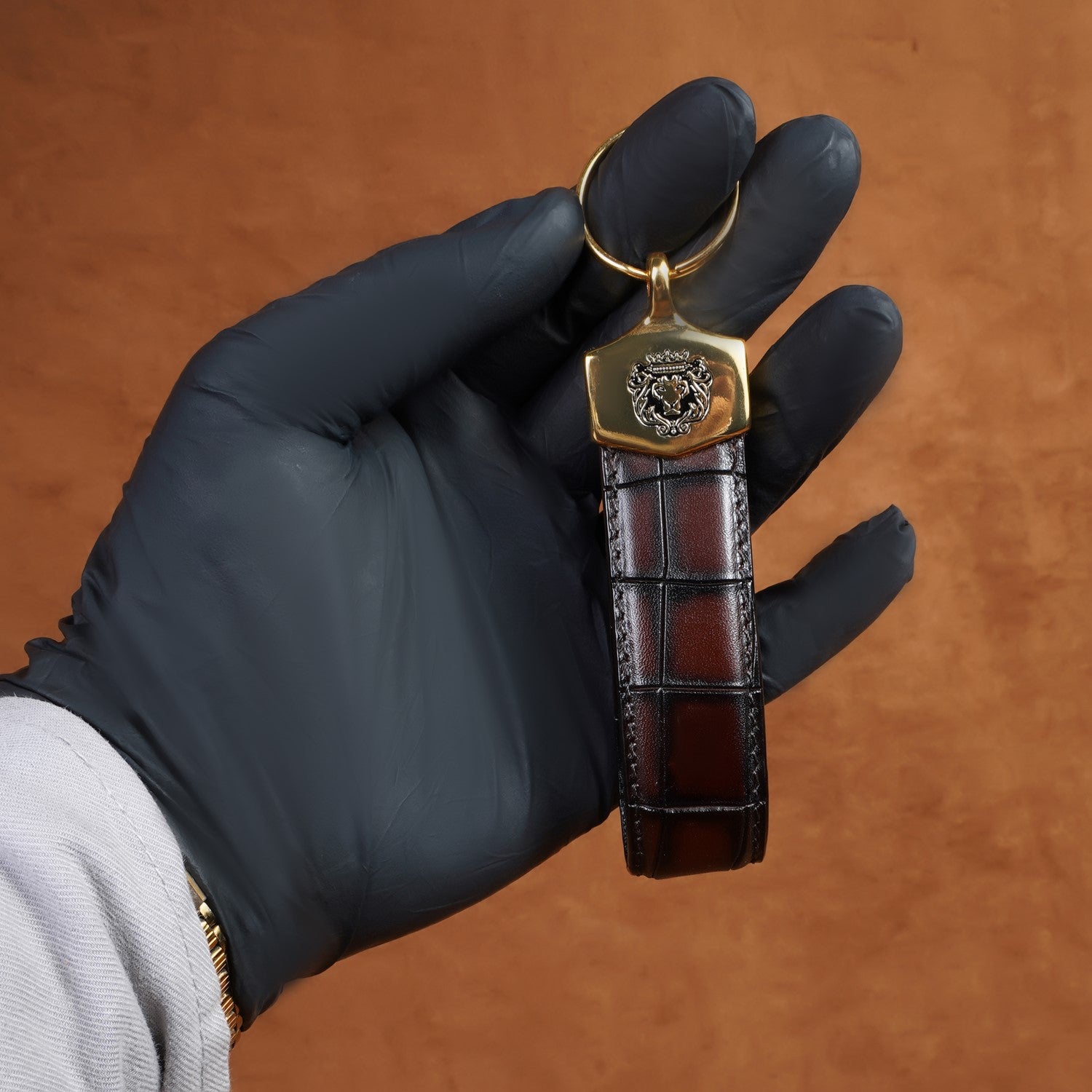 This cut croco leather keychain is a fascinating travel accessory. The dark brown in deep cut leather provides a very chic look. The gold finish fittings compliments its overall color. Brune & Bareskin signature lion logo on the center looks very elegant. You can also get it customized especially for you with your name initials and favorite color.
