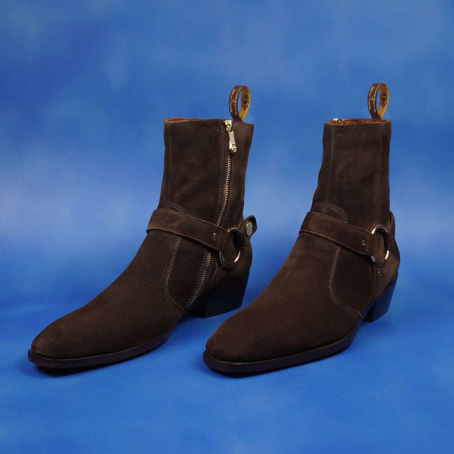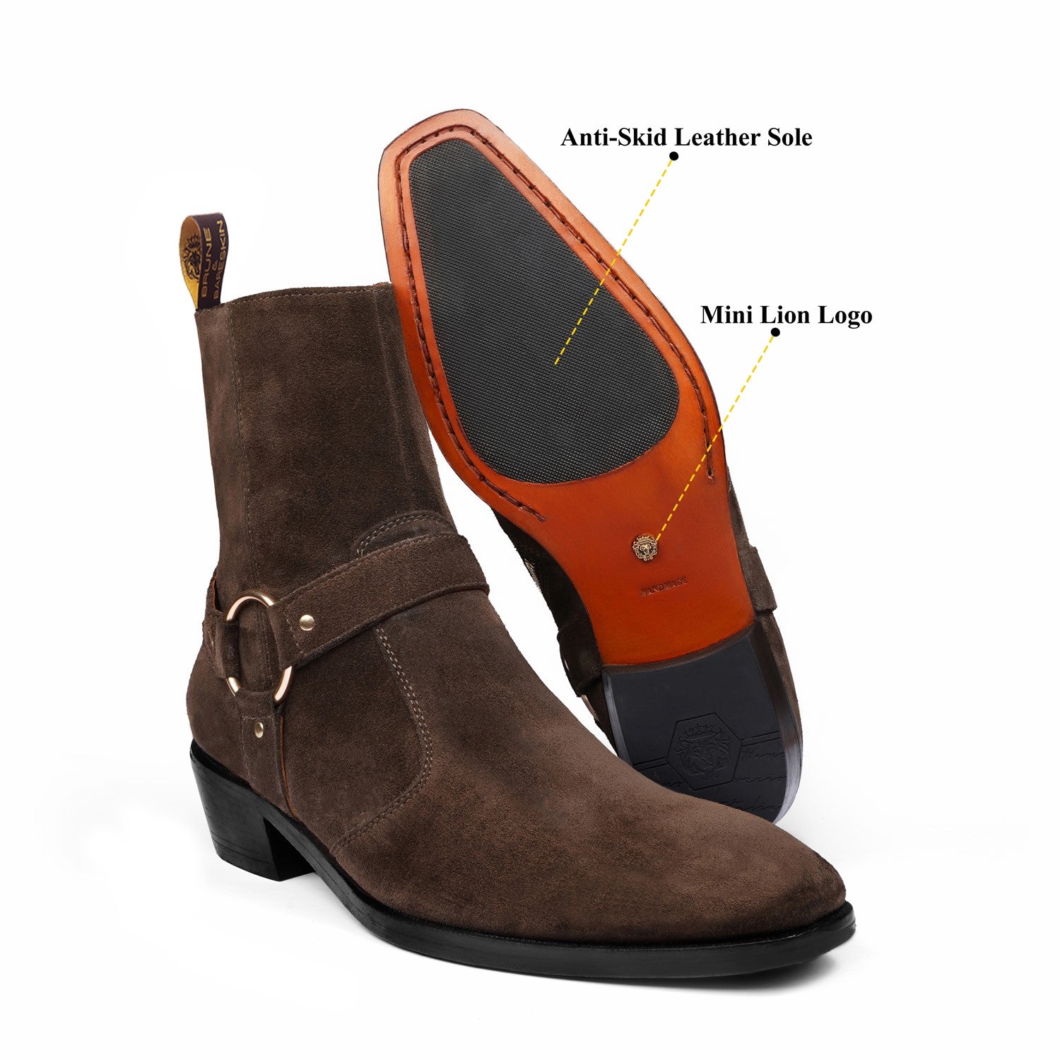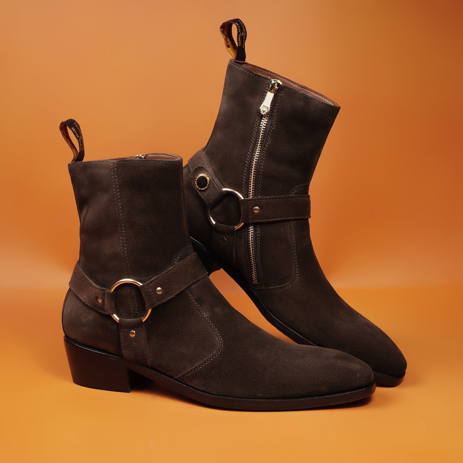 We craft these high ankle Suede leather boots with a perfect Cuban heel to give you an elite look. This shoe can be customized according to your liking. The greater detailing of the Strap and the side zipper closure at the ankles lend a classy look to these Suede formal shoes. The pure leather sole & Cuban heel offers great comfort. Cuban Heel Essentially, it is a straight, medium-high heel with a slightly curved back. This is one of a kind boot with a perfect Cuban heel. They are easy to team with formal trousers as they blend well with the classic fabrics as well as the modern blended synthetic fabric pants, slacks and trousers.