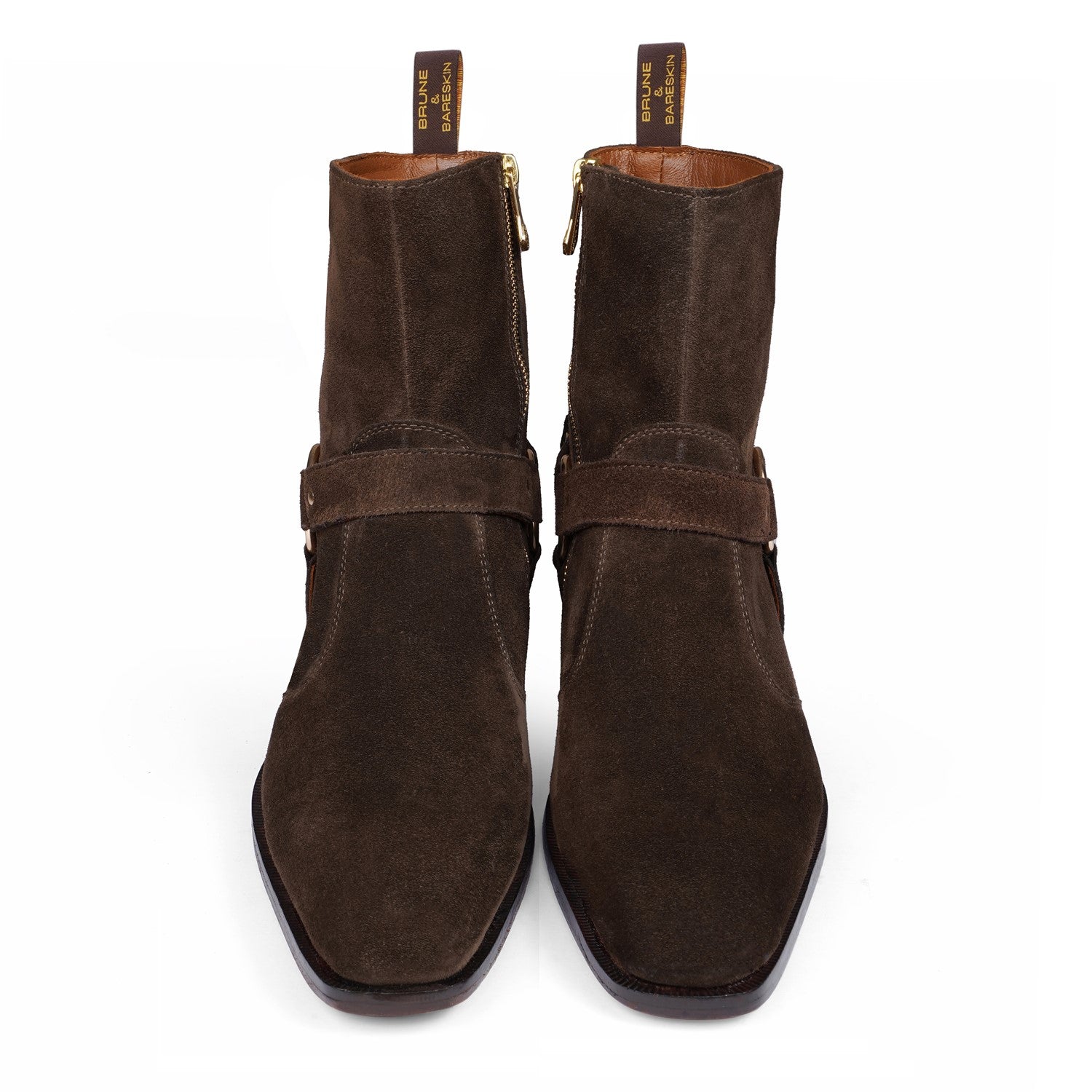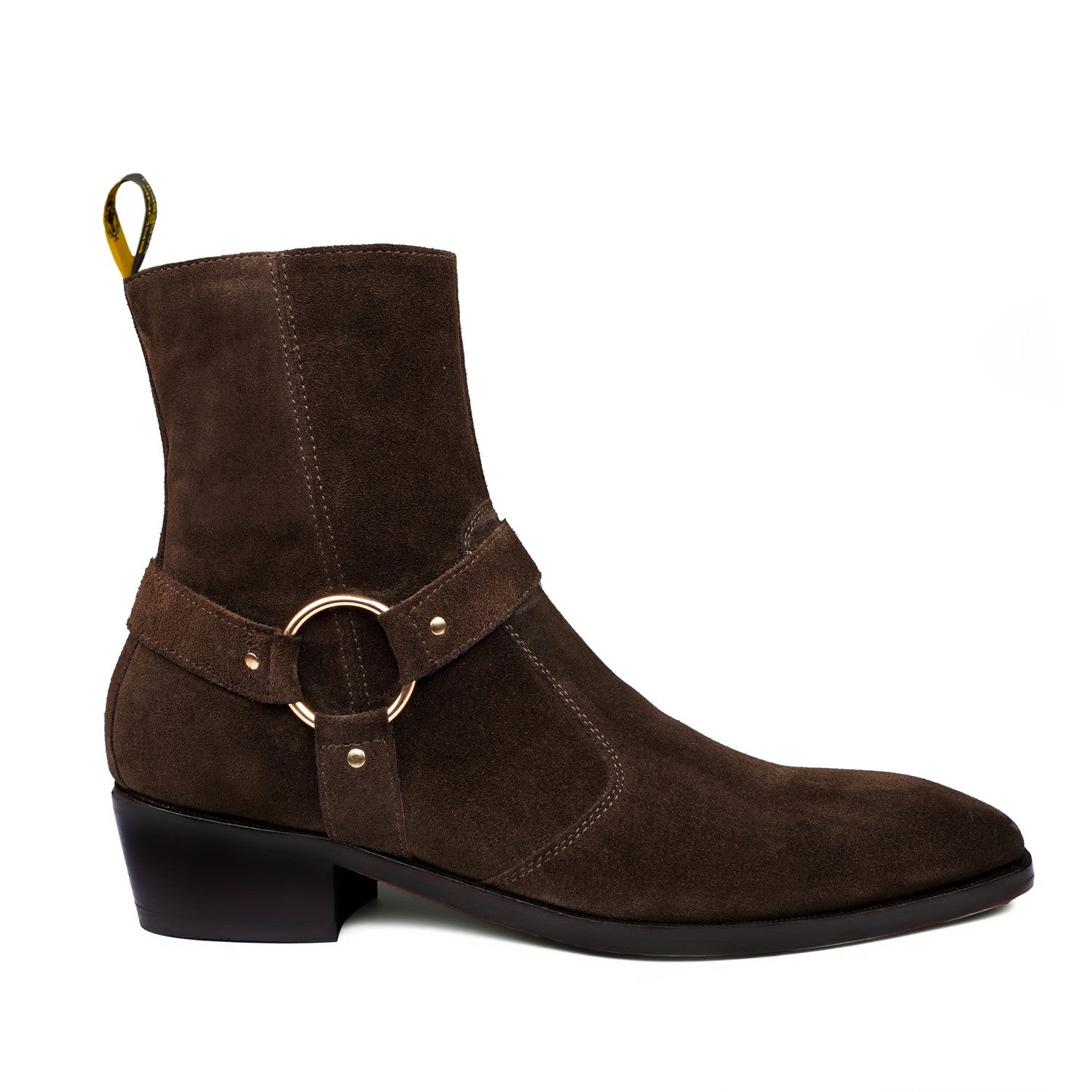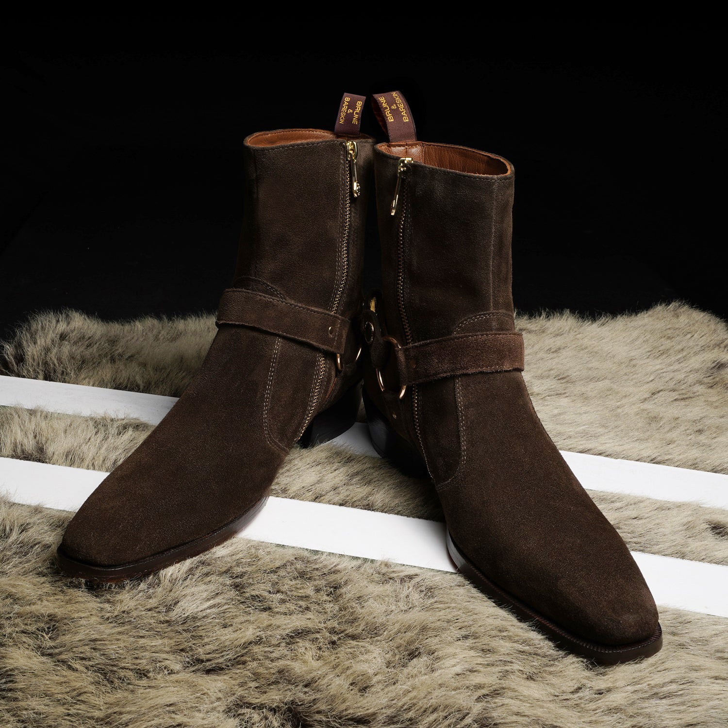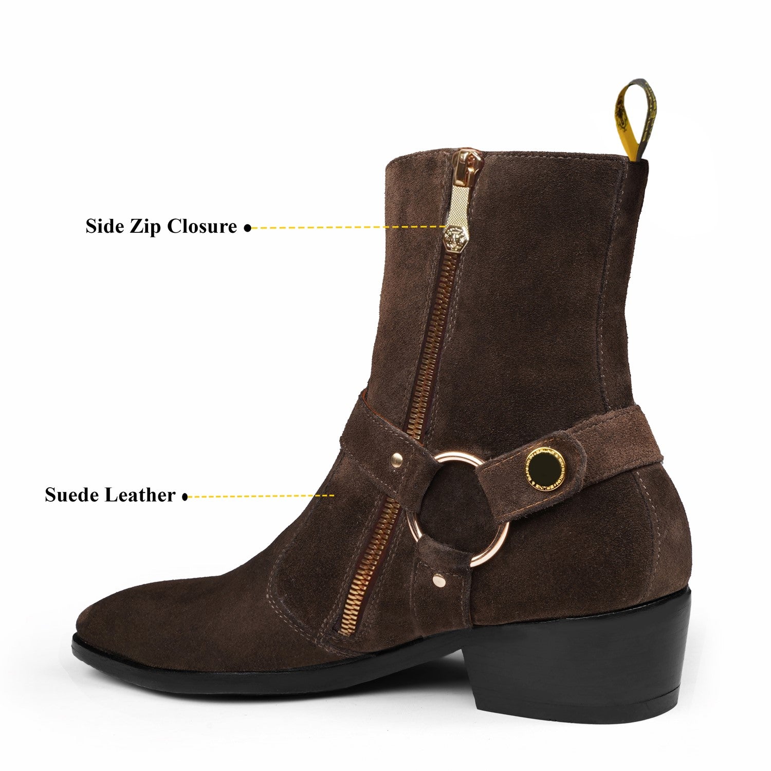 We craft these high ankle Suede leather boots with a perfect Cuban heel to give you an elite look. This shoe can be customized according to your liking. The greater detailing of the Strap and the side zipper closure at the ankles lend a classy look to these Suede formal shoes. The pure leather sole & Cuban heel offers great comfort. Cuban Heel Essentially, it is a straight, medium-high heel with a slightly curved back. This is one of a kind boot with a perfect Cuban heel. They are easy to team with formal trousers as they blend well with the classic fabrics as well as the modern blended synthetic fabric pants, slacks and trousers.