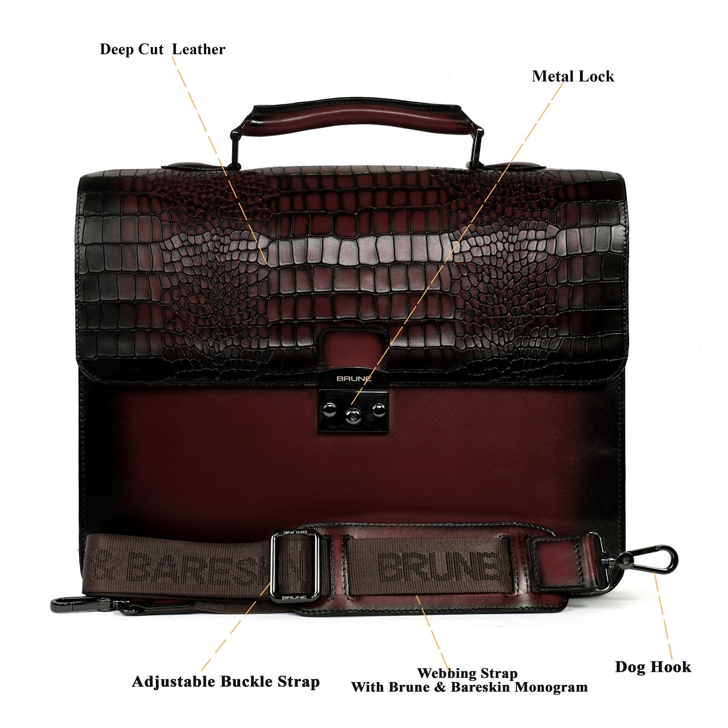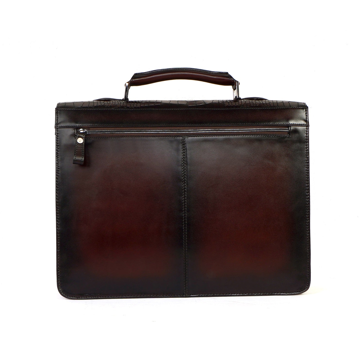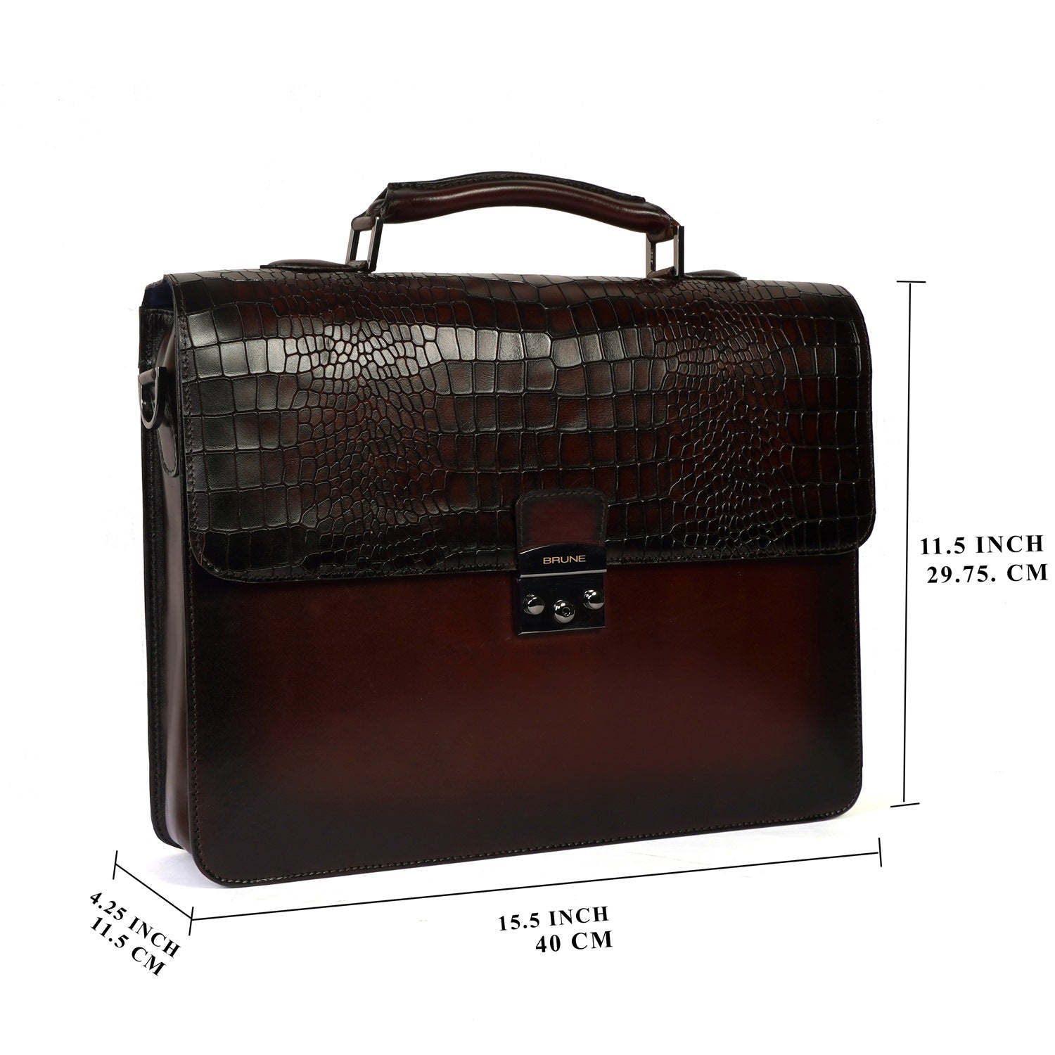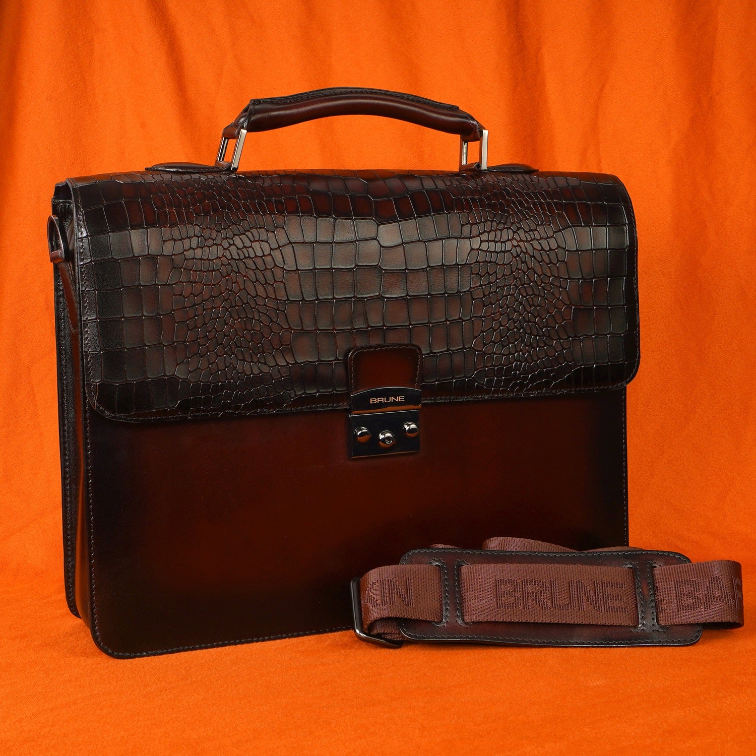Dark Brown Deep Cut Croco Leather Laptop Briefcase