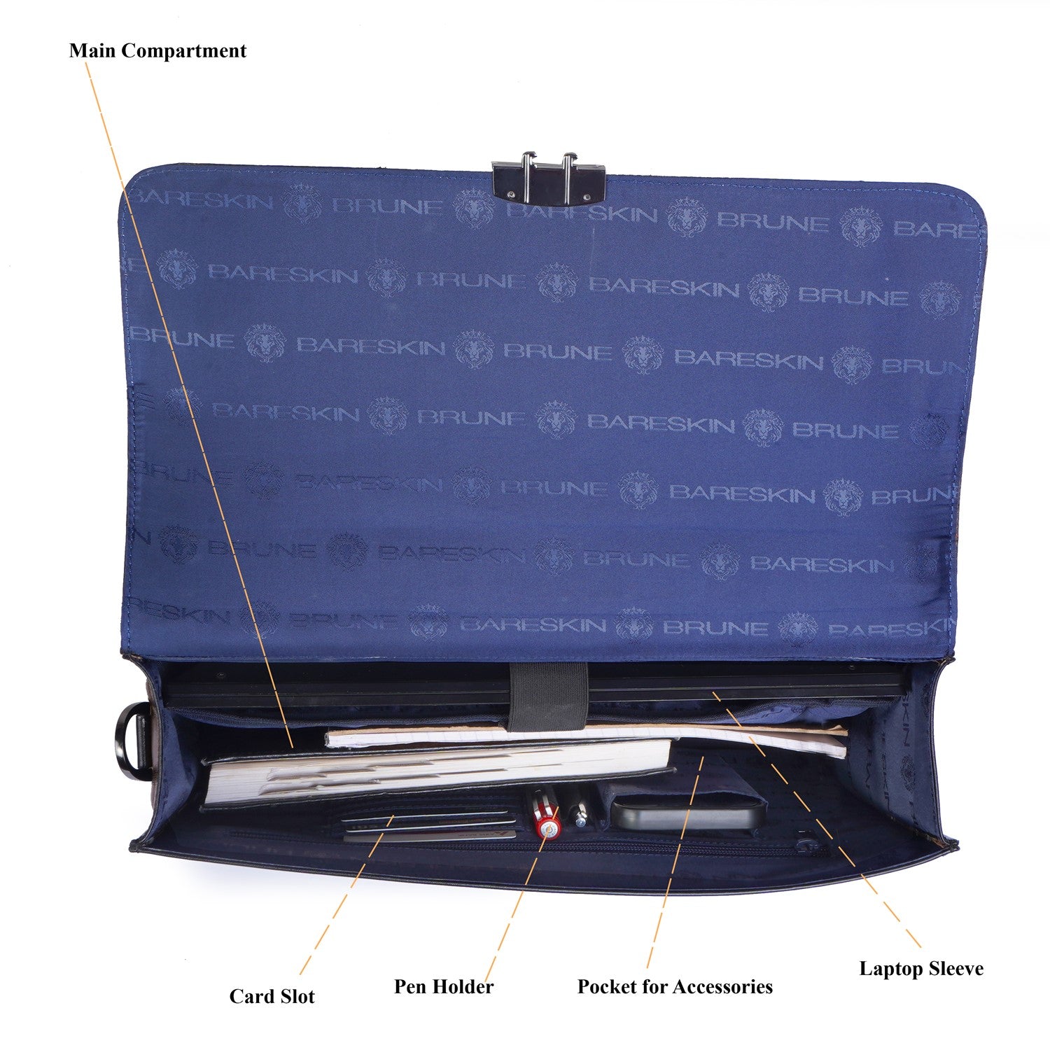 The dark brown laptop Briefcase by Brune & Bareskin adds a touch of sophistication to your business meetings and travel. Handcrafted from genuine and deep cut croco textured leather, this premium briefcase offers a unique and stylish look, while the durable quality ensures long-lasting use. Stay organized with dedicated pockets for documents, pens, cards, and a padded laptop sleeve, while the gunmetal secured push button flap and backside zipper pockets provide extra security. Complete with a removable shoulder strap and branded monogram, this briefcase makes a perfect impression.