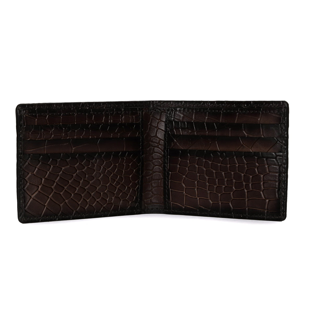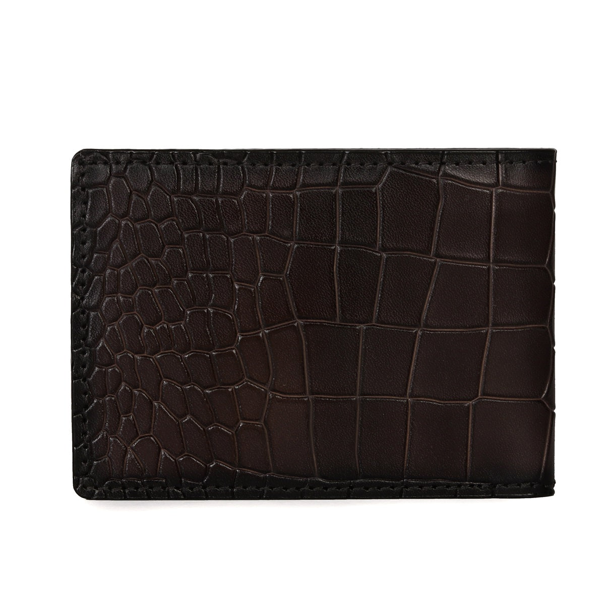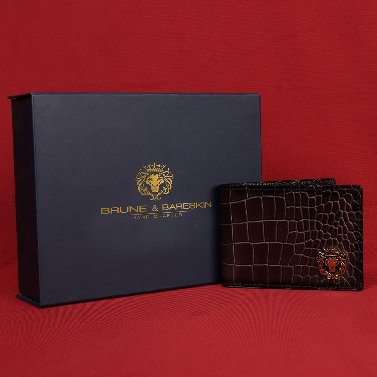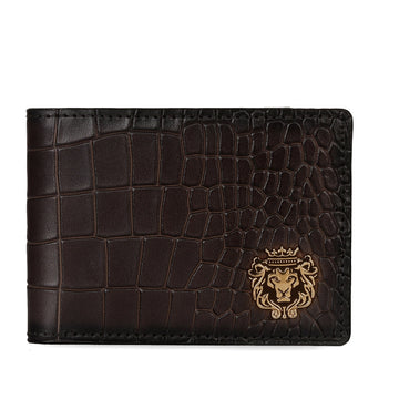 This bi-fold dark brown deep cut croco print leather wallet looks very elegant. The Brune & Bareskin signature metal Lion logo on front side increases the style quotient. Bi-fold wallet features two main pockets along with small secure pocket on both sides. It provides the style and storage with artistic Patina regime leather color shades. 100% pure leather is used for making your style.