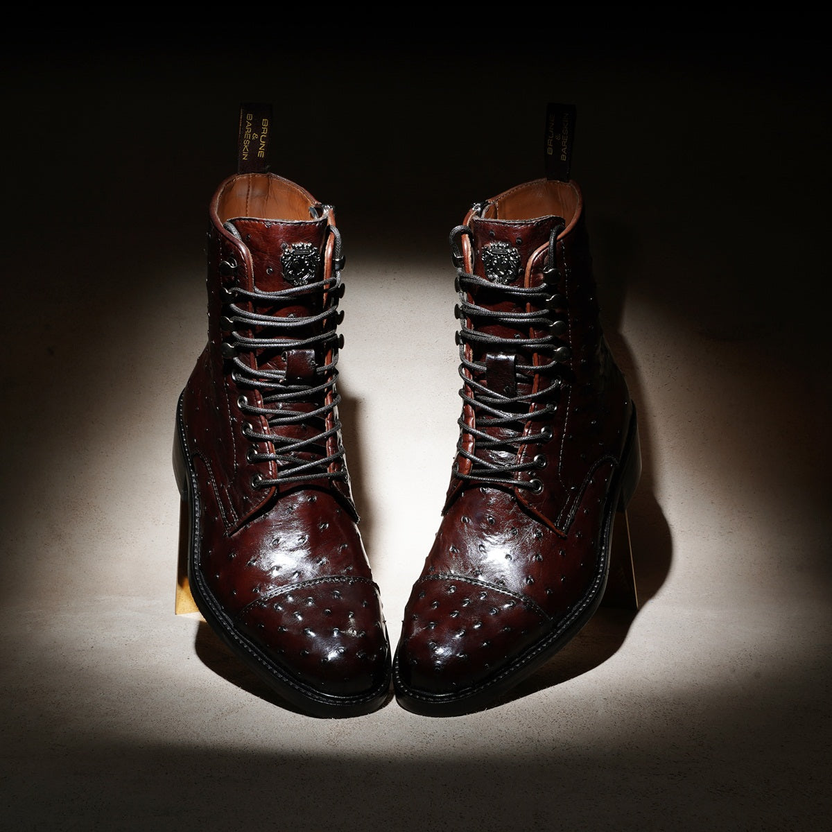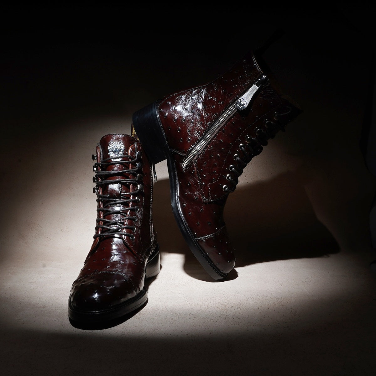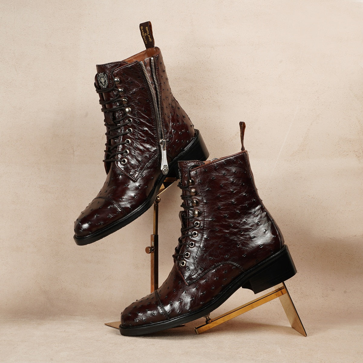 For the modern man who appreciates sophistication, the Dark Brown High Ankle Boot in Exotic Real Ostrich Leather is the ultimate choice. These formal boots make a dashing statement. Designed with a luxurious dark brown color, this boot is crafted from high-quality ostrich leather for durability and longevity. Featuring a derby lace-up closure and an inner side zipper closure for easy on and off, it is completed with a metal lion logo and laser detailing on the leather sole for a unique and luxurious finish. Ideal for special occasions, these boots will add an elegant touch to your outfit.