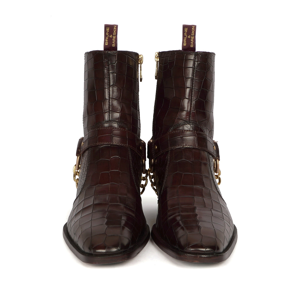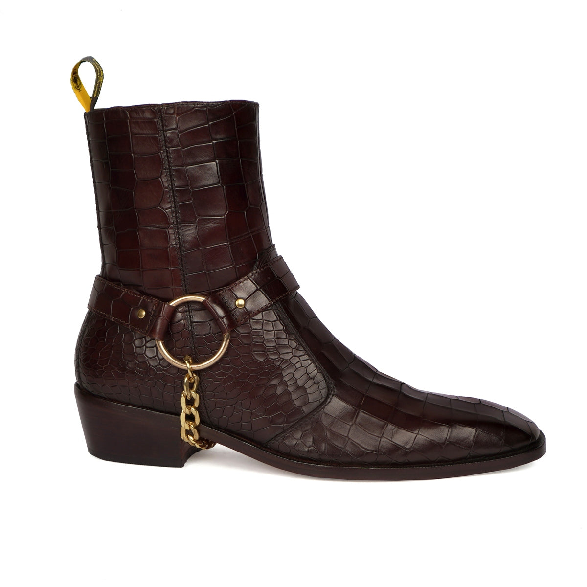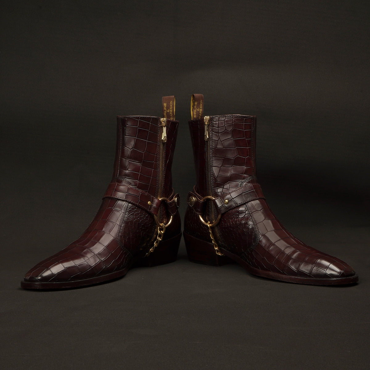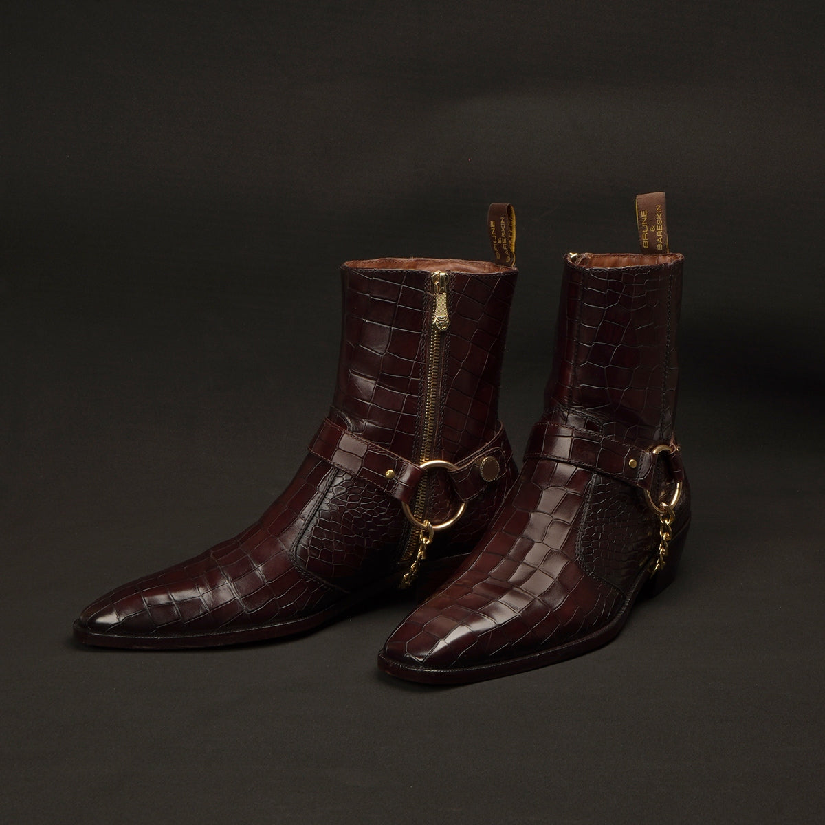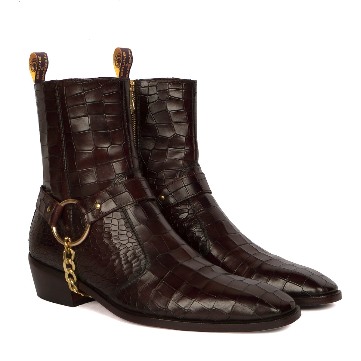 We craft these high ankle dark brown leather boots to give you an elite look. The greater detailing of the golden chain and the side zipper closure at the ankles lend a classy look to these leather formal shoes. Fixed Stylish buckles Straps around the ankle take care of the appropriate fit and comfort. These deep cut croco print genuine leather ankle-length shoes are fitted to emphasize the size and shape of your feet to perfection. These boots provide the distinct and sassy look. They are easy to team with formal trousers as they blend well with the classic fabrics as well as the modern blended synthetic fabric pants, slacks and trousers. The leather sole adds the extra elegance to it. You can customize this chic boots in any of your favorite color with our bespoke services.
