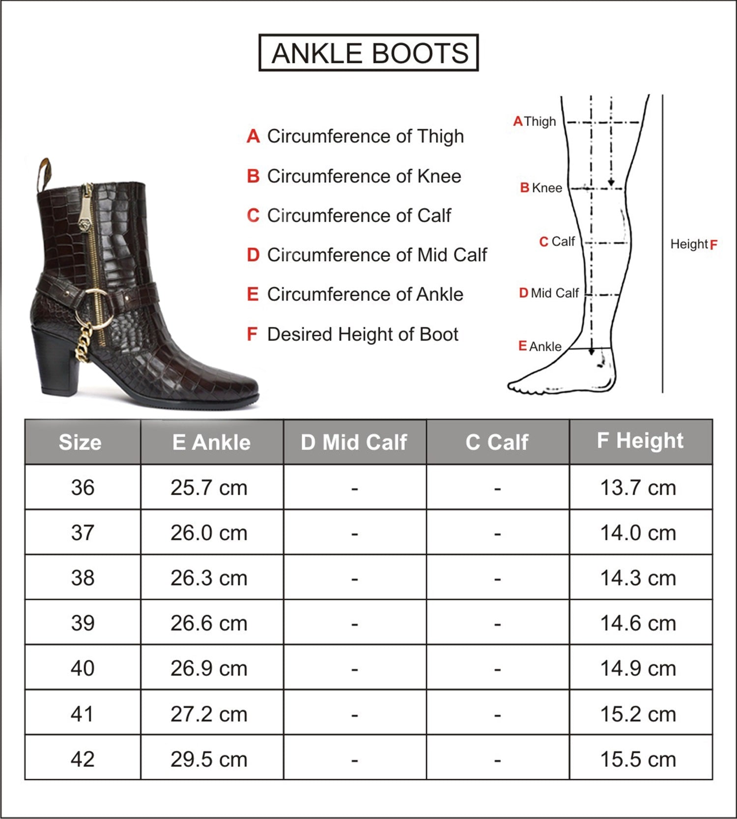 Elevate your style with these luxurious Dark Brown Ladies Boots. Hand crafted with a deep cut croco textured leather and patina finish, these high ankle boots exude a classy formal look. The side zipper closure and inner side stitched elastic pocket provide a streamlined appearance. Highlighting the elegance is the removable Stylish buckles Straps with a circular ring buckle and gold finish chain detail. The 73mm high raise blocked heel and anti skid sole add comfort and sophistication. The perfect gift for the fashion forward lady in your life. You can customize this chic boots in any of your favorite color with our bespoke services.