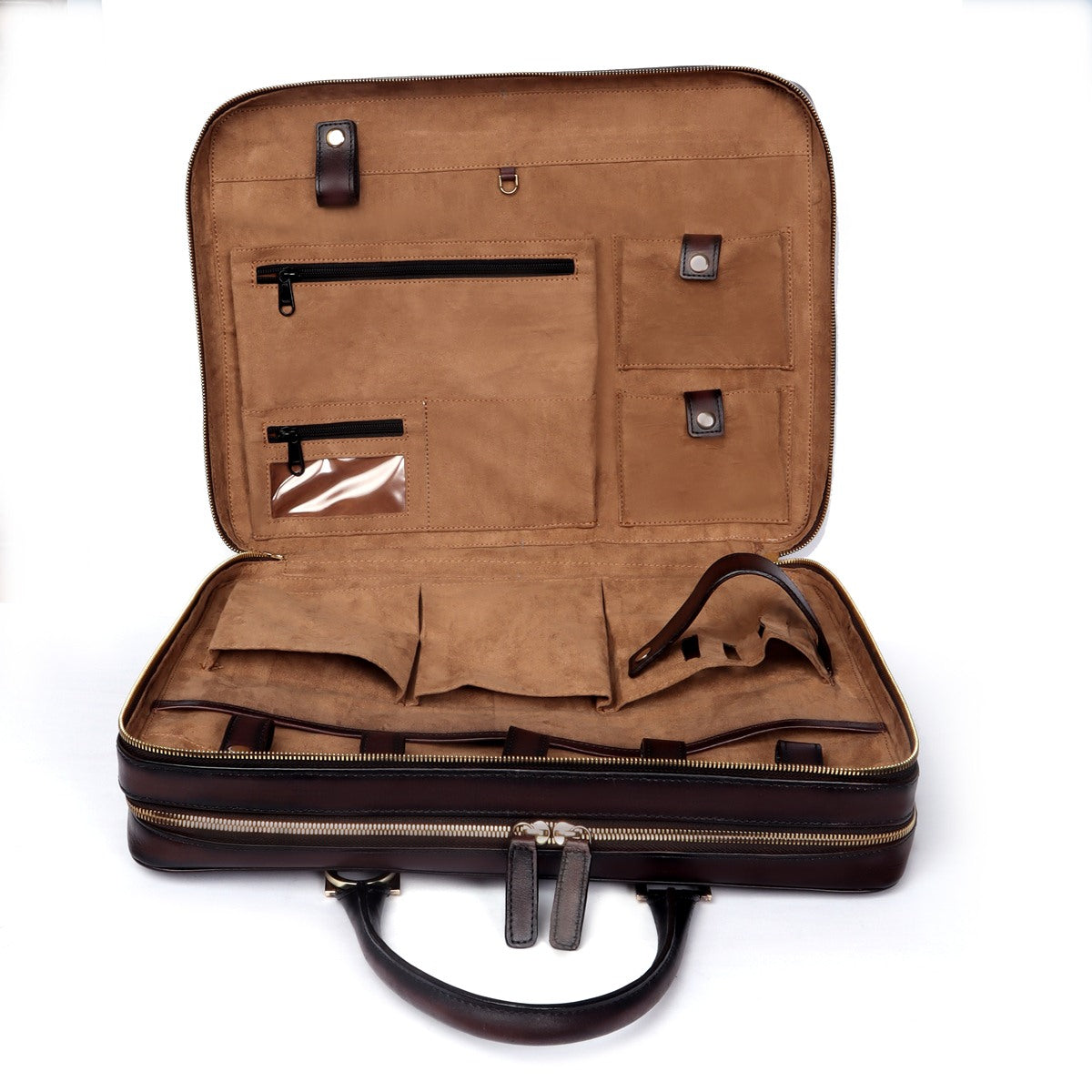 The Dark Brown Italian leather office laptop briefcase provides the perfect gentleman look. The embossed lion logo on this sleek bag makes it more elegant. It has a dedicated laptop sleeve inside with the ultra soft lining. It has a dedicated suitcase opening organizer compartment with multiple pockets. It is a perfect office bag in today's fast pace life. The adjustable shoulder strap connects and removes easily with the hidden hardware loops. You can carry it easily with perfect size carry handles. The roller bag sleeve at the back helps to attach this to trolley bag while traveling.