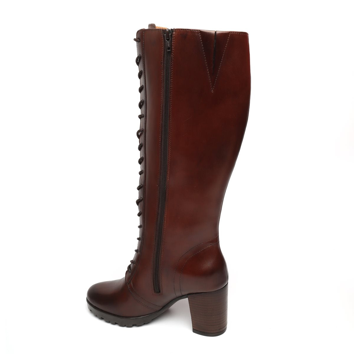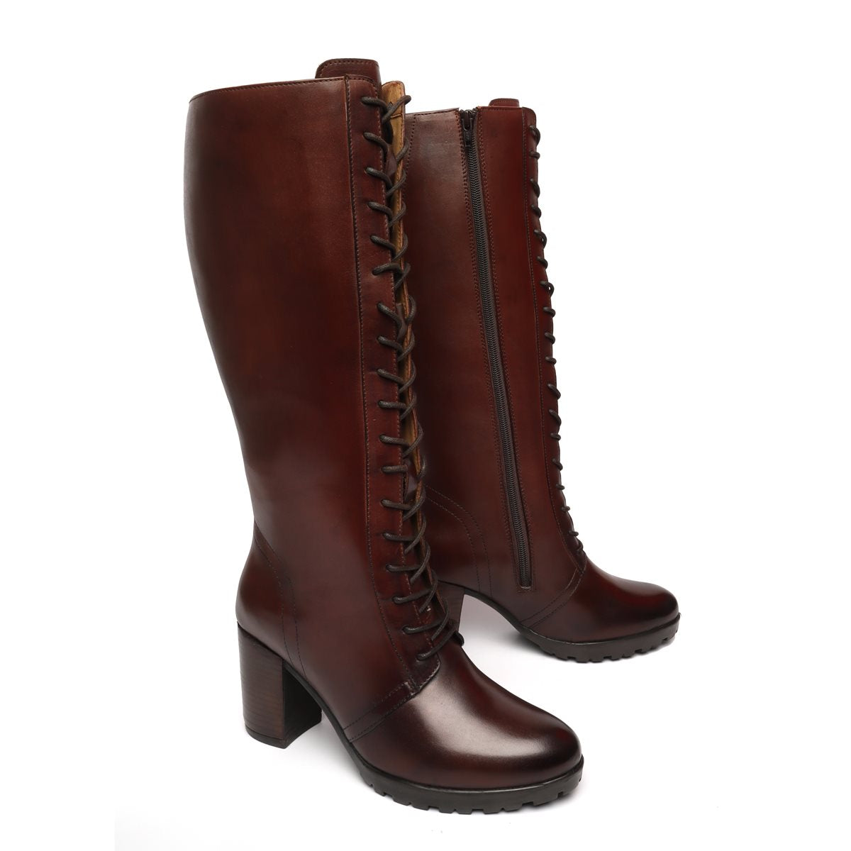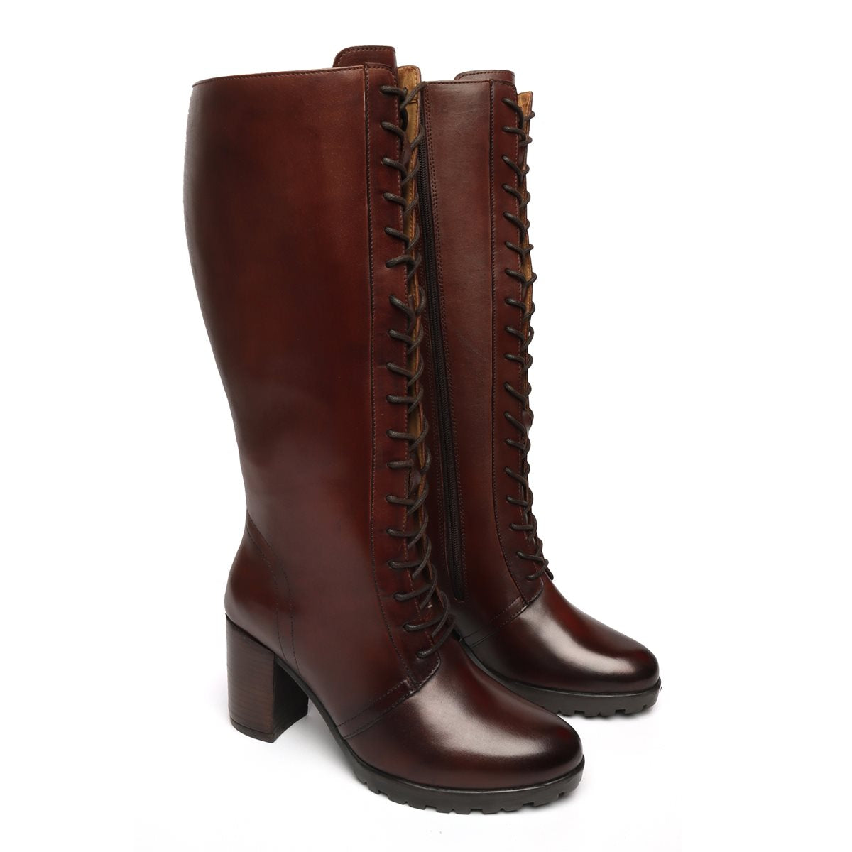 These genuine leather knee height lace up ladies boots are perfect to keep your fashion stand above from the crowd. Rounded toe and high rise block heel provide elegance to the look. Side zipper fastening along with adjustable laces take care the appropriate fit and comfort. Match these stylish knee high boots with chic Jeans and leather jacket for your next party.
