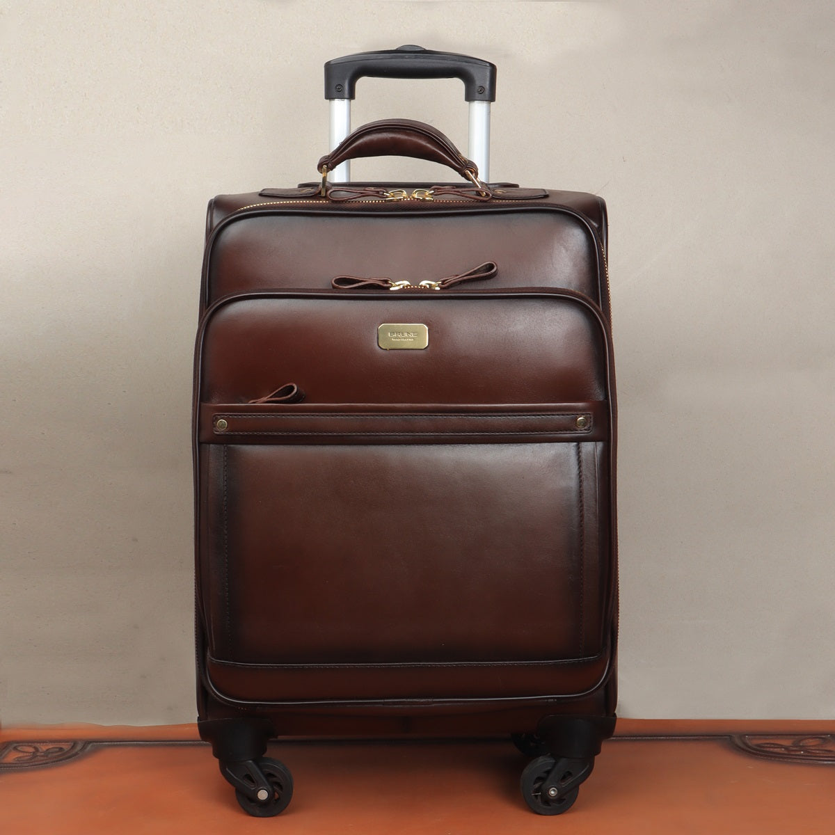 A good traveler has no fixed plans, but has good trolley bag. The perfect travel companion for getting off on a city break, Brune & Bareskin's roll-along Cabin Case is handmade from the finest quality leather and luxuriously lined with Up to 15" Laptop Sleeve. The spacious interior which opens with a smooth 3 zipper features pockets at the front and has spacious briefcase opening to carry cloths & other stuff. Moreover, multi pockets are there to keep all your travel essentials, whilst the exterior boasts a handy slip in pocket perfect for those last minute airport purchases. The foldaway telescopic handle is tucked away in a neat compartment and the integral quad wheels are discreetly placed at the bottom, which stands the case in all its glory. You can customize this further in your favorite color and also add the name initials.