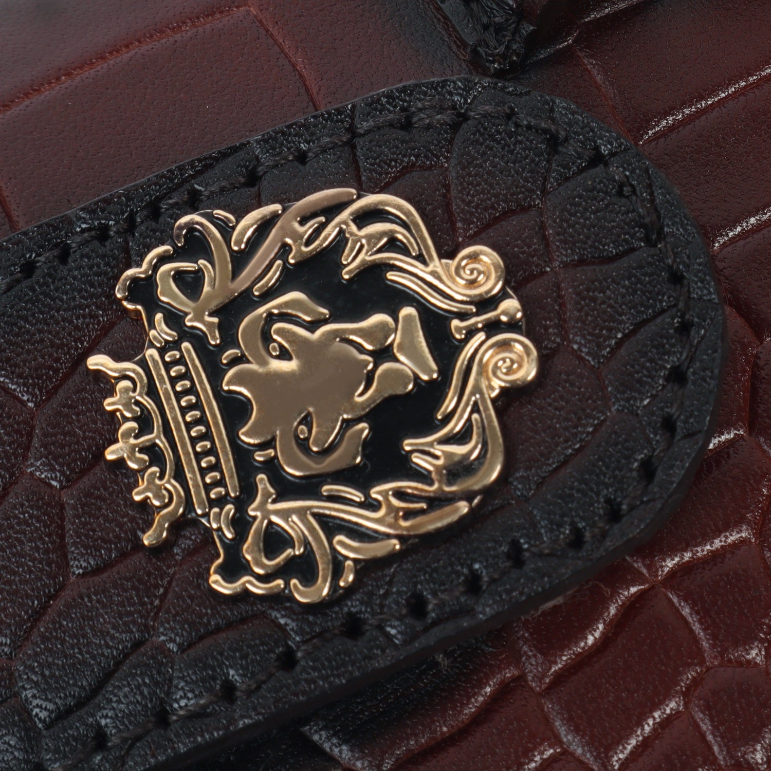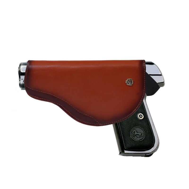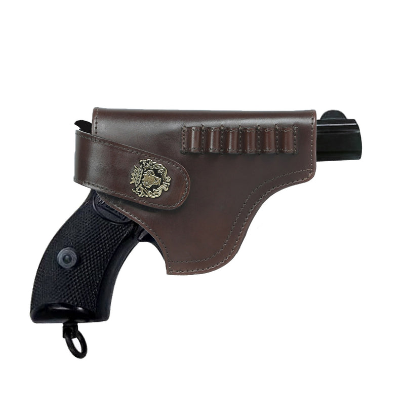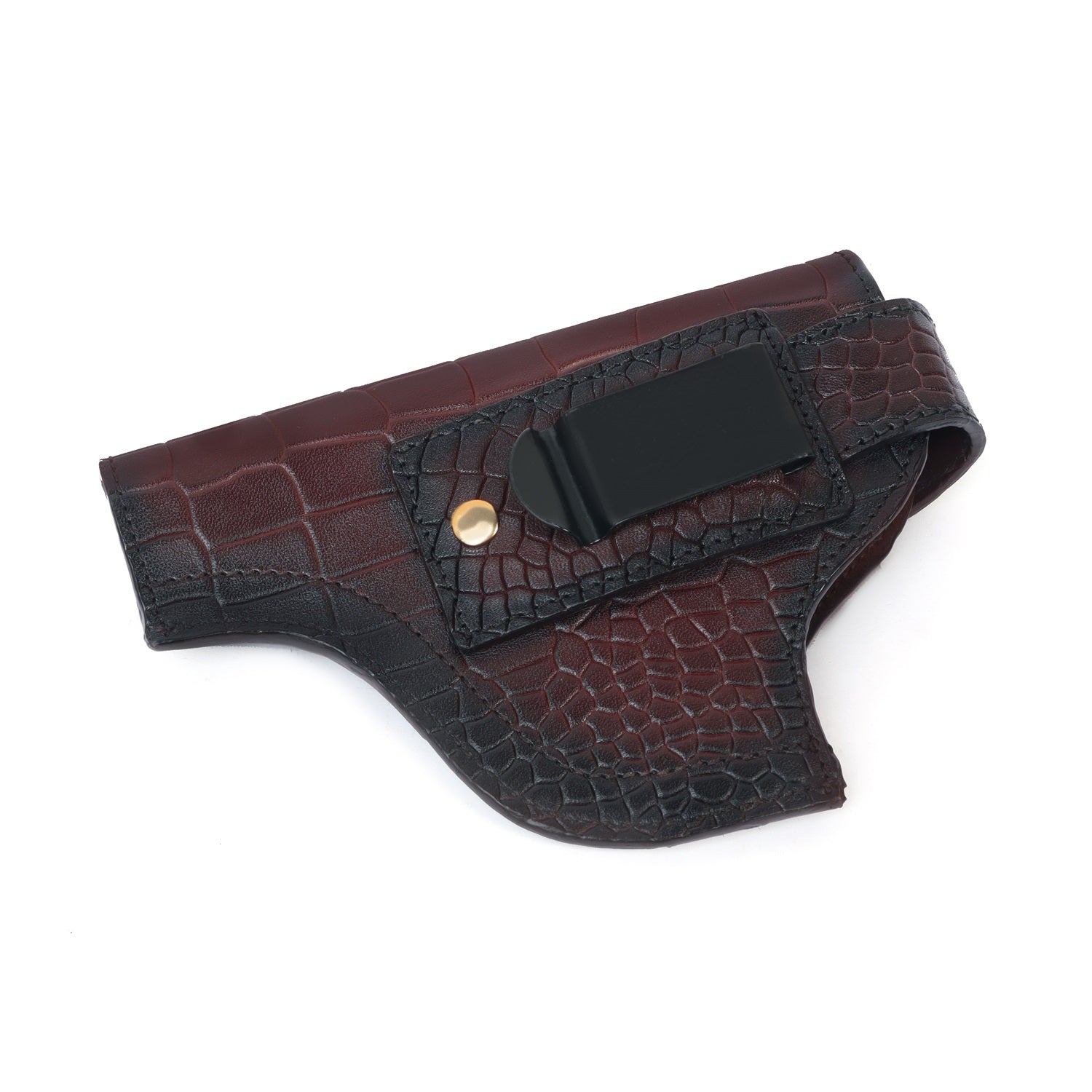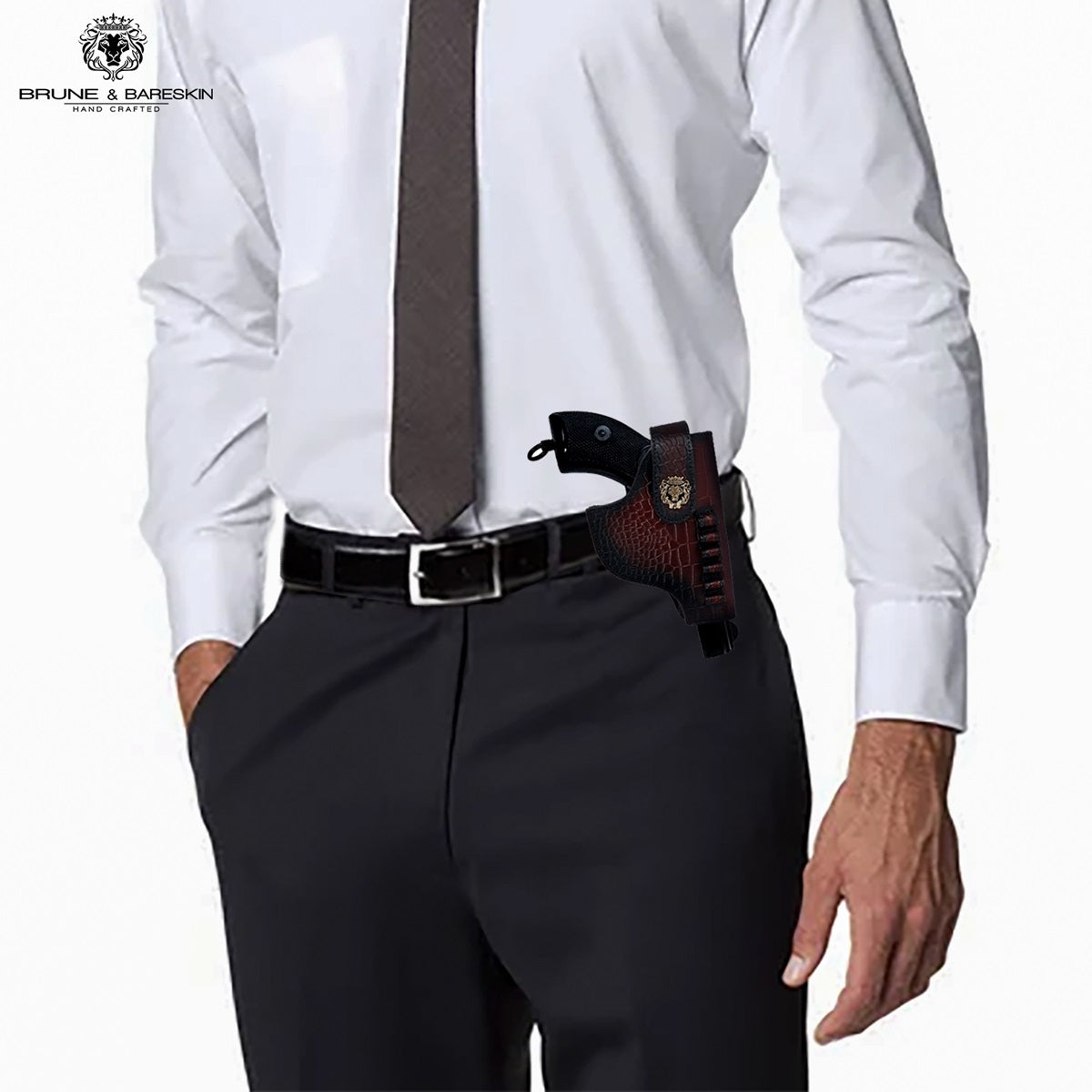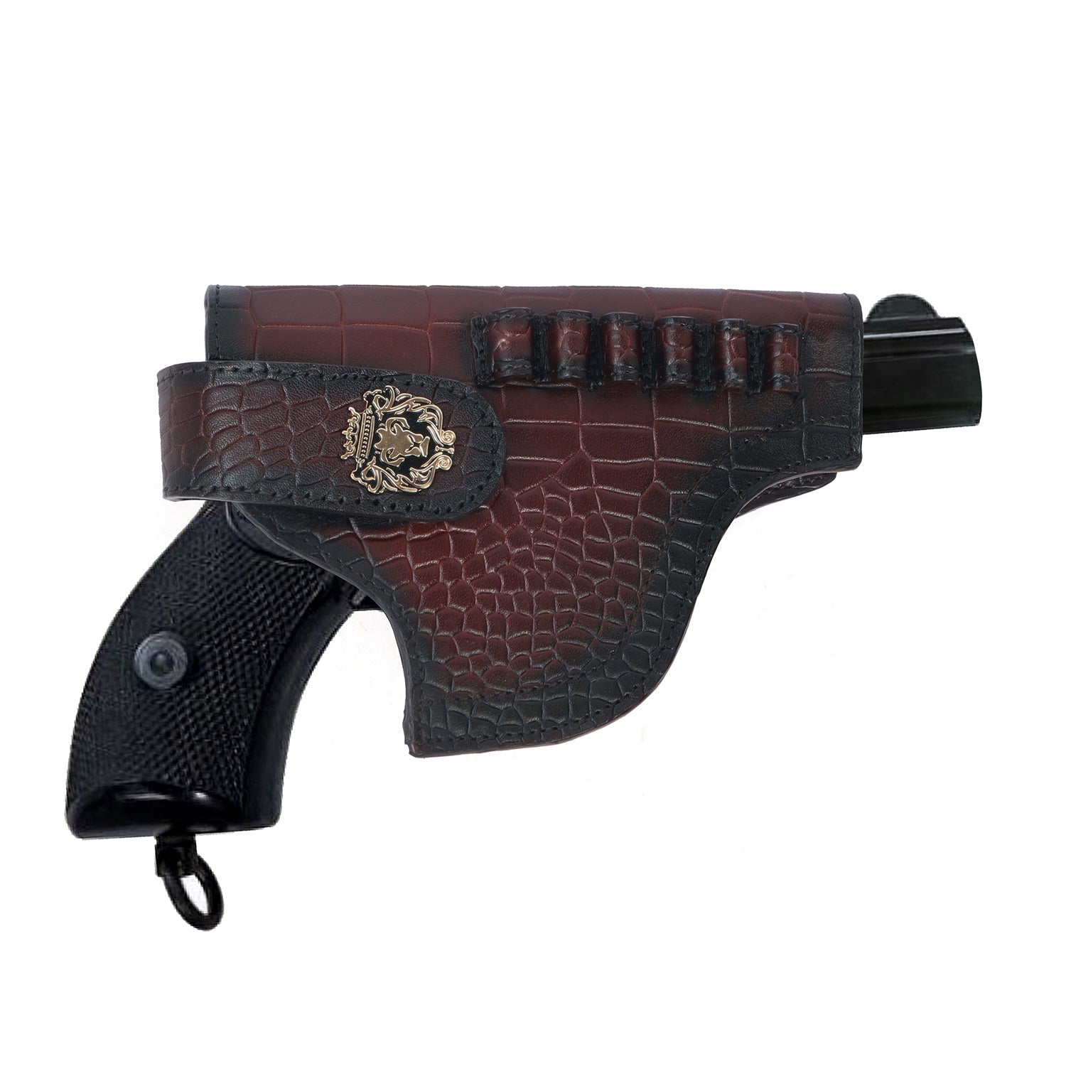It's super stylish & elegant revolver cover by BRUNE & BARESKIN. Made of Deep cut croco leather in dark brown color. This particular sku is specific to .32 revolver. Inidan or imported . Fits perfect on WEBLEY and Indian ordinance revolver. Bullet's holders are crafted to provide the easy access to the bullets & hold them safely. Brune & Bareskin's signature metal lion logo on wide Velcro strap is added to enhance the elegance further. It gives classy look to a person when some one holds it. These can be customized to any size weapon .22, .32, .38, 9mm and .45 revolver. We offer name Initials and other personalization like color change , laser engraving of logos or slogans. For this please write to us by choosing the "customization tab"