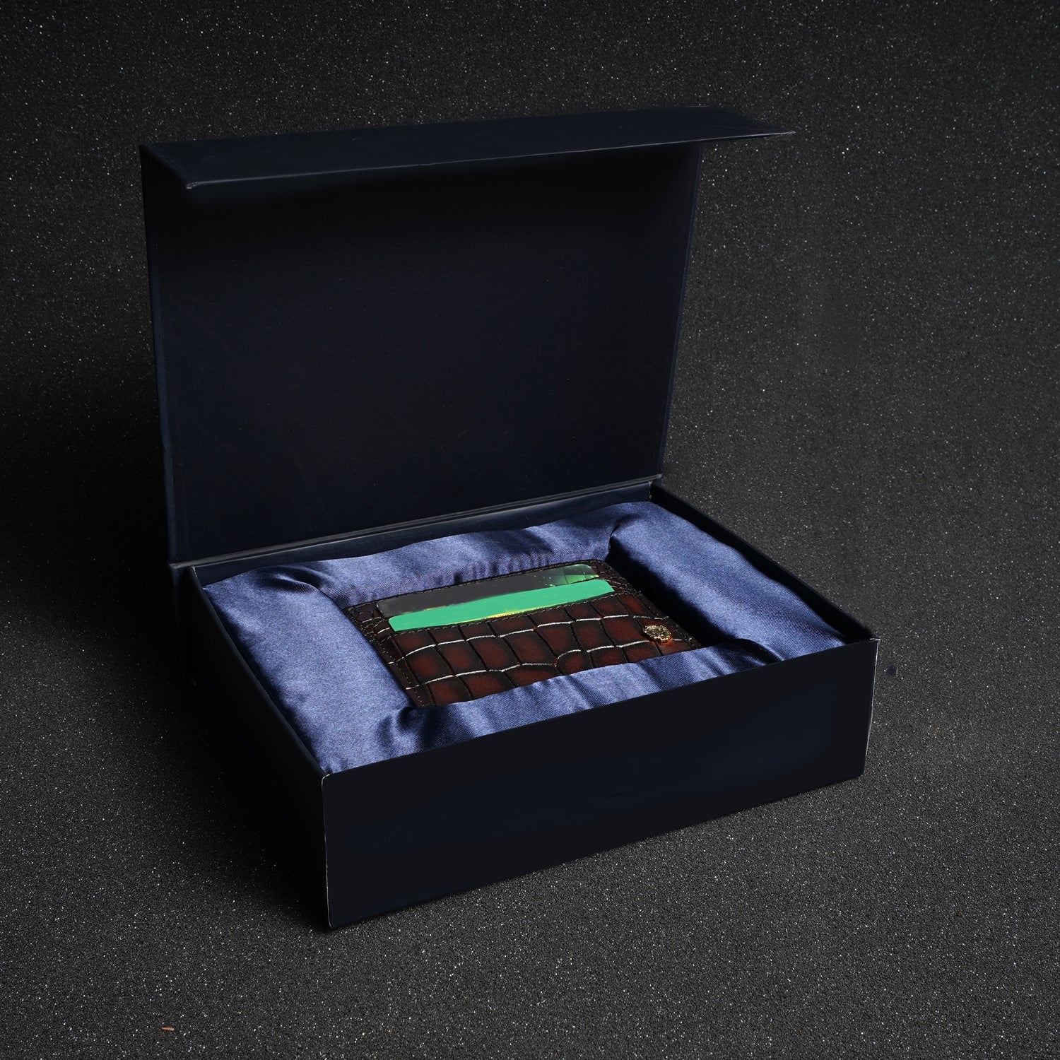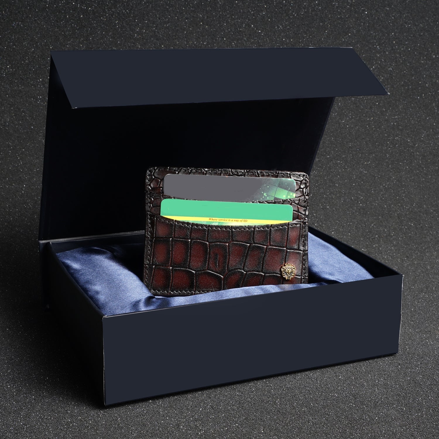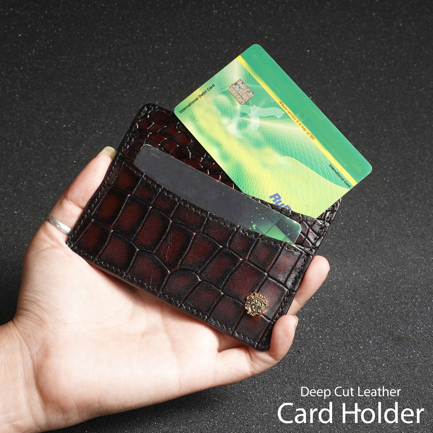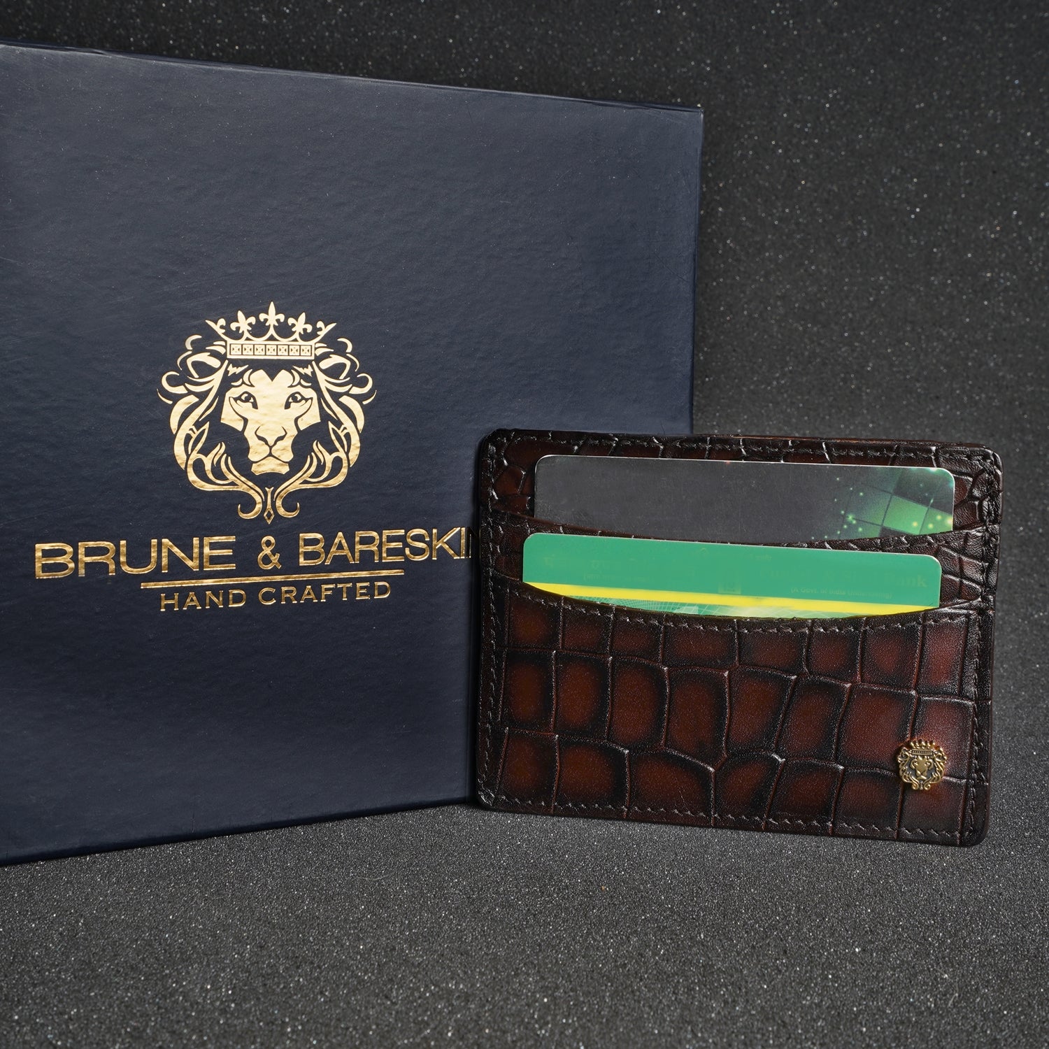 Smokey Patina Finish Card Holder in Dark Brown Deep Cut Croco Textured Leather by Brune & Bareskin